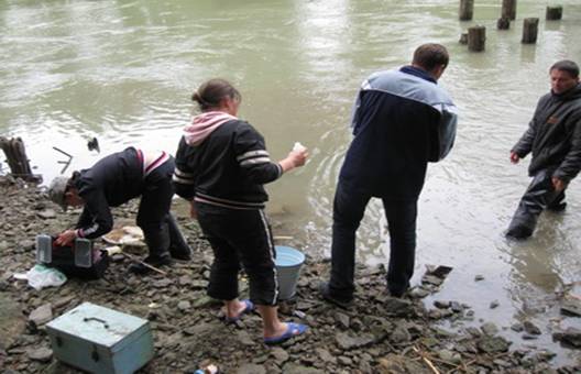 Foto 2. Prelevarea mostrelor de apă Au fost prelevate multiple probe de apă în aval și amonte de localități, la confluența cu afluentii râului, în preajma surselor de poluare înregistrate în bazinul râului, efectuate măsurători de debit și nivel al râului, evidențierea pragurilor și locurilor în față, determinarea adâncimilor cu fixarea coordonatelor geografice la toate tipurile de măsurători, descrierea geomorfologică și pesagistică în aria râului, precum și descrise multiple specii de păsări, ce cuibăresc și viețuiesc în bazinul râului. Investigațiile hidrologice au inclus măsurători de nivel, de debit al apei, aluviunilor în suspensie, observații asupra temperaturii apei, etc. Datele hidrologice căpătate după o prelucrare și analiză minuțioasă vor fi incluse în „Anuarul Hidrologic pentru a. 2011” și ,,Cadastrul de Stat al Apelor pentru a.2011", informația cărora este utilizată pentru planificarea și aplicarea măsurilor de prevenire a fenomenelor periculoase și de risc și de ocrotire a mediului înconjurător. Investigațiile privind calitatea apei în bazinul r.Prut s-au realizat prin colectarea probelor de apă în 14 secțiuni ale r.Prut și în gura de vărsare a principalilor afluenți ai săi, care, ulterior, în condiții de laborator au fost supuse investigațiilor după 49 indicatori de calitate, specificați în câteva grupe generale: parametrii fizico-chimici, elementele biogene, poluanții specifici, elementele hidrobiologice, metalele grele și poluanții organici persistenți (POPs) În urma analizelor detaliate efectuate în laboratoarele Directiei de Monitoring al Calității Mediului a Serviciului Hidrometeorologic de Stat putem observa o concentrație mai mare a poluanților în aval de orașele mari care nu dispun de stații de purificare a apelor reziduale și la confluența cu afluenții râului.