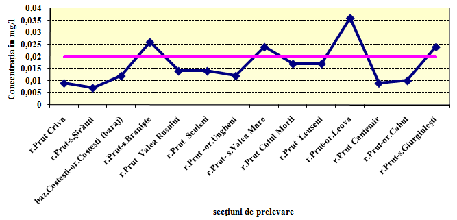 valoarea de 0,13 mg/l (2,6 CMA). În urma estimărilor făcute de specialiștii calificați ai Serviciului Hidrometeorologic de Stat putem concluziona că în componența apei r. Prut predomina poluanții de origine organică proveniți din deversarea apelor reziduale din orașe sau din dejecțiile animaliere aduse în râu de către afluenți. Calitatea necorespunzatoare a apelor curgătoare pe anumite sectoare se datorează poluării cu ape menajere și industriale neepurate sau insuficient epurate, depozitării deșeurilor industriale si menajere neconforme, neaplicării codului bunelor practici agricole și poluării istorice. Din sinteza datelor obținute în urma analizelor probelor prelevate pe parcursul expediției putem evidenția o tendință a schimbării calității apei r. Prut în spațiu. Pe tot cursul său pe teritoriul Moldovei observăm o creștere a concentrațiilor pe măsura înaintării râului de la Nord la Sud. În probele prelevate în cadrul expediției, au fost înregistrate cantități restante de pesticide pentru DDT, DDE, DDD, HCH-α, β, γ mai mici ca limita minimă de detecție în mai toate secțiunile monitorizate.