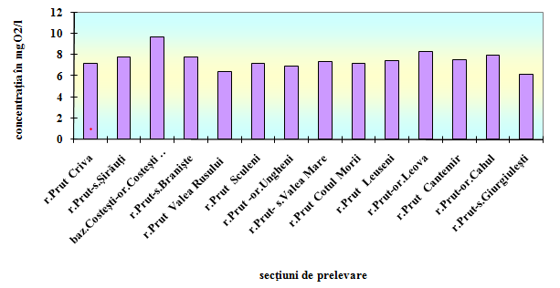 Fig.4. Variația concentrației oxigenului dizolvat în r. Prut, de la Criva pâna la Giurgiulești