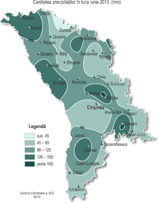Cantitatea precipitaţiilor în luna iunie 2013 (mm).