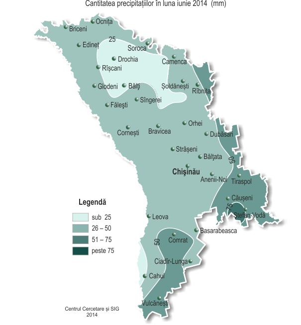 Pe parcursul lunii iunie precipitaţiile preponderent au avut caracter de aversă și au căzut neuniform în teritoriu. Suma precipitațiilor pe parcursul lunii pe 80% din teritoriu în fond a constituit 17-45 mm (20-60% din normă), izolat, preponderent în sudul țării – 50-75 mm (75-115% din normă).