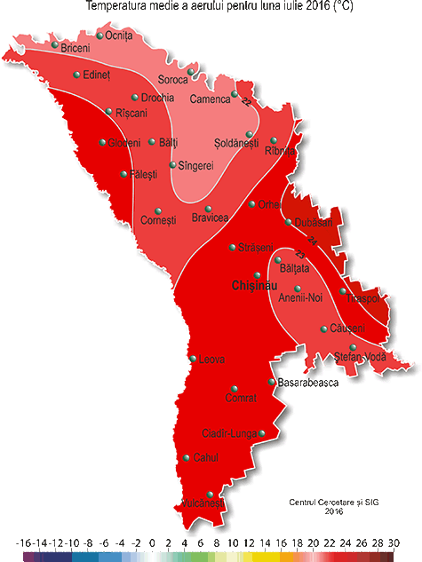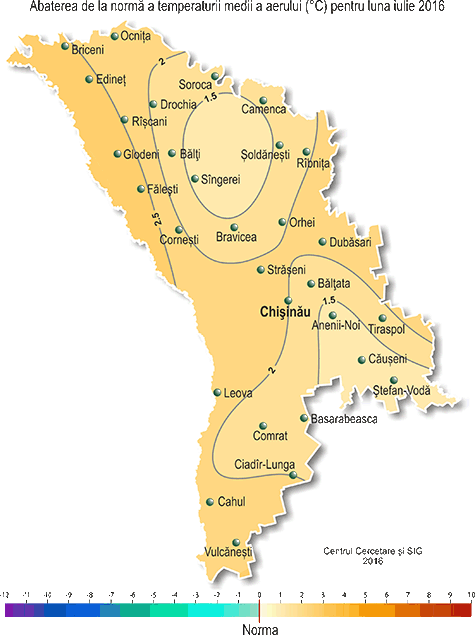 Abaterea de la normă a temperaturii medii a aerului (°Ñ) pentru luna iulie 2016