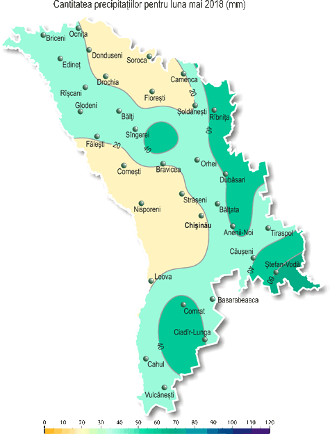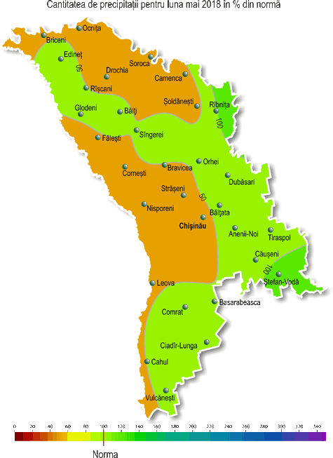 Cantitatea de precipitaţii pentru luna mai 2018 în % din normă.