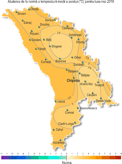 Abaterea de la normă a temperaturii medii a aerului (°Ñ) pentru luna mai 2018.