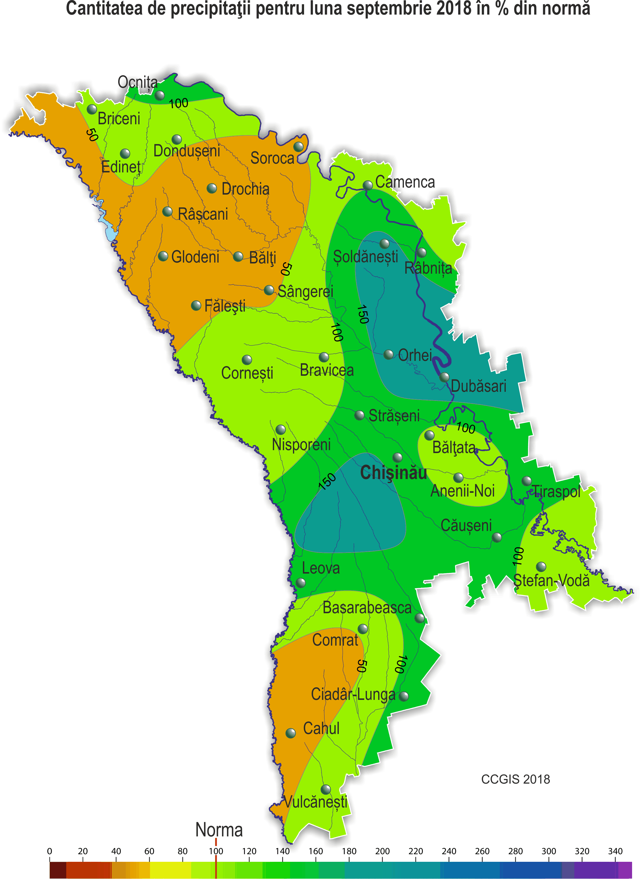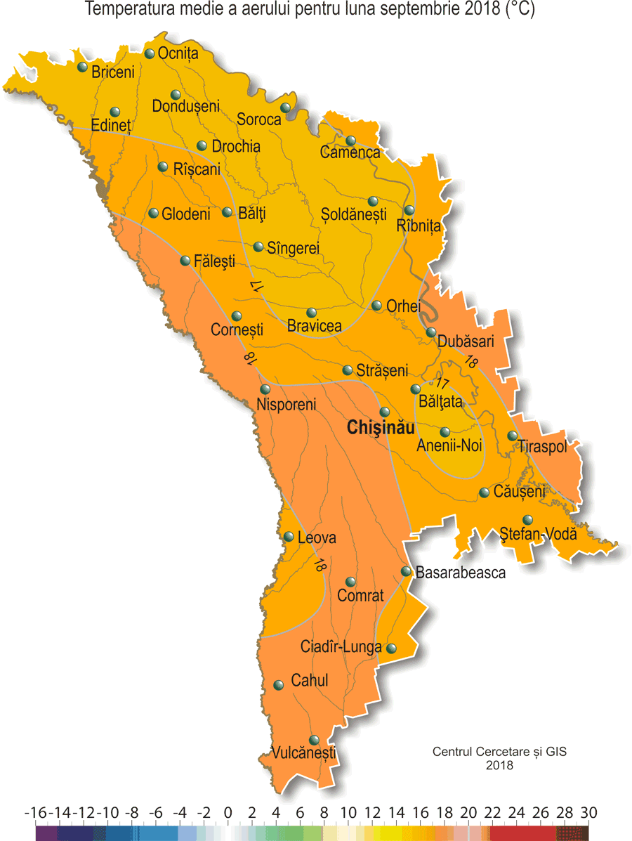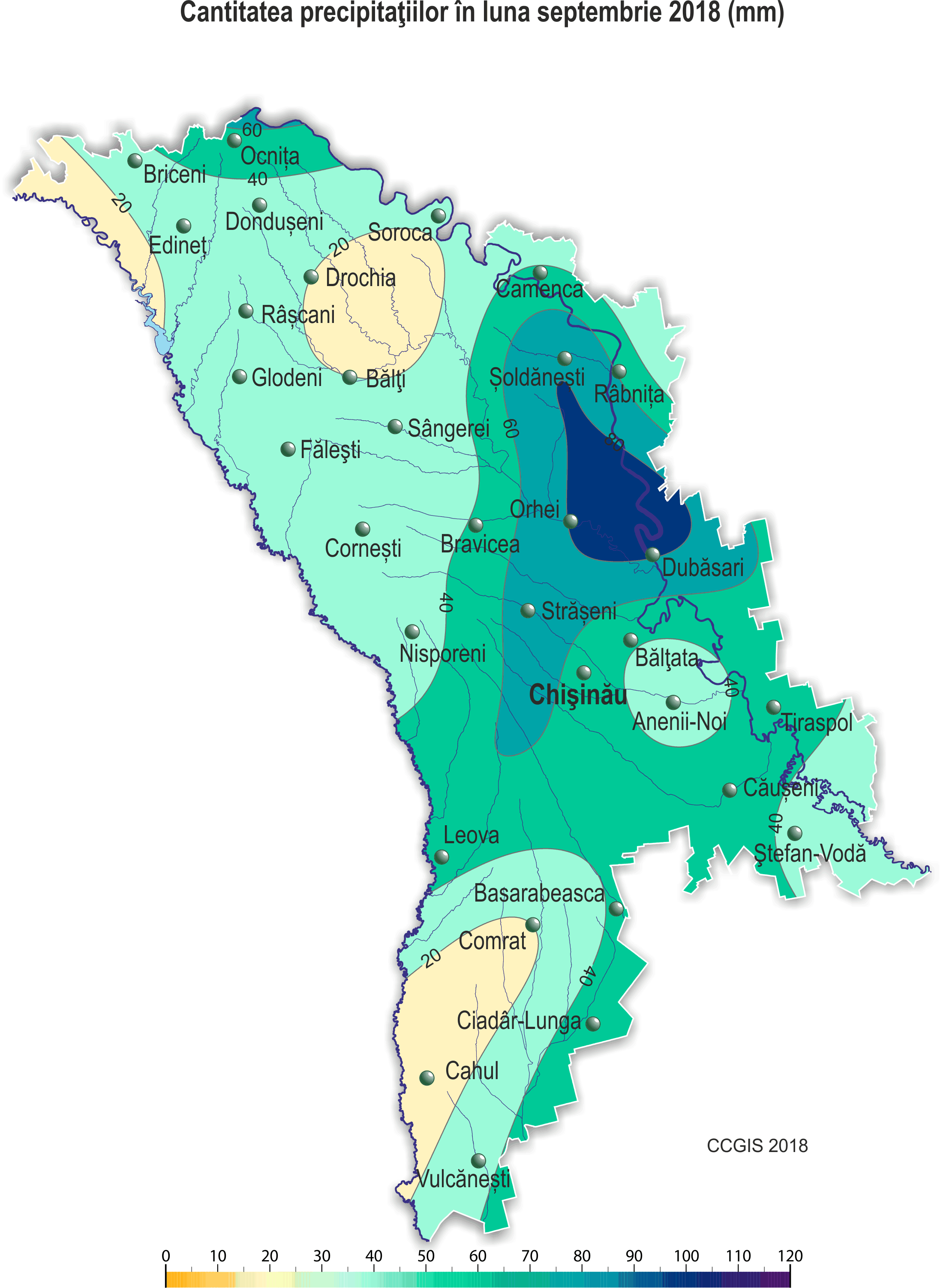 Pe parcursul lunii septembrie pe teritoriul ţării s-a semnalat vreme neomogenă după regimul termic şi cu precipitaţii. Temperatura medie lunară a aerului a fost mai ridicată faţă de valorile normei cu 1,0-2,5ºÑ şi a constituit +16,5..+18,5ºÑ. Temperatura maximă a aerului a urcat în teritoriu până la +35ºÑ (SM Dubăsari, Tiraspol), ceea ce la începutul lunii septembrie se semnalează în medie o dată în 20 ani. Numărul de zile cu temperatură maximă a aerului de +30ºÑ şi mai mult a constituit în teritoriu 2-6 zile, norma fiind de 1-2 zile. Pe 26 septembrie izolat (SM Briceni, Tiraspol) s-au semnalat primele îngheţuri doar la înălţimea de 2 cm de la suprafaţa solului cu intensitatea de -2ºÑ. Pe 27 şi 30 septembrie s-au semnalat îngheţuri la suprafaţa solului şi la 2 cm de la suprafaţa solului cu intensitatea de -1..-5ºÑ, ceea ce se semnalează în această perioadă o dată în 5-10 ani. Primele îngheţuri în aer s-au semnalat pe 27 septembrie izolat (SM Rîbniţa, Bravicea, Codrii, Bălţata, Tiraspol, Ceadîr-Lunga) cu intensitatea de -2ºÑ, ceea ce se semnalează în această perioadă o dată în 10 ani. Trecerea stabila a temperaturii medii a aerului prin valoarea de +15ºÑ în direcţia scăderii ei, fenomen ce determina sfârşitul verii meteorologice, a avut loc în perioada 23-25 septembrie, fiind pe cea mai mare parte a teritoriului ţării în termeni apropiaţi de cei obişnuiţi, în raioanele din nordul ţării – cu 5-10 zile mai târziu faţă de datele medii multianuale. Cantitatea precipitaţiilor căzute pe parcursul lunii pe 55% din teritoriu a constituit în fond 35-60 mm (75-130% din normă). Cea mai mare cantitate de precipitaţii a căzut în regiunea PAM Şoldăneşti – 77 mm (160% din normă), SM Dubăsari – 81mm (200% din normă). În restul teritoriului suma precipitaţiilor s-a egalat cu 15-30 mm (30-60% din normă). Condiţiile meteorologice pe parcursul lunii au fost în general satisfăcătoare pentru coacerea culturilor pomicole şi acumularea zahărului la struguri. Ploile căzute la începutul lunii, izolat puternice, au completat rezervele de umezeală productivă în sol şi au îmbunătăţit condiţiile pentru efectuarea lucrărilor de pregătire a solului pentru semănatul culturilor de toamnă pe cea mai mare parte a teritoriului ţării. În a doua jumătate a lunii septembrie din cauza insuficienţei de precipitaţii şi rezervelor scăzute de umezeală productivă în stratul arabil al solului pe cea mai mare parte a teritoriului ţării s-au menţinut condiţii nefavorabile pentru efectuarea semănatului culturilor de toamnă în termeni optimali. La situaţia din 28 septembrie rezervele de umezeală productivă pe terenurile cu arătură de toamnă şi semănăturile cu grâu de toamnă în stratul arabil al solului pe 60% din teritoriu au constituit 5-12 mm (15-55% din normă), în restul teritoriului – 15-25 mm (75-105% din normă). În stratul de sol cu grosimea de 1 m pe 60% din teritoriu rezervele de umezeală productivă au constituit 35-70 mm (40-65% din normă), în restul teritoriului – 75-110 mm (80-115% din normă). Gospodăriile agricole ale ţării au efectuat recoltarea florii-soarelui, porumbului, sfeclei de zahăr, culturilor pomicole, legumicole şi strugurilor. Îngheţurile în aer şi la suprafaţa solului au creat pericolul de vătămare a culturilor legumicole care nu au fost recoltate. Unele gospodării, unde rezervele de umezeală productivă în sol au fost satisfăcătoare, au efectuat semănatul culturilor de toamnă. La situaţia din 28 septembrie, rezervele de umezeală productivă în stratul de sol cu grosimea de 1 m pe plantaţiile multianuale au constituit în fond 35-60 mm (45-65% din normă), izolat – 60-80 mm (75-115% din normă).