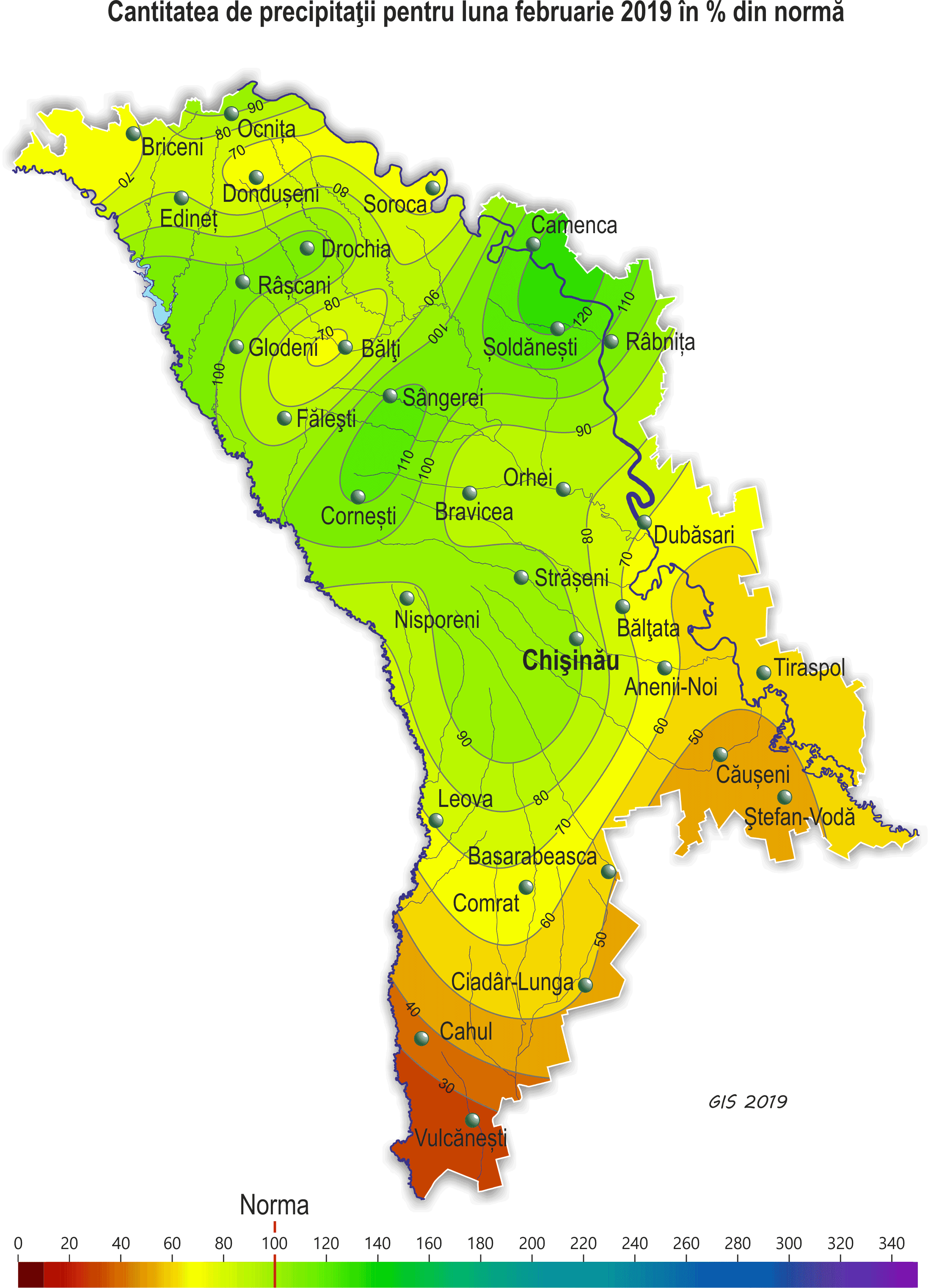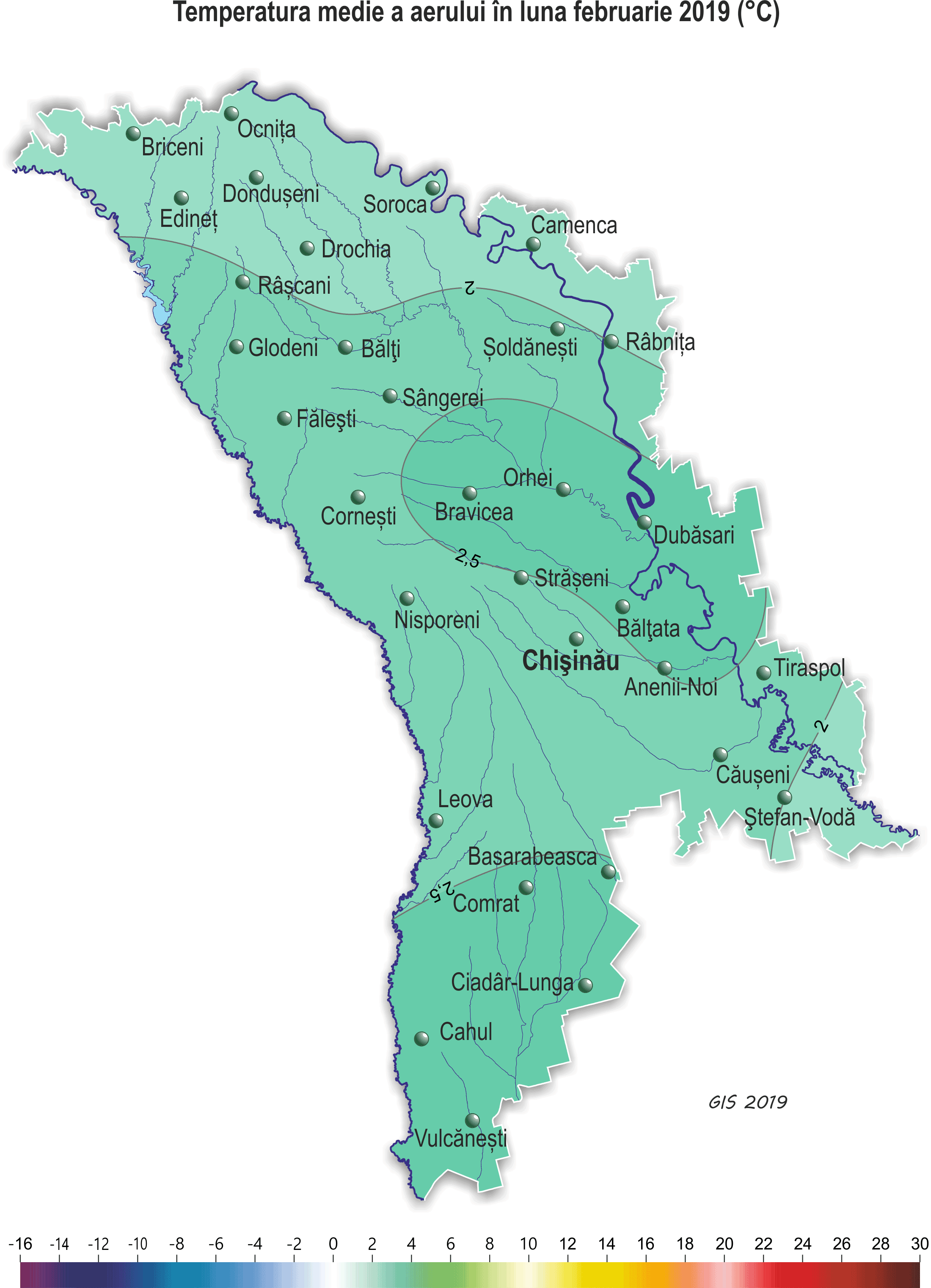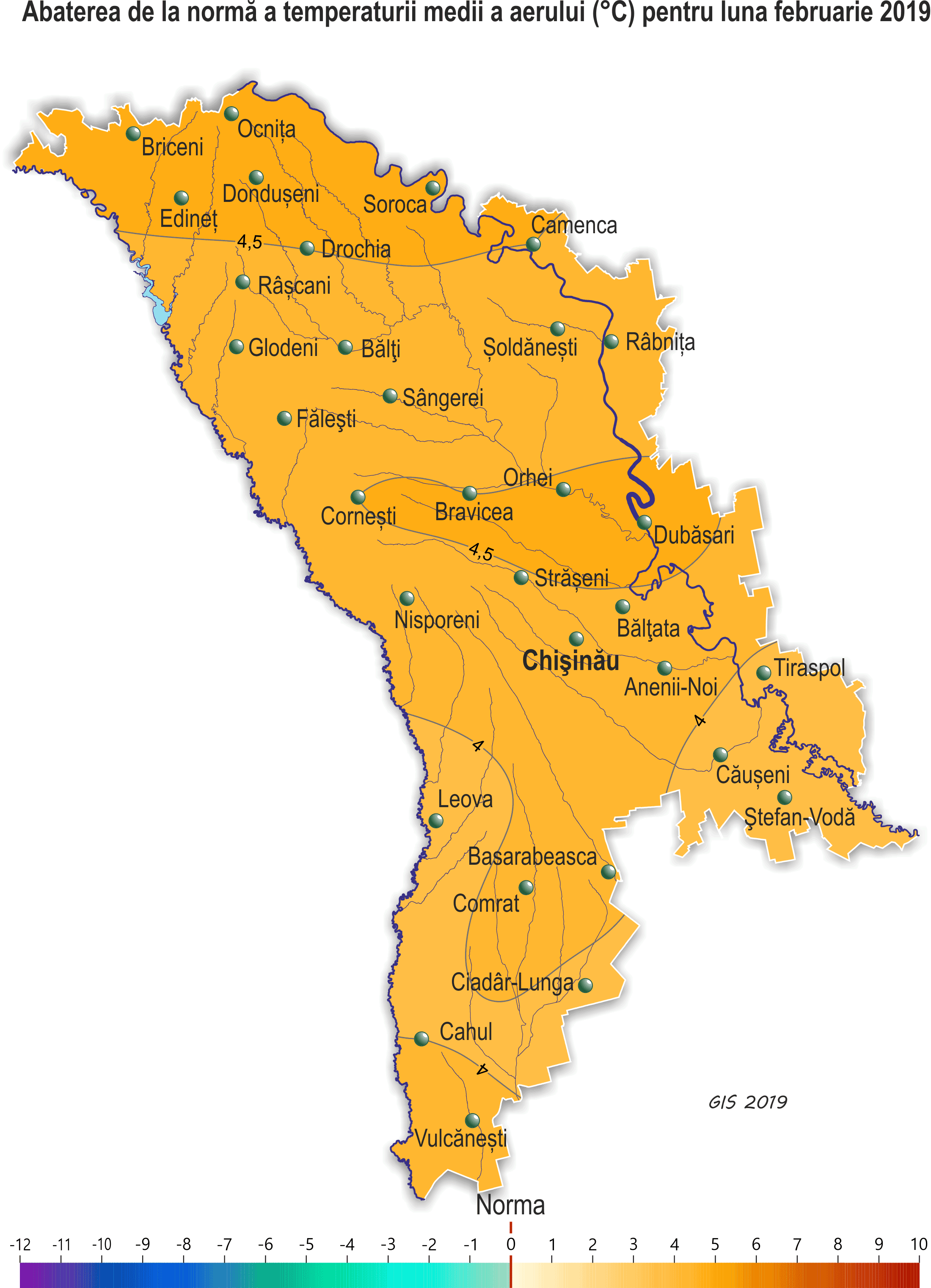 Pe parcursul lunii februarie pe teritoriul ţării s-a semnalat vreme anomal de caldă. Temperatura medie lunară a aerului a fost mai ridicată faţă de valorile normei cu 4-5ºÑ şi a constituit +1,6..+2,8ºÑ, ceea ce se semnalează în medie o dată în 5-8 ani. Temperatura maximă a aerului a urcat până la +17ºÑ (staţia meteorologică Bălţi, Făleşti, Corneşti, Tiraspol, Ceadîr-Lunga). Temperatura minimă a aerului a scăzut până la -14ºÑ (staţia meteorologică Rîbniţa). În decursul lunii au căzut precipitaţii sub formă de zăpadă, lapoviţă şi ploaie. Cantitatea lor pe 60% din teritoriu a constituit 8-22 mm (25-70% din normă), în restul teritoriului – 25-40 mm (85-110% din normă). Stratul de zăpadă s-a semnalat în unele zile ale lunii (pe 1-3, pe 13-14, pe 22-25 februarie). Grosimea lui maximă pe platformele meteorologice a atins 10 cm (staţia meteorologică Făleşti). În majoritatea zilelor solul a fost dezgheţat, doar în unele zile adâncimea de îngheţ a variat de la 1 până la 6 cm. Culturile de toamnă şi plantaţiile multianuale în decursul lunii s-au aflat în fond în stare de repaus vegetativ. Din cauza regimului termic ridicat s-a semnalat reluarea vegetaţiei culturilor de toamnă la sfârşitul decadei a doua, fiind cu o lună mai devreme faţa de termenii obişnuiţi. Pe cea mai mare parte a teritoriului ţării culturile de toamnă s-au aflat în faza de răsărire şi frunza a treia, izolat – înfrăţirea. Starea culturilor de toamnă în fond este satisfăcătoare. Temperatura minima a solului la adâncimea nodului de înfrăţire a culturilor de toamnă (3 cm) pe parcursul lunii a scăzut până la 0..-3ºC, fiind mult mai ridicată faţă de valorile critice (-15ºC). Plantaţiile multianuale în decursul lunii februarie s-au aflat în fond în stare de repaus vegetativ, doar în raioanele extreme din sudul ţării, în ultimele zile ale lunii s-a semnalat umflarea mugurilor la soiurile timpurii de cais. Pentru stabilirea stării culturilor de toamnă, culturilor pomicole şi viţei de vie în perioada iernatului, pe 12 februarie Serviciul Hidrometeorologic de Stat a colectat probe pentru creşterea şi analiza lor. Rezultatele creşterii au demonstrat, că iernatul a decurs bine, pieirea culturilor de toamnă în fond nu s-a depistat. Doar izolat prăpădirea lor a constituit 1-4%, ce nu a depăşit norma naturală (10%). Pe cea mai mare parte a teritoriului cercetat, la culturile pomicole principale pieirea mugurilor florari în fond nu s-a înregistrat, doar izolat prăpădirea lor a constitui 1-6%, ce nu a depăşit norma naturală (15%). Rezultatele creşterii lăstarilor viţei de vie au demonstrat, că în cea mai mare parte a teritoriului cercetat, pieirea ochiurilor la viţa de vie în fond nu s-a depistat, izolat a constituit 1-8%, fiind sub norma naturală (20%).