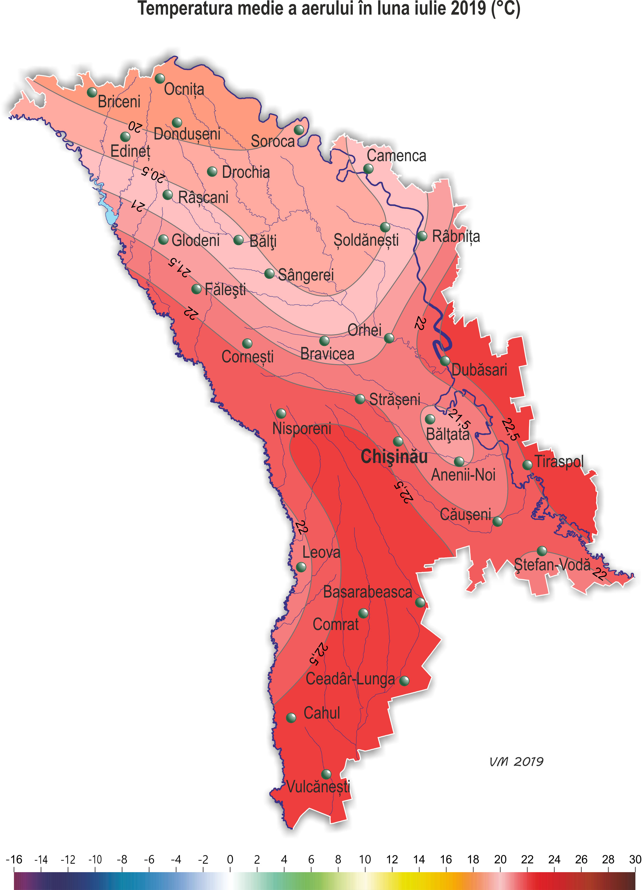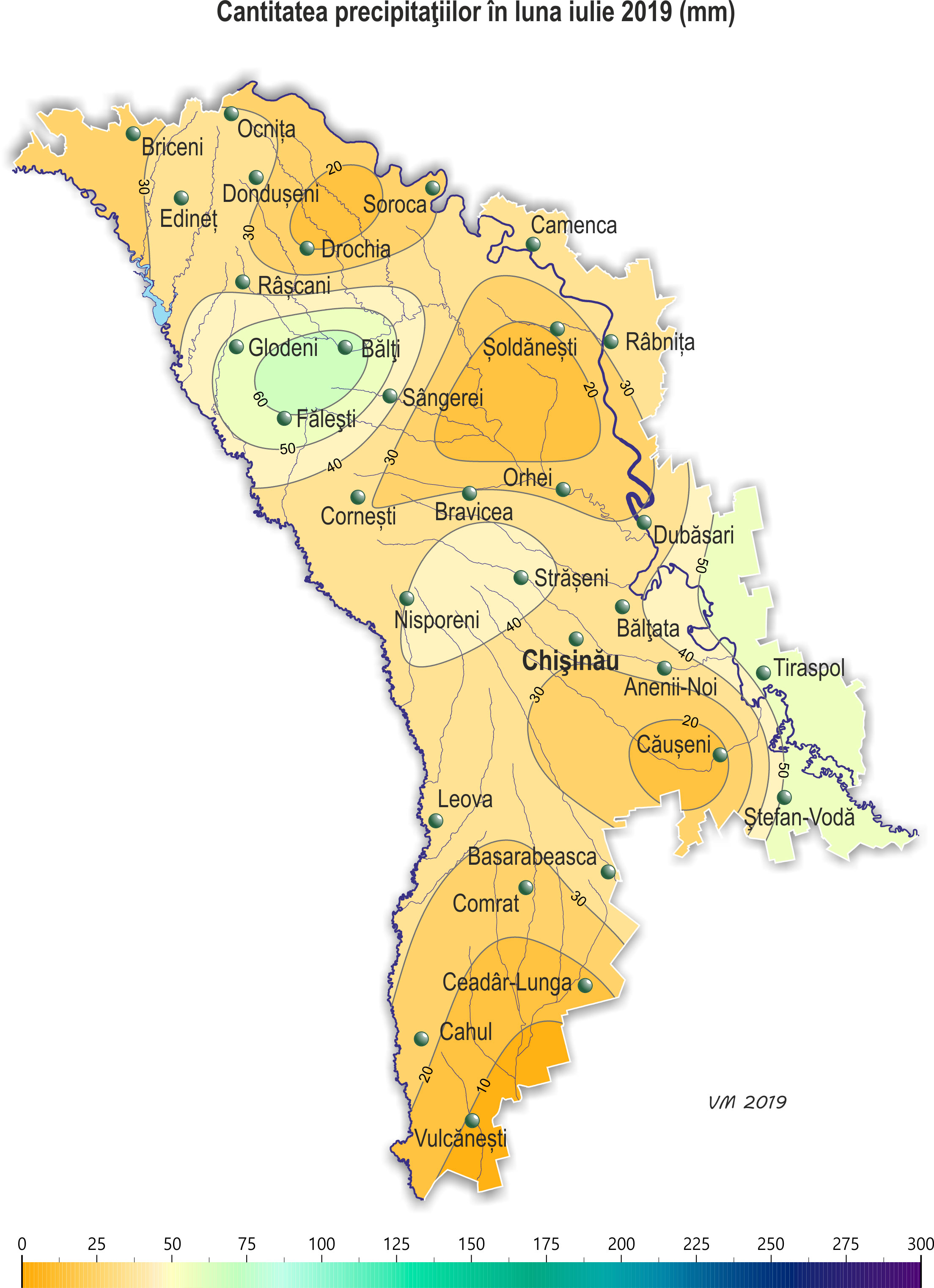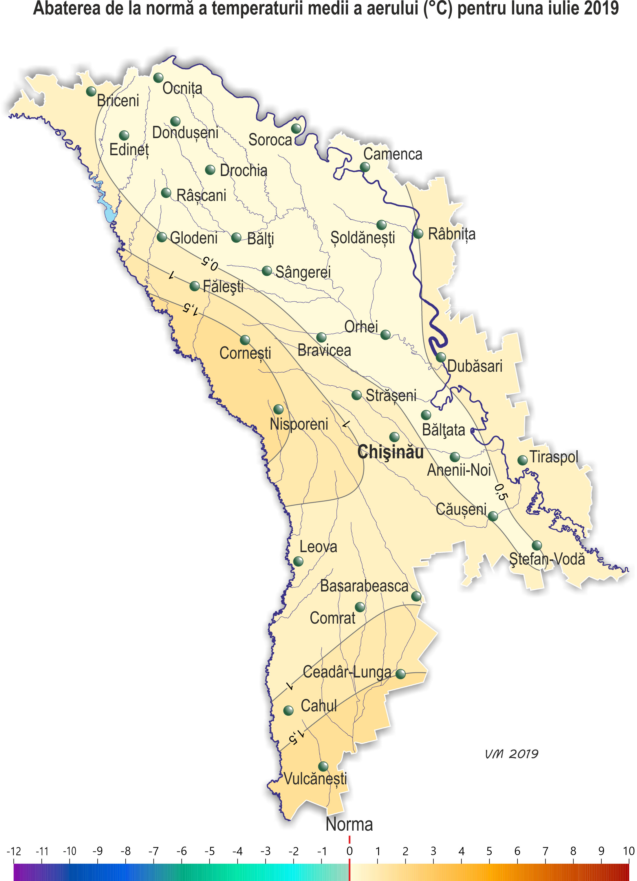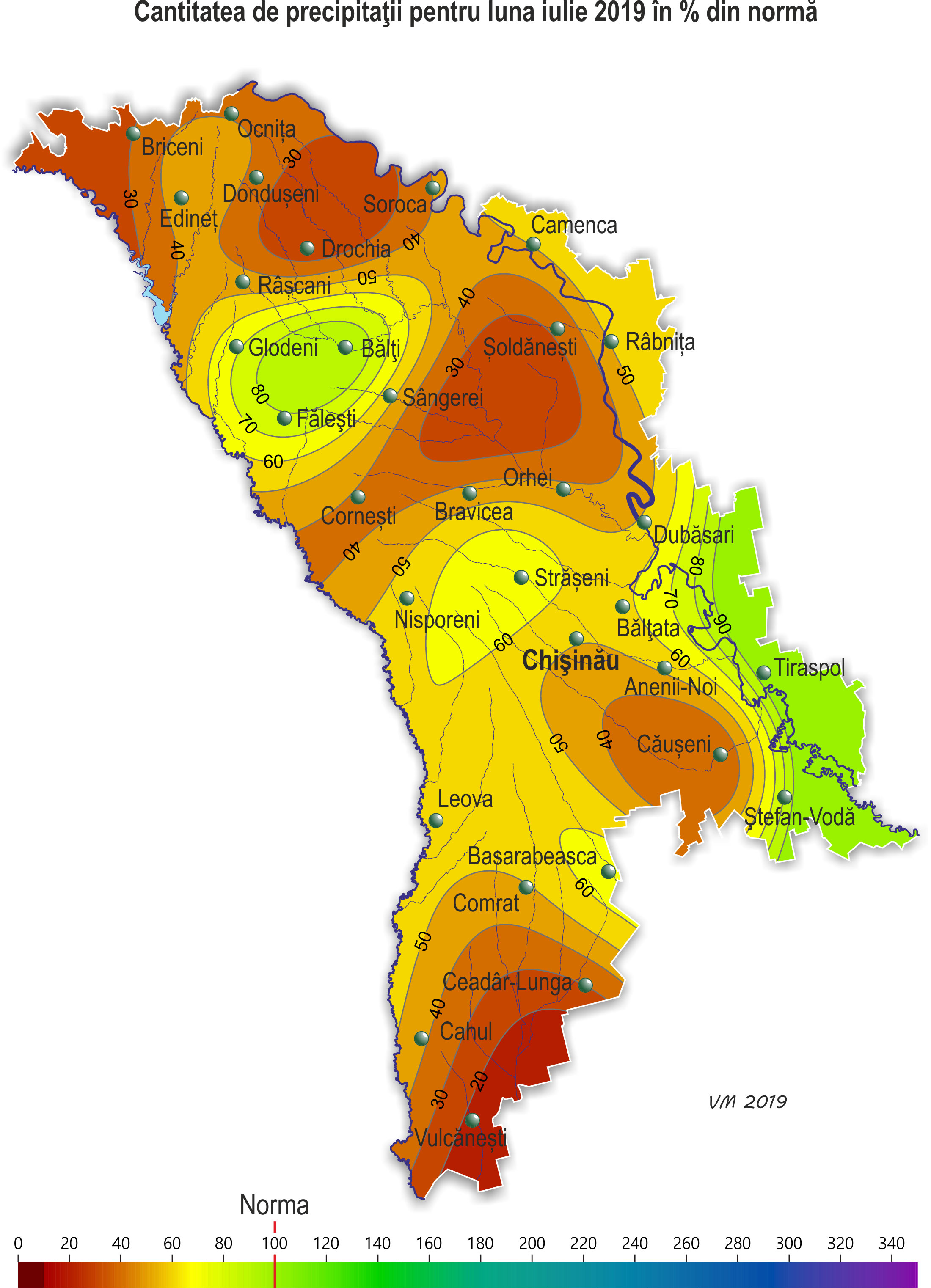În decursul lunii iulie pe teritoriul ţării s-a semnalat vreme neomogenă după regimul termic şi cu insuficienţă de precipitaţii. Temperatura medie lunară a aerului pe o mare parte a teritoriului ţării a fost mai ridicată faţă de valorile normei cu 0,5-1,5ºÑ, doar izolat – în jurul valorilor normei şi a constituit +19,8..+22,8ºÑ. Temperatura maximă a aerului a urcat până la +37ºÑ (staţia meteorologică Tiraspol). Numărul de zile cu temperatura maximă a aerului de +30ºÑ şi mai mult a constituit în teritoriu 7-13 zile (norma fiind de 3-11 zile), cu temperatura maximă a aerului de +35ºÑ şi mai mult – 1-2 zile (norma fiind de o zi). Temperatura minimă a aerului a scăzut până la +9ºÑ (staţia meteorologică Soroca, Camenca, Bălţi, Rîbniţa, Bălţata). Precipitaţiile pe parcursul lunii au căzut neuniform pe teritoriul ţării. Suma precipitaţiilor căzute pe 85% din teritoriul ţării nu a depăşit 10-45 mm (15-65% din normă), în restul teritoriului cantitatea lor s-a egalat cu 55-65 mm (80-90% din normă). Pe parcursul lunii s-au semnalat descărcări electrice, izolat grindină. Pe 2-3 iulie pe cea mai mare parte a teritoriului ţării s-a semnalat vijelie în rafale de până la 16-24 m/s. La SM Ceadîr-Lunga pe 3 iulie viteza vântului a atins 27 m/s, ceea ce se consideră fenomen meteorologic stihinic. Ploile puternice căzute în unele zile ale lunii, izolat cu grindină şi intensificări ale vântului, au cauzat vătămarea semnificativă a culturilor agricole, deteriorarea obiectivelor economiei naţionale şi deconectarea de la sursele de energie electrică. În decursul lunii iulie condiţiile meteorologice în fond au fost satisfăcătoare pentru formarea roadei de porumb, florii-soarelui, sfeclei de zahăr, culturilor pomicole, viţei de vie, cât şi pentru creşterea şi dezvoltarea culturilor legumicole şi altor culturi agricole. În prima decadă a lunii iulie a început recoltarea în masă a cerealelor, fiind în fond cu 1-2 săptămâni mai devreme de termenii obişnuiţi. Spre sfârşitul lunii gospodăriile ţării, în fond, au finisat recoltarea culturilor cerealiere. Condiţiile meteorologice pentru efectuarea recoltării au fost, în general, favorabile. La porumb pe parcursul lunii s-a semnalat formarea paniculului, înflorirea paniculului şi ştiuletelui, la sfârşitul lunii a început coacerea în lapte. Înălţimea plantelor la sfârşitul lunii s-a egalat în fond cu 180-265 cm. La situaţia din 28 iulie rezervele de umezeală productivă în stratul de sol cu grosimea de 1 m pe terenurile cu porumb în cea mai mare parte a teritoriului au constituit 30-60 mm (25-65% din normă), izolat – 80-95 mm (80-100% din normă). La floarea-soarelui în decursul lunii s-a semnalat înflorirea şi creşterea capitolului, la sfârşitul lunii izolat a început coacerea seminţelor. Înălţimea plantelor la sfârşitul lunii s-a egalat în fond cu 130-200 cm. Diametrul capitolului a constituit în fond 18-24 cm, izolat – 12-16 cm. La situaţia din 28 iulie rezervele de umezeală productivă în stratul de sol cu grosimea de 1 m pe terenurile cu floarea-soarelui pe o mare parte a teritoriului au constituit 25-65 mm (20-70% din normă), izolat în nordul ţării – 80-120 mm (80-100% din normă). La sfecla de zahăr în decursul lunii a continuat creşterea rădăcinii principale. La culturile pomicole a continuat creşterea rodului, la piersic, cais, prun şi soiurile timpurii de măr – coacerea şi recoltarea roadei. La viţa de vie a continuat creşterea rodului, spre sfârşitul lunii la soiurile timpurii a început coacerea boabelor. La situaţia din 28 iulie rezervele de umezeală productivă în stratul de sol cu grosimea de 1 m pe plantaţiile multianuale în fond au constituit 35-55 mm (30-60% din normă), izolat, preponderent în nordul ţării – 75-90 mm (70-80% din normă).