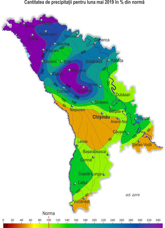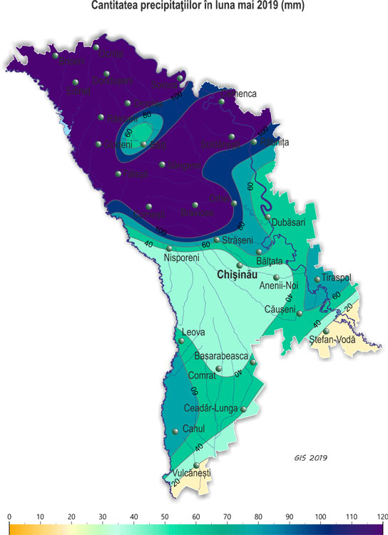 În decursul lunii mai pe teritoriul ţării s-a semnalat vreme mai caldă ca de obicei şi pe cea mai mare parte a teritoriului ţării cu precipitaţii abundente. Temperatura medie lunară a aerului a fost mai ridicată faţă de valorile normei cu 0,5-1,5ºÑ şi a constituit +15,5..+17,5ºÑ. Temperatura maximă a aerului a urcat până la +32ºÑ (staţia meteorologică Tiraspol). Numărul de zile cu temperatura maximă a aerului de +25ºÑ şi mai mult a constituit pe teritoriu în fond 7-16 zile (norma fiind de 6-11 zile). Numărul de zile cu temperatura maximă a aerului de +30ºÑ şi mai mult în luna mai a atins în fond 2-4 zile (norma fiind o zi) şi s-a semnalat în jumătatea de sud a ţării. Temperatura minimă a aerului în decursul lunii a scăzut până la +1ºÑ (staţia meteorologică Briceni). Pe 9-10 mai izolat în teritoriu (SM Briceni, Codrii, Tiraspol) s-au semnalat îngheţuri la înălţimea de 2 cm de la suprafaţa solului cu intensitatea de -1..-2ºC, ceea ce în această perioadă se semnalează în medie o dată în 5-10 ani. Precipitaţii pe parcursul lunii au căzut neuniform pe teritoriul ţării sub formă de averse. Suma precipitaţiilor căzute în jumătatea de nord a ţării a constituit preponderent 60-160 mm (115-260% din norma lunară). În unele localităţi cantitatea lor pentru o lună a atins:Ocniţa - 223 mm, Briceni - 204 mm, Edineţ - 187 mm, Sîngerei - 220 mm, Glodeni - 180 mm, Bravicea (raionul Călăraşi) - 178 mm, ceea ce constituie 3-4 norme lunare şi se semnalează în aceste puncte pentru prima dată din toată perioada de observaţii. În mai multe raioane din jumătatea de sud a ţării cantitatea precipitaţiilor în luna mai nu a depăşit 15-45 mm (25-85% din norma lunară). Pe parcursul lunii s-au semnalat fenomene meteorologice stihinice sub formă de ploaie foarte puternică: pe 18 mai la SM Briceni, Bravicea şi postul agrometeorologic Edineţ în timp de 12 ore şi mai puţin au căzut 52-72 mm de precipitaţii, pe 24 mai la SM Bravicea în timp de 3 ore au căzut 80 mm de precipitaţii. Ploile puternice căzute, izolat cu grindină, au cauzat vătămarea culturilor agricole, deteriorarea obiectivelor economiei naţionale, deconectarea de la sursele de energie electrică. Condiţiile meteorologice în luna mai au fost în fond satisfăcătoare pentru creşterea şi dezvoltarea culturilor agricole. Ploile căzute în decursul lunii au completat rezervele de umezeală productivă în sol şi au îmbunătăţit condiţiile pentru creşterea şi dezvoltarea culturilor agricole pe cea mai mare parte a teritoriului ţării. În mai multe raioane din sudul ţării, din cauza insuficienţei de precipitaţii, semnalate în majoritatea zilelor din lună, s-au creat condiţii mai puţin favorabile pentru creşterea şi dezvoltarea culturilor de toamnă şi celor prăşitoare. La culturile de toamnă s-a semnalat formarea paiului, înspicarea şi înflorirea. Înălţimea plantelor către sfârşitul lunii s-a egalat cu 55-85 cm. La situaţia din 28 mai rezervele de umezeală productivă în stratul arabil al solului cu grosimea de 0,5 m pe terenurile cu culturi de toamnă au constituit în fond 40-90 mm (80-180% din normă), izolat, preponderent în jumătatea de sud a ţării – 15-35 mm (35-70% din normă). În stratul de sol cu grosimea de 1 m rezervele de umezeală productivă au constituit în fond 80-180 mm (85-175% din normă), izolat, preponderent în sudul ţării – 35-55 mm (40-60% din normă). La semănăturile cu orz de primăvară în prima jumătatea a lunii s-au semnalat înfrăţirea şi formarea paiului, în a doua jumătatea – înspicarea. La mazăre s-a semnalat în fond formarea inflorescenţelor, spre sfârşitul lunii – înflorirea. La porumb la începutul lunii s-a semnalat încolţirea boabelor şi răsărirea, în a doua jumătate a lunii a început formarea frunzelor. Spre sfârşitul lunii la porumb s-a format în fond frunza a cincea şi a şaptea, la semănăturile mai târzii – frunza a treia. Înălţimea plantelor s-a egalat cu 20-50 cm. La situaţia din 28 mai rezervele de umezeală productivă în stratul arabil al solului pe terenurile cu porumb au constituit în fond 25-35 mm (80-140% din normă), izolat, preponderent în jumătatea de sud a ţării – 10-15 mm (40-60% din normă), în stratul de sol cu grosimea de 1 m în fond – 90-160 mm (80-125% din normă), izolat – 55-80 mm (45-65% din normă). La floarea-soarelui la începutul lunii s-a semnalat formarea perechii a doua de frunze adevărate, la semănăturile mai târzii – răsărirea. În decursul lunii a continuat formarea frunzelor următoare. Înălţimea plantelor în fond s-a egalat cu 20-45 cm, izolat – 5-15 cm. La situaţia din 28 mai rezervele de umezeală productivă în stratul arabil al solului pe terenurile cu floarea-soarelui au constituit în fond 25-35 mm (75-130% din normă), izolat, preponderent în sudul ţării – 15-20 mm (40-65% din normă), în stratul de sol cu grosimea de 1 m în fond – 110-185 mm (75-135% din normă), izolat – 55-90 mm (40-65% din normă). La sfecla de zahăr în decursul lunii s-a format prima, a treia şi a cincea frunză adevărată, la sfârşitul lunii a început creşterea rădăcinii principale. La culturile pomicole şi nuc s-a semnalat formarea şi creşterea rodului, la soiurile timpurii de cireş – coacerea roadei. La viţa de vie s-a semnalat formarea inflorescenţelor şi înflorirea. La situaţia din 28 mai rezervele de umezeală productivă în stratul de sol cu grosimea de 1 m pe plantaţiile multianuale în fond au constituit 110-165 mm (90-110% din normă), izolat în sudul ţării – 80-85 mm (60-80% din normă).