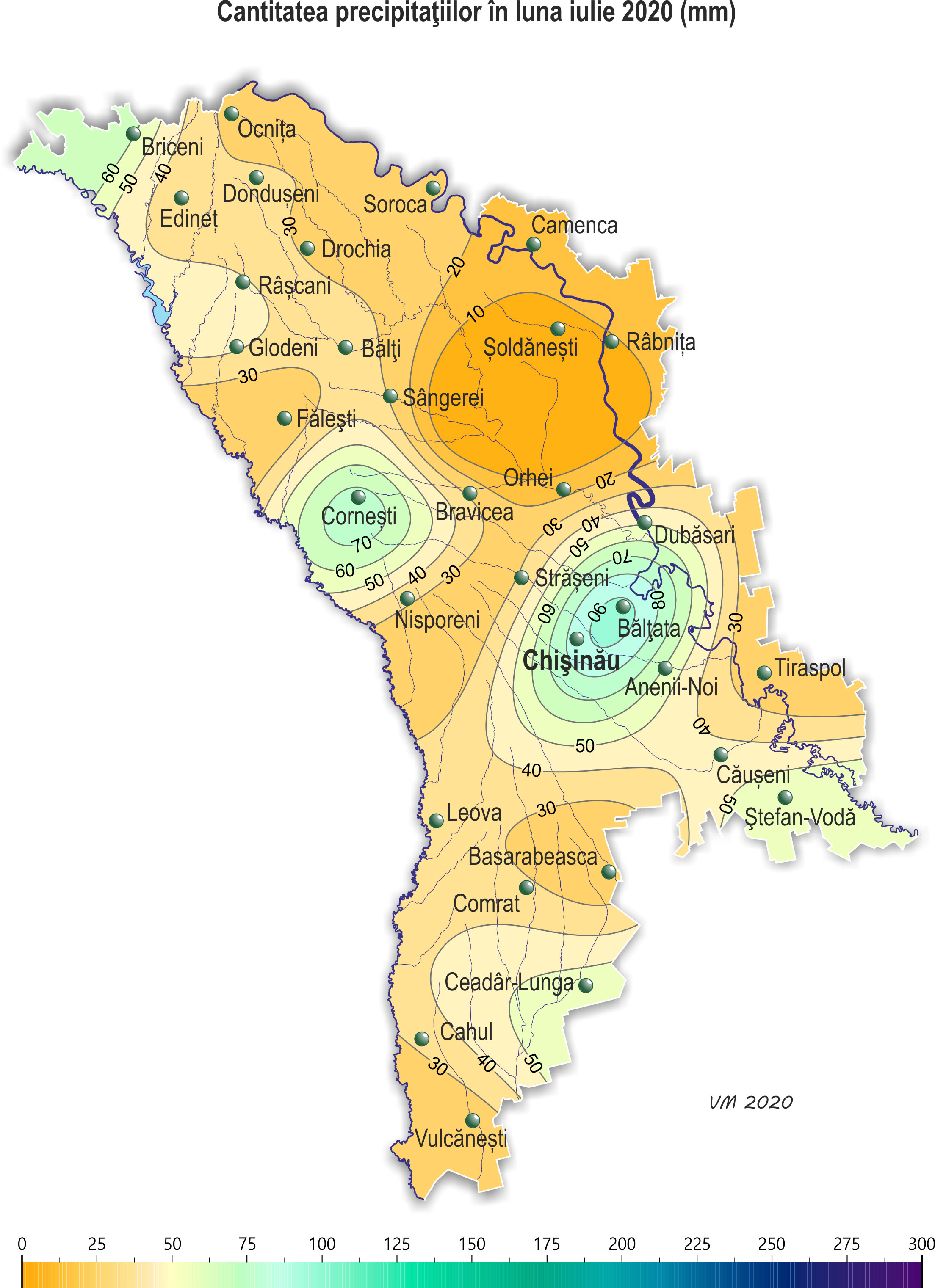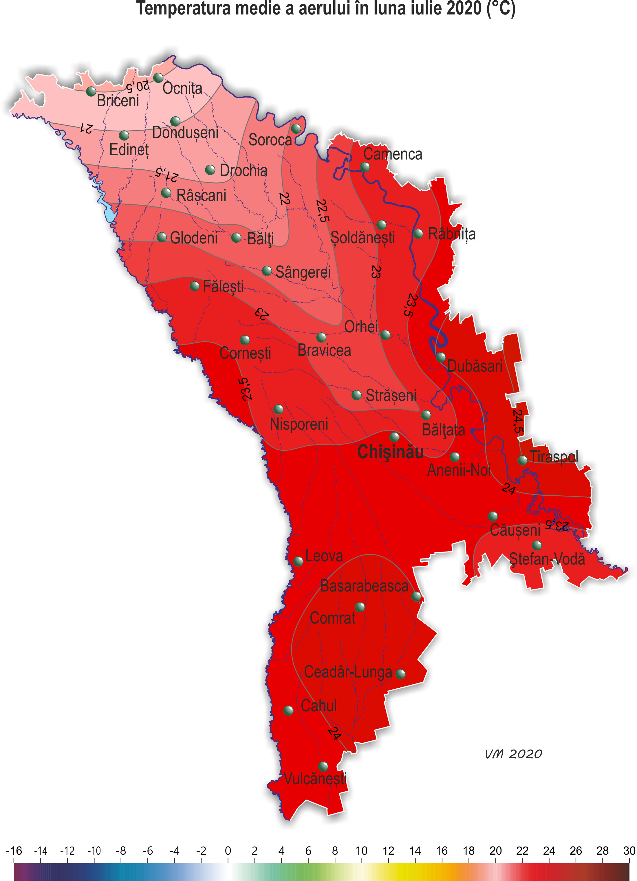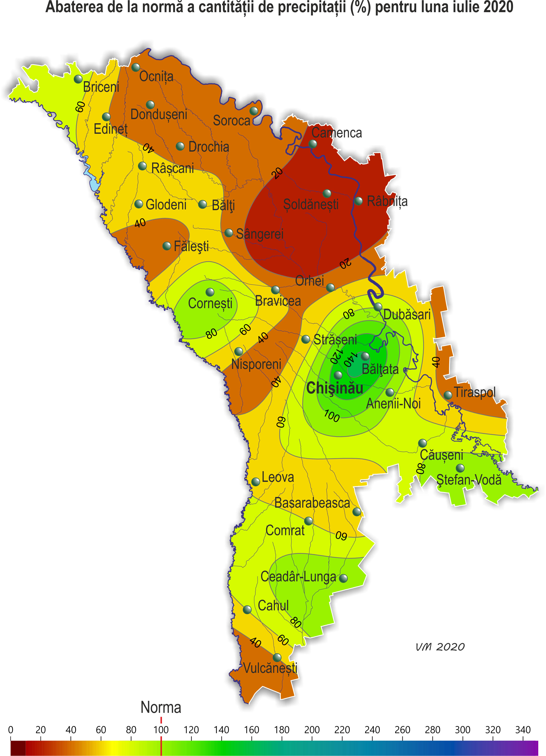 Pe parcursul lunii iulie pe teritoriul ţării s-a semnalat vreme neomogenă după regimul termic și cu deficit de precipitații. Temperatura medie lunară a aerului a fost mai ridicată faţă de valorile normei cu 1,5-3,0ºÑ şi a constituit +20,5..+24,5ºÑ, ceea ce se semnalează în medie o dată în 10 ani. Temperatura maximă a aerului a urcat pe teritoriul țării până la +37ºÑ (staţia meteorologică Camenca, Fălești, Bravicea, Tiraspol, Comrat, Ceadîr-Lunga, Cahul), ceea ce se semnalează pe teritoriu în medie o dată în 5-10 ani. Numărul de zile cu temperatura maximă a aerului de +30ºÑ și mai mult pe teritoriul țării a variat de la 7 zile în nordul țării până la 24 de zile în sud, norma fiind 3-11 zile. Temperatura maximă a aerului de +35ºÑ și mai mult a constituit 1-6 zile (norma fiind o zi). Temperatura minimă a aerului a scăzut până la +8ºÑ (staţia meteorologică Bălțata). În decursul lunii iulie precipitațiile au căzut neuniform pe teritoriul țării. Cantitatea acestora pe 70% din teritoriu a constituit în fond 20-40 mm (30-60% din normă), izolat – 5-15 mm (10-20% din normă). În restul teritoriului, predominant în jumătatea de sud a țării, suma precipitațiilor s-a egalat cu 45-90 mm (75-140% din normă). Ploile puternice căzute în unele zile ale lunii, izolat însoţite de grindină și vijelie, au cauzat vătămarea semnificativă a culturilor agricole, deteriorarea obiectivelor economiei naţionale, deconectarea de la sursele de energie electrică. Din cauza vremii secetoase, semnalate în decursul lunii iulie pe o mare parte a teritoriului țării, s-au creat condiții meteorologice nefavorabile pentru formarea roadei la porumb, floarea-soarelui, sfecla de zahăr, precum și pentru creșterea și dezvoltarea culturilor legumicole și altor culturi agricole. Regimul termic ridicat în orele de zi și lipsa precipitațiilor esențiale au contribuit la împilarea plantelor, uscarea prematură a frunzelor inferioare şi uscarea în continuare a solului. În prima decadă a lunii iulie gospodării agricole au început recoltarea masivă culturilor cerealiere, fiind cu 1-2 săptămâni mai devreme de termenii obișnuiți. Spre sfârșitul lunii gospodăriile în fond au finisat recoltarea cerealelor. Condițiile meteorologice pentru efectuarea recoltării au fost predominant favorabile. La porumb la începutul lunii a continuat formarea frunzelor, în a doua jumătate a lunii s-a semnalat înflorirea paniculului și formarea știuletelui, spre sfârșitul lunii izolat în sudul țării a început coacerea în lapte. Înălţimea plantelor la sfârșitul lunii a constituit în fond 145-210 cm, izolat, predominant în nordul țării – 225-295 cm. La o plantă de porumb s-a format în medie un știulete, în nordul țării – până la doi știuleți. La situaţia din 28 iulie rezervele de umezeală productivă în stratul de sol cu grosimea de 1 m pe terenurile cu porumb au fost joase și au constituit în fond 10-65 mm (15-60% din normă). La floarea-soarelui în decursul lunii s-a semnalat înflorirea și creșterea capitolului, spre sfârșitul lunii izolat a început coacerea semințelor. Înălţimea plantelor la sfârșitul lunii iulie a constituit în fond 145-185 cm, izolat – 85-130 cm. Diametrul capitolului a constituit în fond 16-21 cm, izolat – 11-15 cm. La situaţia din 28 iulie rezervele de umezeală productivă în stratul de sol cu grosimea de 1 m pe terenurile cu floarea-soarelui pe cea mai mare parte a teritoriului ţării au fost joase și au constituit în fond 5-50 mm (10-45% din normă). Doar în raioanele extreme din nordul țării rezervele de umezeală productivă s-au egalat cu 60-90 mm (70-90% din normă). La sfecla de zahăr în decursul lunii a continuat creșterea rădăcinii principale și s-a atestat acoperirea integrală a spaţiilor dintre rânduri. La culturile pomicole a continuat creșterea rodului, la piersic, cais, prun și soiurile timpurii de măr s-a semnalat coacerea și recoltarea roadei. La vița de vie a continuat creșterea boabelor, spre sfârșitul lunii a început coacerea boabelor. La situaţia din 28 iulie rezervele de umezeală productivă în stratul de sol cu grosimea de 1 m pe plantaţiile multianuale au fost în fond joase și au constituit 15-45 mm (20-50% din normă), izolat – 70-95 mm (75-85% din normă).