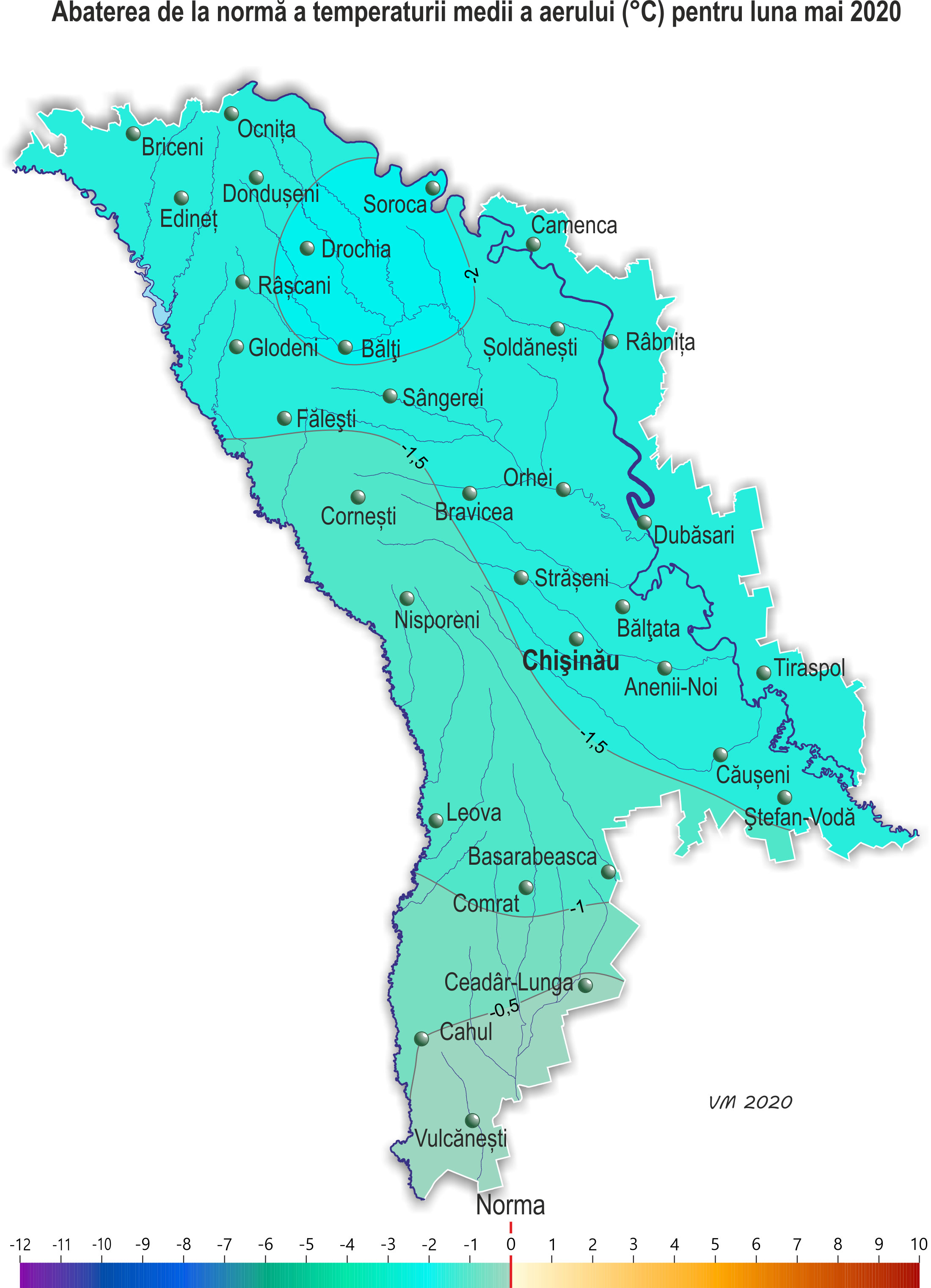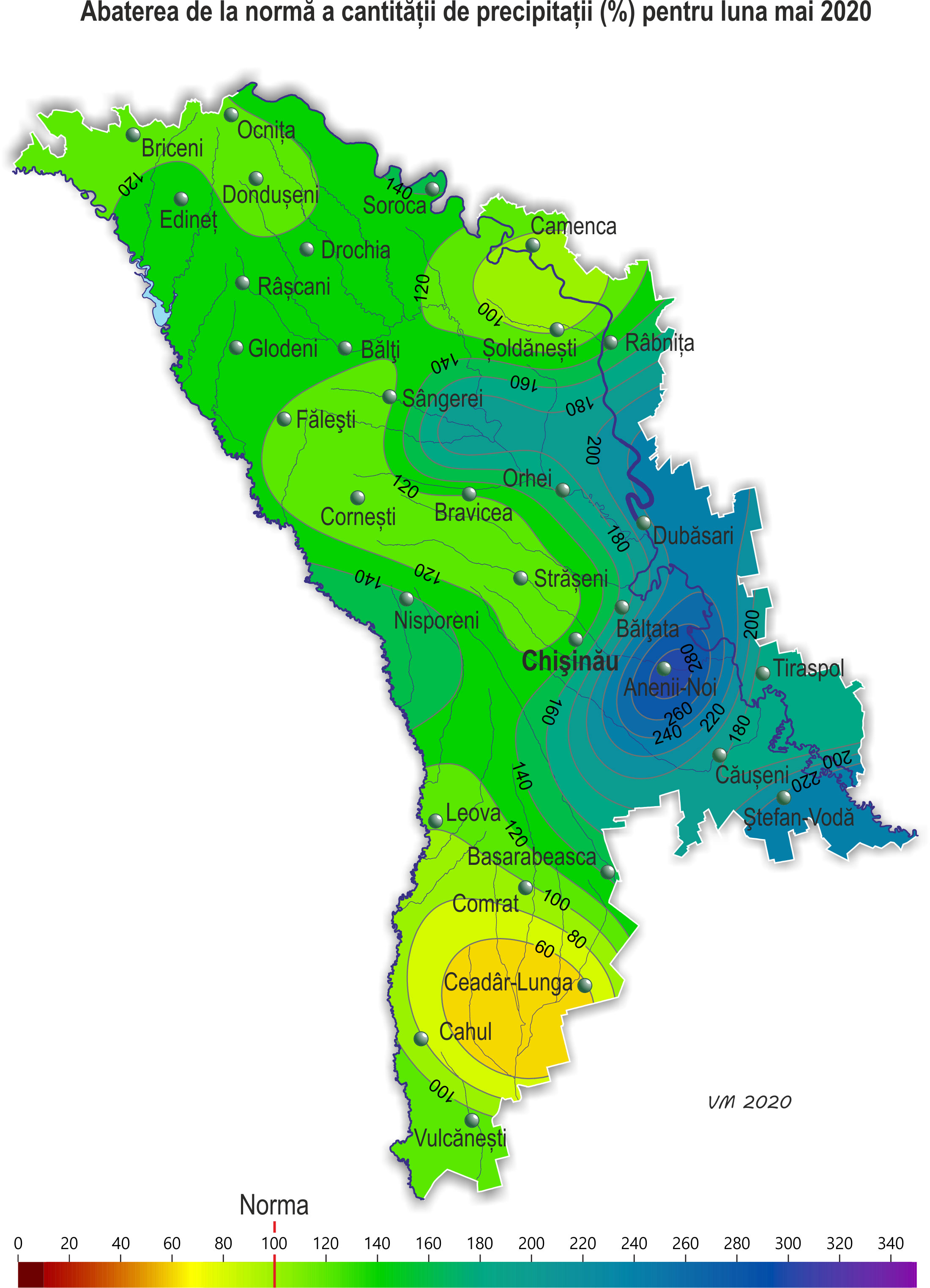 Pe parcursul lunii mai pe teritoriul ţării s-a semnalat vreme neomogenă după regimul termic şi cu deficit de precipitaţii. Temperatura medie lunară a aerului a fost mai scăzută faţă de valorile normei cu 0,5-2,0ºÑ şi a constituit +12,8..+15,5ºÑ. Temperatura maximă a aerului a urcat pe teritoriul țării până la +31ºÑ (staţia meteorologică Camenca, Fălești, Ceadîr-Lunga, Cahul). Numărul de zile cu temperatura maximă a aerului de +25ºÑ și mai mult în luna mai pe teritoriul țării a constituit 3-8 zile, norma fiind 6-11 zile. Temperatura minimă a aerului a scăzut până la 0ºÑ (staţia meteorologică Briceni, Camenca, Codrii). Pe 9 mai izolat, predominant în nordul țării, s-au înregistrat înghețuri la suprafața solului și la înălţimea de 2 cm de la suprafaţa solului cu intensitatea de -1..-2ºÑ. De asemenea și pe 13 mai izolat în jumătatea de nord a țării s-au atestat înghețuri la suprafața solului și la înălţimea de 2 cm de la suprafaţa solului cu intensitatea de -3..-4ºÑ. În decursul lunii mai precipitațiile au căzut neuniform pe teritoriul țării. Cantitatea acestora a constituit în fond 45-80 mm (80-165% din normă lunară), în unele puncte de observații suma precipitațiilor a atins 90-140 mm (185-290% din normă lunară). Pe 28 mai la stația meteorologică Ștefan-Vodă și postul agrometeorologic Anenii Noi s-a semnalat fenomen meteorologic stihinic sub formă de averse puternice: în timp de 12 ore au căzut 62 și 67 mm de precipitații corespunzător. Condițiile meteorologice din luna mai au fost în general satisfăcătoare pentru creșterea și dezvoltarea culturilor agricole pe o mare parte a teritoriului țării. Ploile căzute pe parcursul lunii au completat rezervele de umiditate productivă în sol, ceea ce a îmbunătățit condițiile pentru creșterea și dezvoltarea culturilor agricole. În multe raioane din jumătatea de sud a țării din cauza deficitului de precipitații, semnalat în majoritatea zilelor ale lunii, s-au creat condiții nefavorabile pentru creșterea și dezvoltarea culturilor de toamnă și a celor prășitoare. La culturile de toamnă în decursul lunii s-a atestat faza formării paiului, înspicării și înfloririi, spre sfârșitul lunii la unele semănături – coacerea în lapte. Înălţimea plantelor a constituit în fond 35-55 cm, izolat – 60-70 cm. La situaţia din 28 mai rezervele de umezeală productivă în stratul de sol cu grosimea de 0,5 m pe terenurile cu culturi de toamnă pe 60% din teritoriul țării au constituit 30-60 mm (70-115% din normă), în restul teritoriului, predominant în sudul țării – 5-25 mm (15-50% din normă). În stratul de sol cu grosimea de 1 m rezervele de umezeală productivă în sol au constituit în fond 30-75 mm (40-70% din normă), izolat, predominant în nordul țării – 80-150 mm (85-140% din normă). La semănăturile cu orz de primăvară în prima parte a lunii s-a semnalat faza înfrățirii și formării paiului, în cea a doua – înspicării. La mazăre s-a atestat în fond formarea inflorescențelor și înflorirea, la sfârșitul lunii a început formarea boabelor. La sfecla de zahăr a continuat formarea frunzelor, spre sfârșitul lunii s-a semnalat apariția frunzei a cincea adevărate. La porumb la începutul lunii s-a atestat încolțirea boabelor și răsărirea, în a doua jumătate a lunii a început formarea frunzelor. Spre sfârșitul lunii s-a format în fond frunza a cincea și a șapte, izolat – a noua, la semănăturile mai târzii – frunza a treia. Înălţimea plantelor a constituit în fond 15-25 cm, izolat – 35-40 cm. La situaţia din 28 mai rezervele de umezeală productivă în stratul arabil al solului pe semănăturile cu porumb au constituit în fond 25-40 mm (80-125% din normă), izolat – 15-20 mm (50-70% din normă). În stratul de sol cu grosimea de 1 m rezervele de umezeală productivă în sol au constituit în fond 60-70 mm (45-60% din normă), izolat – 115-145 mm (75-105% din normă). La floarea-soarelui la începutul lunii s-a semnalat formarea perechii a doua de frunze adevărate, la semănăturile târzii – răsărirea. În decursul lunii mai la floarea-soarelui a continuat formarea frunzelor, izolat la semănăturile timpurii s-a atestat apariția inflorescențelor. Înălţimea plantelor a constituit în fond 20-30 cm, izolat – 6-15 cm. La situaţia din 28 mai rezervele de umezeală productivă în stratul arabil al solului pe semănăturile cu floarea-soarelui au constituit în fond 20-35 mm (75-105% din normă), izolat – 12-17 mm (40-65% din normă). În stratul de sol cu grosimea de 1 m rezervele de umezeală productivă au constituit în fond 75-100 mm (60-75% din normă), izolat – 35-45 mm (25-40% din normă). La culturile pomicole și nuc s-a semnalat formarea și creșterea rodului, la soiurile timpurii de cireș – coacerea și recoltarea roadei. La vița de vie s-a atestat formarea inflorescențelor și înflorirea. La situaţia din 28 mai rezervele de umezeală productivă în stratul de sol cu grosimea de 1 m pe plantaţiile multianuale au constituit în fond 45-65 mm (40-70% din normă), izolat – 85-105 mm (75-80% din normă).