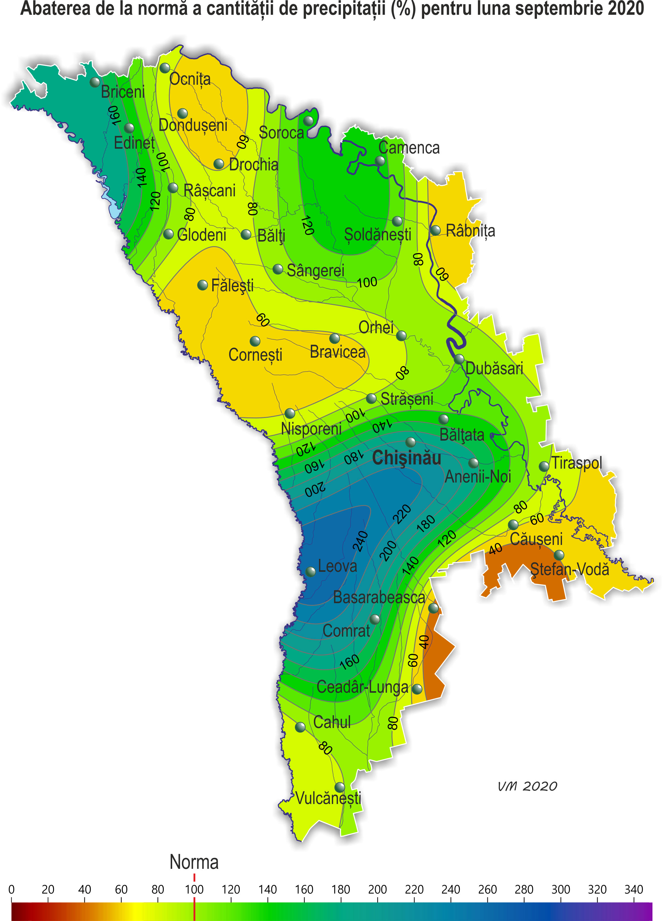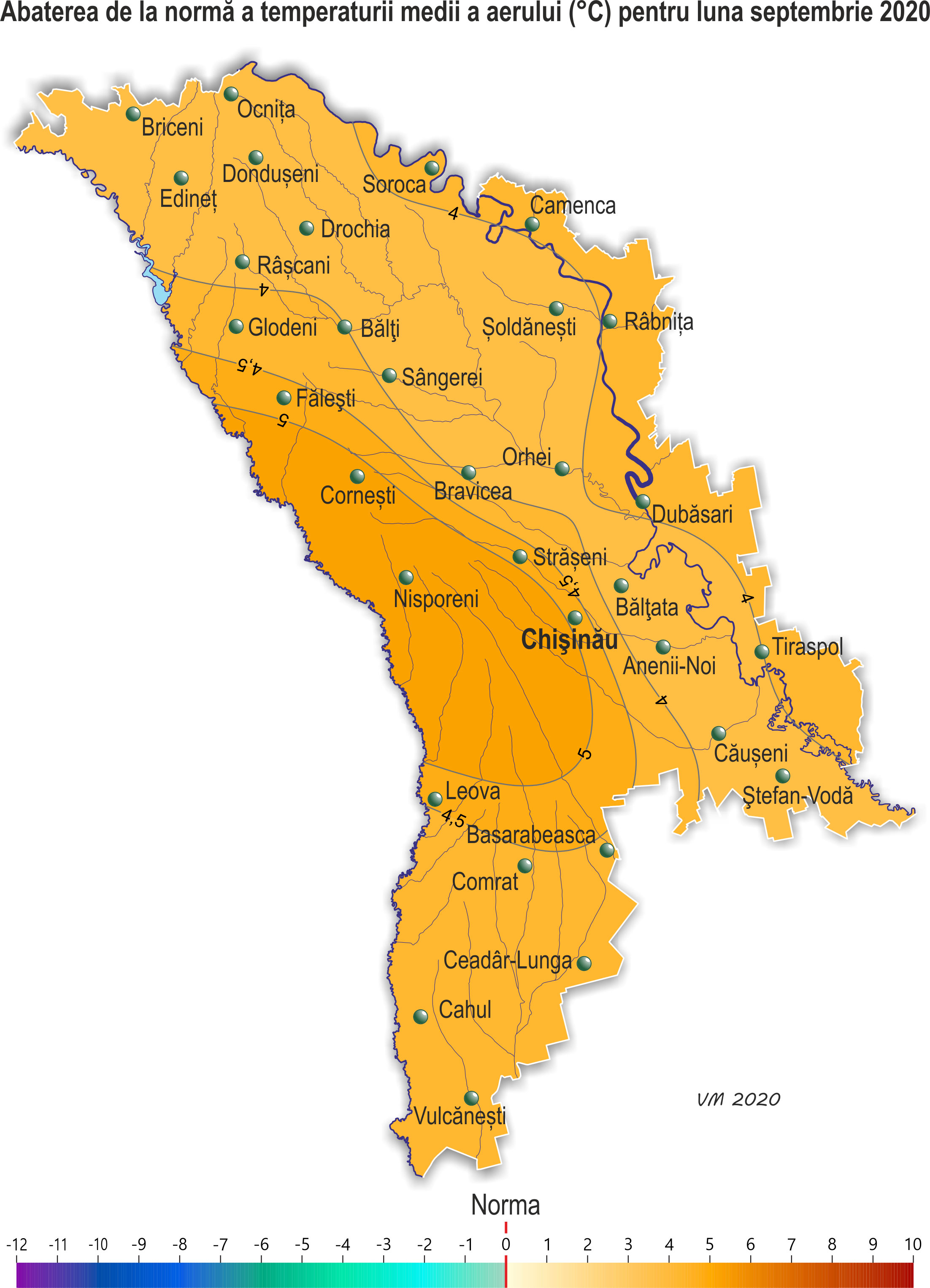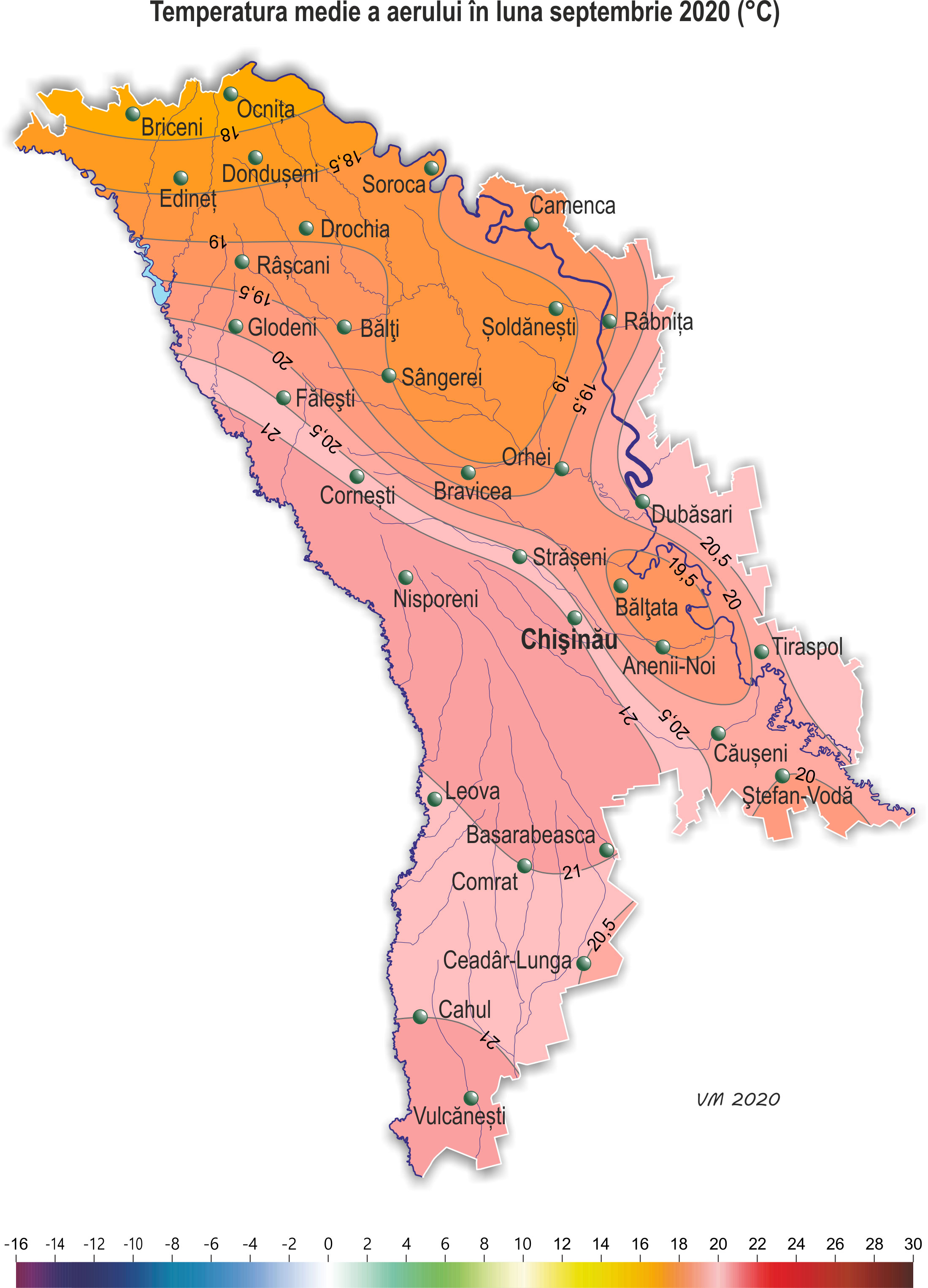 Pe parcursul lunii septembrie pe teritoriul ţării s-a semnalat vreme anomal de caldă. Temperatura medie lunară a aerului a fost mai ridicată faţă de valorile normei cu 3,5-5,5ºÑ şi a constituit +18..+21ºÑ, ceea ce se semnalează în medie o dată în 25-30 ani. Temperatura maximă a aerului a urcat până la +36ºÑ (staţia meteorologică Fălești, Bravicea, Dubăsari, Ceadîr-Lunga), ceea ce se semnalează în medie o dată în 20-30 ani. Numărul de zile cu temperatura maximă a aerului de +30ºÑ și mai mult a constituit 3-10 zile (norma fiind de 1-2 zile). Temperatura minimă a aerului a scăzut până la +3ºÑ (staţia meteorologică Bălțata). Cantitatea precipitațiilor căzute în decursul lunii pe 70% din teritoriu a constituit 35-75 mm (70-180% din normă). Cea mai mare cantitate lunară de precipitații a căzut în regiunea stației meteorologice Leova – 106 mm (260% din normă). În restul teritoriului țării suma precipitațiilor s-a egalat cu 10-30 mm (35-60% din normă). La sfârșitul lunii s-au semnalat fenomene meteorologice stihinice sub formă de averse puternice: - pe 27 septembrie la postul hidrologic Șirăuți (r-nul Briceni) în timp de 12 ore au căzut 76 mm de precipitații; - pe 29 septembrie la postul hidrologic Costești (r-nul Râșcani) în timp de 12 ore au căzut 88 mm, postul hidrologic Braniște (r-nul Râșcani) – 72 mm; - pe 29 septembrie la stația meteorologică Leova în timp de o oră au căzut 51 mm, în timp de 4 ore – 91 mm. Aversele puternice căzute la sfârșitul lunii au cauzat deteriorarea caselor de locuit și obiectivelor economiei naţionale. Menținerea în o mare parte a lunii septembrie a vremii secetoase și rezervelor de umiditate joase în sol sau izolat lipsa acestora, au determinat condiții nefavorabile pentru pregătirea solului și semănatul culturilor de toamnă. Condițiile meteorologice au fost în fond favorabile pentru coacerea culturilor pomicole și acumularea zahărului în struguri. Ploile căzute la sfârșitul lunii au completat rezervele de umiditate productivă în sol și au îmbunătățit condițiile pentru pregătirea solului și semănatul culturilor de toamnă pe o mare parte teritoriului țării. Gospodăriile agricole ale țării în decursul lunii au efectuat recoltarea florii-soarelui, porumbului, sfeclei de zahăr, culturilor legumicole, pomicole și strugurilor. La situația din 28 septembrie rezervele de umezeală productivă în stratul de sol cu grosimea de 1 m pe plantațiile multianuale nu au depășit 15-65 mm (20-70% din normă).