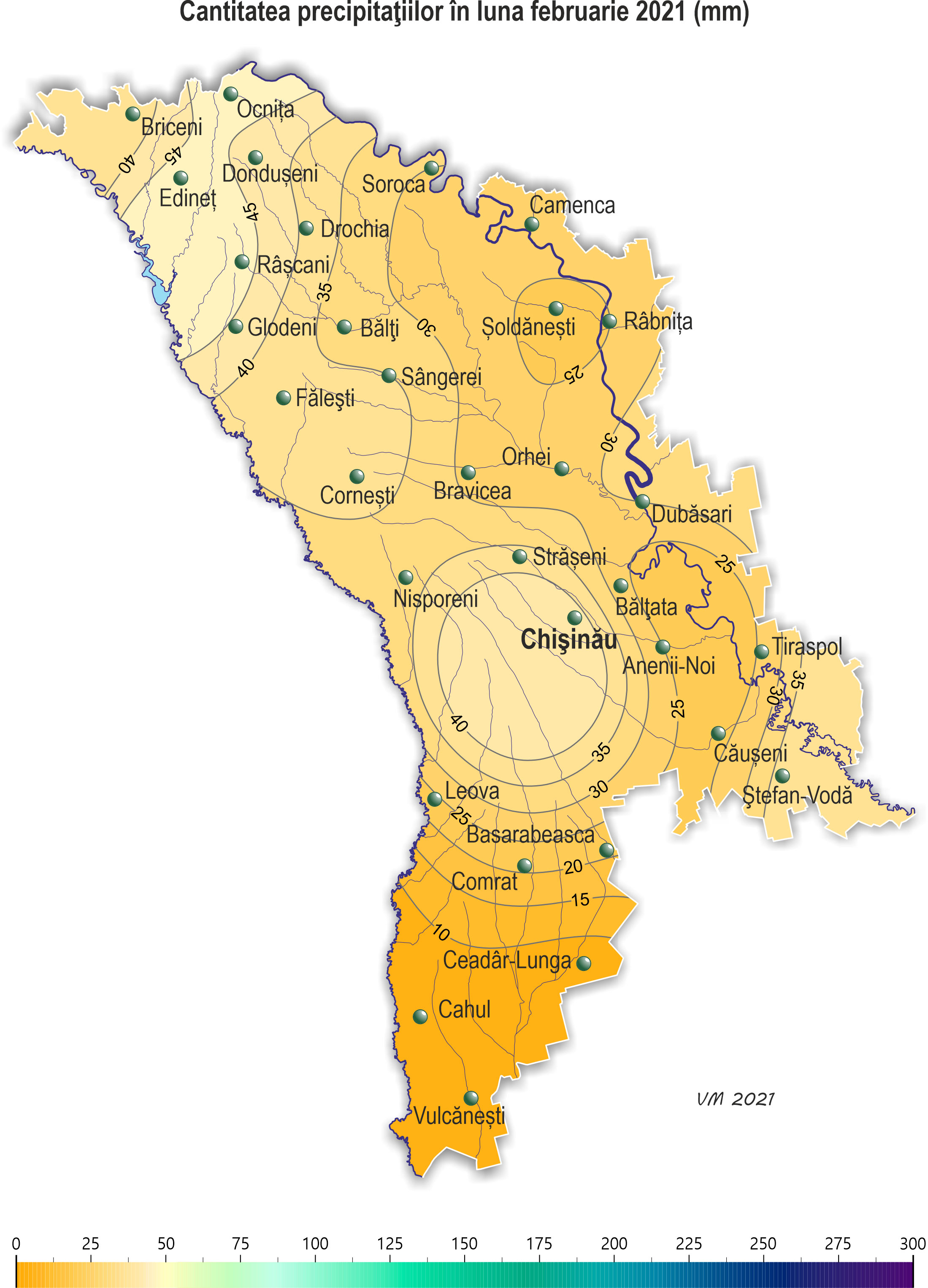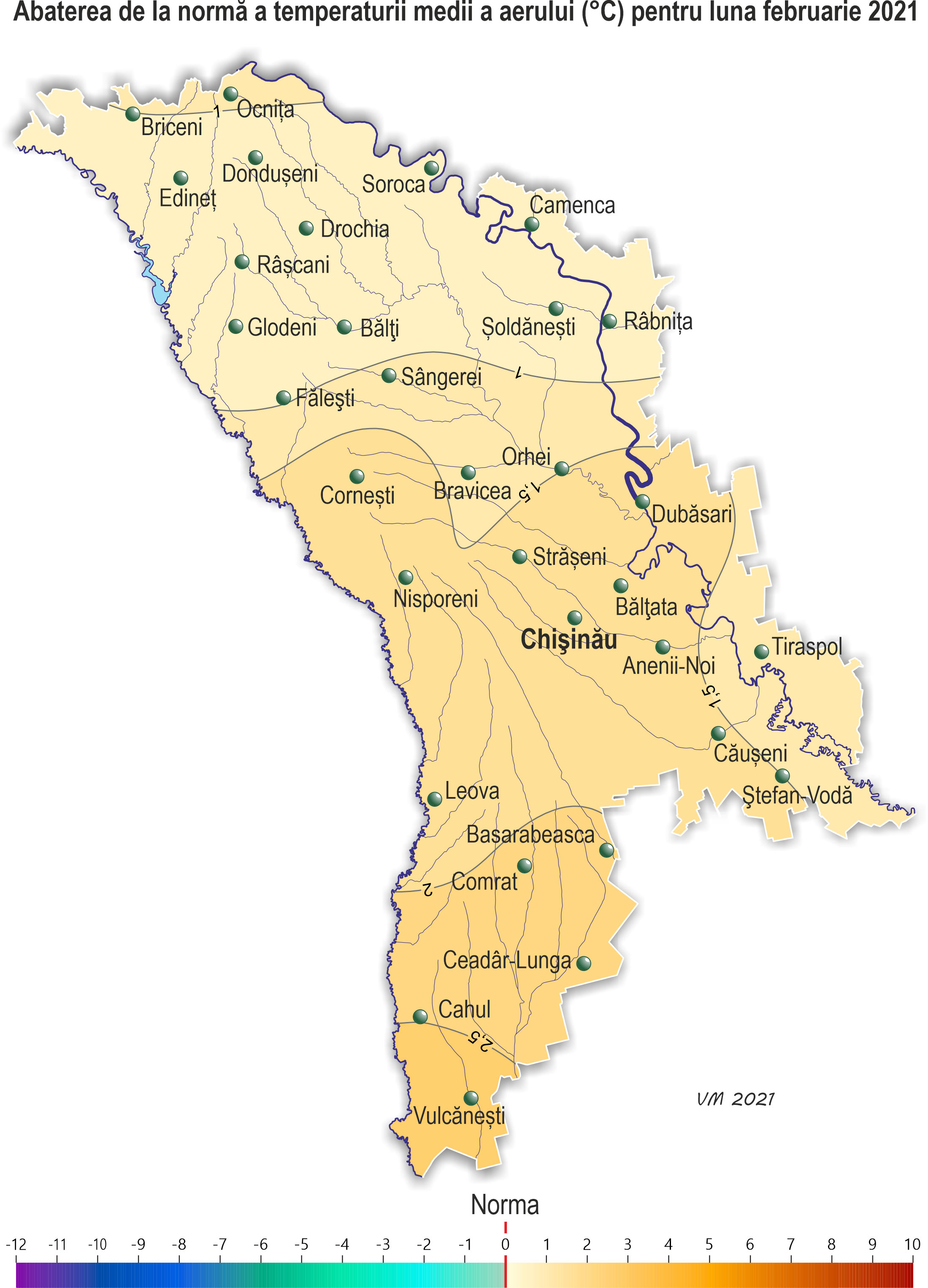 Pe parcursul lunii februarie pe teritoriul ţării s-a semnalat vreme mai caldă ca de obicei și cu precipitații. Temperatura medie lunară a aerului a fost mai ridicată faţă de valorile normei cu 0,6-2,5ºÑ şi a constituit -2,2..+1,5ºÑ. Temperatura maximă a aerului a urcat până la +20ºÑ (staţia meteorologică Bălțata, Chișinău, Comrat, Ceadîr-Lunga), ceea ce în această lună se semnalează în medie o dată în 15-20 ani. Temperatura minimă a aerului a scăzut până la -19ºÑ (stația meteorologică Briceni), ceea ce în această lună se semnalează în medie o dată în 3 ani. Precipitații în decursul lunii au căzut sub formă de zăpadă, lapoviță și ploaie. Suma lunară a acestora pe 90% din teritoriu a constituit 21-48 mm (75-175% din normă), izolat în raioanele extreme din sudul țării – 7-9 mm (20-30% din normă). Cantitatea lunară de precipitații după regiuni a constituit: - în nordul țării 24-48 mm (85-175% din normă); - în centrul țării 27-43 mm (80-135% din normă); - în sudul țării în fond 21-38 mm (75-105% din normă), izolat – 7-9 mm (20-30% din normă). Înveliș de zăpadă s-a stabilit la începutul lunii aproape pretutindeni, cu excepția unor raioane din sudul țării. Grosimea maximă a acestuia pe platformele meteorologice a atins 17 cm (stația meteorologică Fălești). La mijlocul lunii învelișul de zăpadă s-a menținut preponderent în jumătatea de nord a țării, grosimea maximă a acestuia a constituit 7 cm (stația meteorologică Briceni). Spre sfârșitul lunii stratul de zăpadă pretutindeni s-a topit. În decursul lunii februarie s-a semnalat ceață, viscol, depuneri de polei și chiciură, intensificări ale vântului de până la 21 m/s (stația meteorologică Cornești), pe drumuri ghețuș. Pe 8 februarie la stația meteorologică Chișinău s-a semnalat fenomen meteorologic extrem sub formă de polei puternic cu diametrul de 23 mm. La începutul lunii februarie solul a fost înghețat doar în raioanele din nordul țării, adâncimea de îngheț a acestuia nu a depășit 4-8 cm. La sfârșitul decadei a doua solul pretutindeni a fost înghețat, adâncimea de îngheț a acestuia a constituit 10-24 cm. La sfârșitul lunii solului pretutindeni s-a dezghețat. Culturile de toamnă în cea mai mare parte a lunii s-au aflat în stare de repaus vegetativ. Din cauza regimului termic ridicat la sfârșitul lunii februarie s-a semnalat reluarea vegetației culturilor de toamnă, fiind în fond cu 3 săptămâni mai devreme față de termenii obișnuiți. Învelișul de zăpadă pe terenurile cu culturi de toamnă s-a menținut în cea mai mare parte a lunii, preponderent în nordul și centrul țării, înălțimea acestuia a variat de la 1 până la 10 cm. Temperatura minimă a solului la adâncimea nodului de înfrăţire a culturilor de toamnă (3 cm) în decursul lunii a scăzut până la -1..-7ºÑ, fiind mult mai ridicată faţă de valorile critice (-15ºC). Plantaţiile multianuale în decursul lunii s-au aflat în stare de repaus vegetativ. Condiţiile meteorologice au fost satisfăcătoare pentru iernatul culturilor de toamnă și plantaţiilor multianuale.
