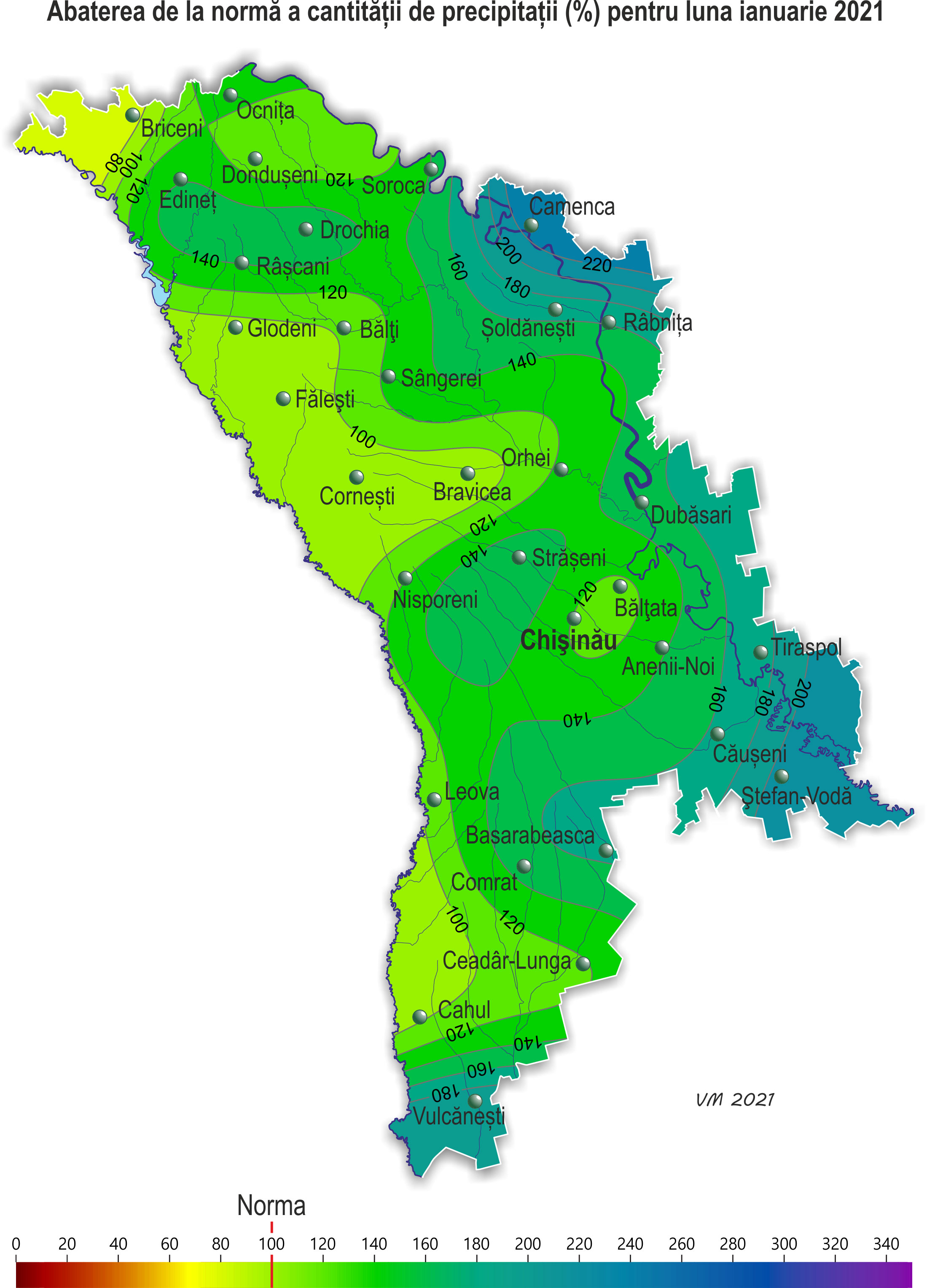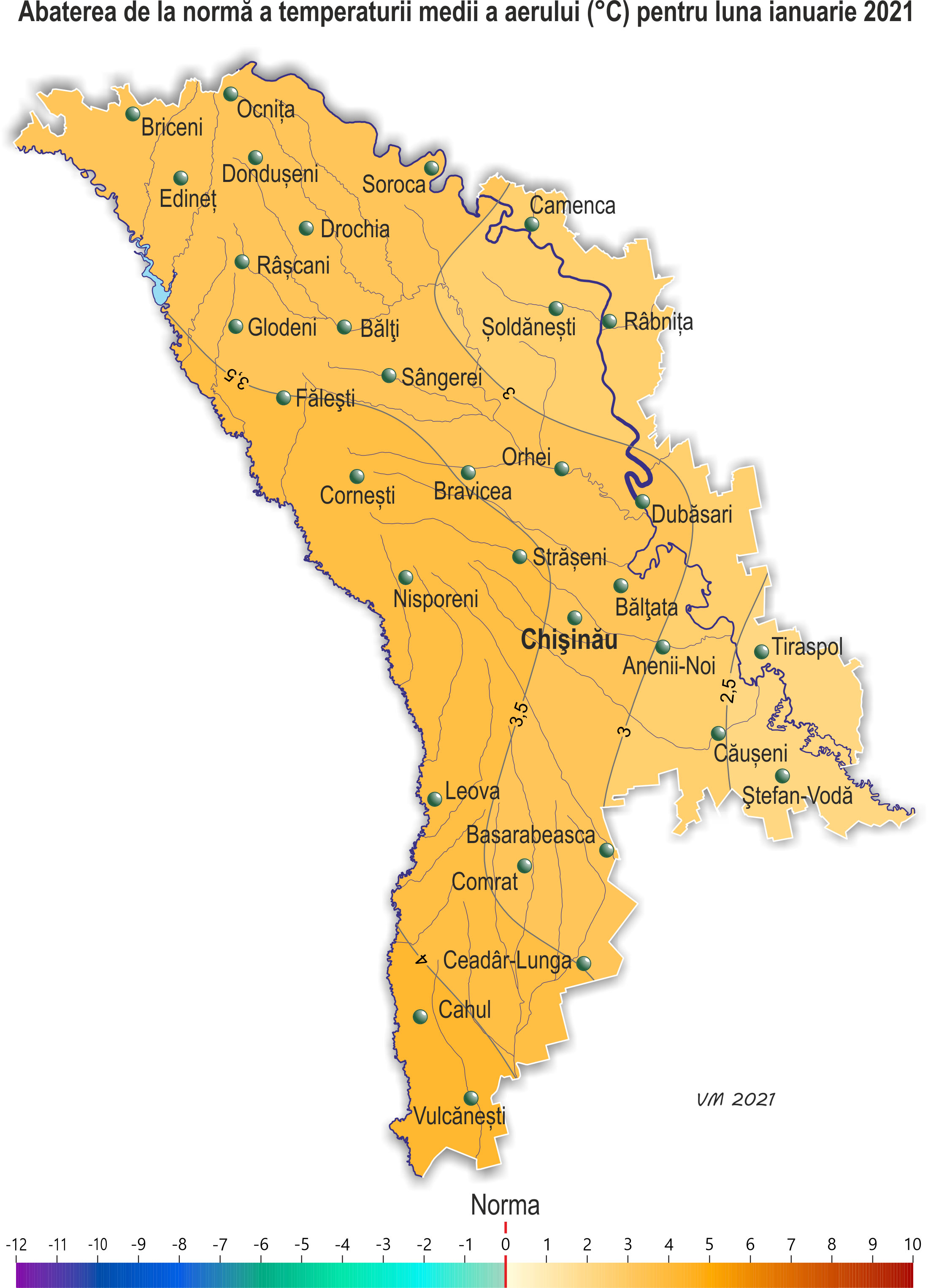 Pe parcursul lunii ianuarie pe teritoriul ţării s-a semnalat vreme neomogenă după regimul termic și cu precipitații. Vreme anomal de caldă s-a semnalat în prima decadă a lunii, temperatura medie decadală a aerului a constituit +1,9..+5,6ºÑ, fiind cu 5,9-7,5ºÑ mai ridicată față de valorile normei și se semnalează în medie o dată în 10-20 ani. Temperatura medie lunară a aerului a fost mai ridicată faţă de valorile normei cu 2-4ºÑ şi a constituit -1,2..+1,7ºÑ. Asemenea regim termic în această perioadă se semnalează în medie o dată în 3-7 ani. Temperatura maximă a aerului a urcat până la +14ºÑ (staţia meteorologică Cornești). Temperatura minimă a aerului a scăzut până la -21ºÑ (stația meteorologică Bălți). Precipitații în decursul lunii au căzut sub formă de zăpadă, lapoviță și ploaie. Suma lunară a acestora a constituit 22-69 mm (70-230% din normă). Cantitatea lunară de precipitații după regiuni a constituit: - în nordul țării în fond 22-40 mm (70-140% din normă), izolat nord-estul țării – 45-65 mm (165-230% din normă); - în centrul țării 30-48 mm (85-150% din normă); - în sudul țării 31-69 mm (110-215% din normă). Condiții meteorologice complicate ale vremii s-au observat pe 27-28 ianuarie. Aproape pretutindeni au căzut precipitații sub formă de zăpadă și lapoviță. Grosimea stratului de zăpadă pe platformele meteorologice în fond a constituit 5-17 cm, iar înălțimea maximă s-a înregistrat la stația meteorologică Ștefan-Vodă – 23 cm. Intensificări ale vântului de până la 15-17 m/s semnalate în jumătatea de sud a țării au contribuit la formarea troienelor pe drumuri, ceea ce a creat condiții dificile pentru traficul rutier. La începutul lunii ianuarie pe teritoriul țării solul a fost în fond dezghețat. În restul zilelor adâncimea de îngheț a solului a variat în fond de la 1 până la 10 cm, la mijlocul lunii adâncimea de îngheț a solului a atins 15-25 cm. La culturile de toamnă din cauza regimului termic ridicat în unele zile din prima decadă a lunii ianuarie s-a semnalat vegetație slabă în orele diurne. În decada a doua și a treia a lunii culturile de toamnă s-au aflat în stare de repaus vegetativ. Înveliș de zăpadă pe terenurile cu culturi de toamnă pe cea mai mare parte a teritoriului țării s-a înregistrat la începutul decadei a doua a lunii. Grosimea acestuia spre sfârșitul decadei a constituit în fond 1-6 cm, izolat învelișul de zăpadă a lipsit. La începutul decadei a treia stratul de zăpadă pretutindeni s-a topit și s-a stabilit din nou la sfârșitul lunii. Stratul de zăpadă la sfârșitul lunii s-a semnalat preponderent în centrul și sudul țării, grosimea acestuia pe terenurile cu culturi de toamnă a variat de la 3 până la 20 cm. Temperatura minimă a solului la adâncimea nodului de înfrăţire a culturilor de toamnă (3 cm) în decursul lunii a scăzut până la -3..-7ºÑ, fiind mult mai ridicată faţă de valorile critice (-15ºC). Plantaţiile multianuale în decursul lunii s-au aflat în stare de repaus vegetativ. Condiţiile meteorologice au fost în fond satisfăcătoare pentru iernatul culturilor de toamnă și plantaţiilor multianuale.