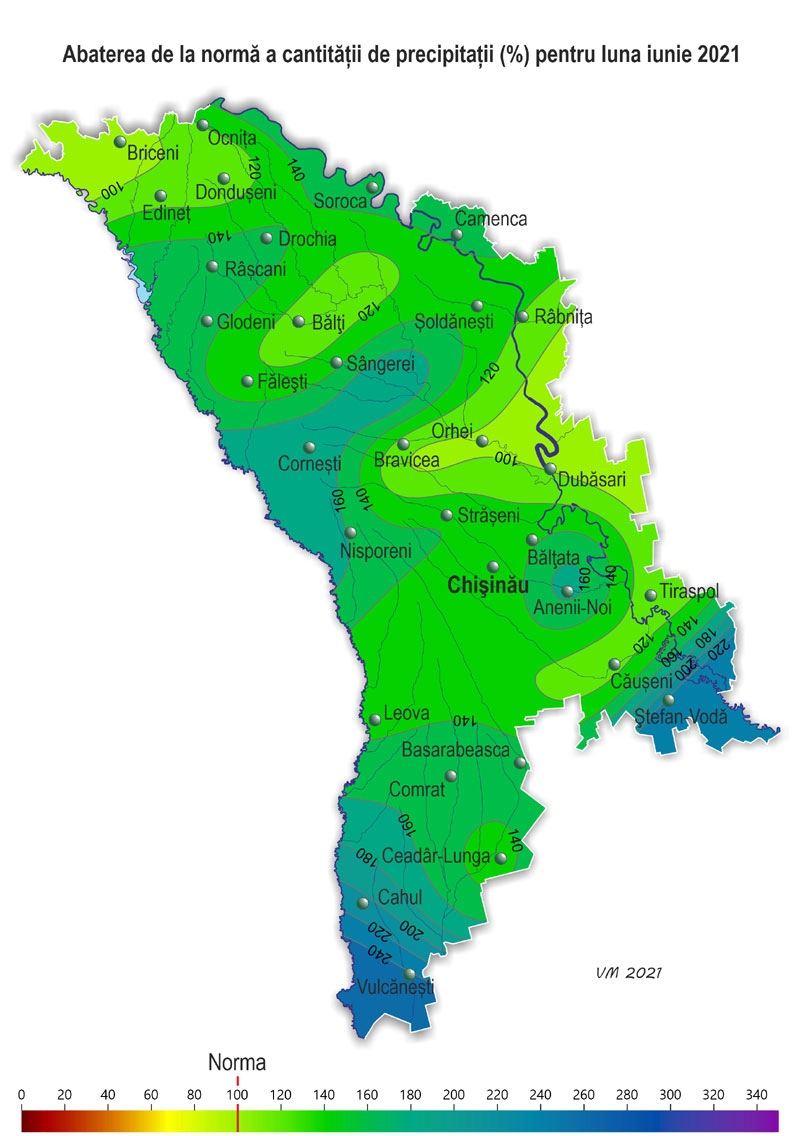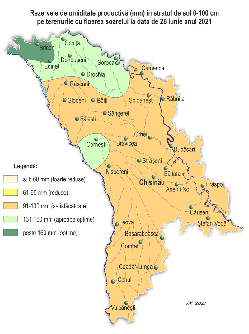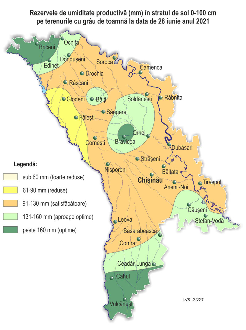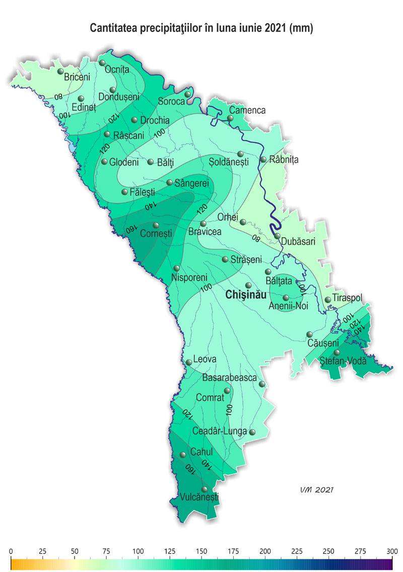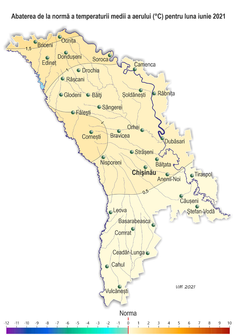 Pe parcursul lunii iunie pe teritoriul ţării s-a semnalat vreme neomogenă după regimul termic și cu precipitații. Temperatura medie lunară a aerului a fost în fond apropiată de valorile normei, doar în nordul și izolat în centrul țării – mai ridicată față de valorile ei cu 1,0-1,5ºÑ și a constituit +19,5..+21,0ºÑ. Temperatura maximă a aerului a urcat până la +35ºÑ (staţia meteorologică Dubăsari). Numărul de zile cu temperatura maximă a aerului de +30ºÑ și mai mult a constituit în teritoriu 3-7 zile (norma fiind de 2-6 zile), Temperatura minimă a aerului a scăzut până la +7ºÑ (stația meteorologică Bravicea, Codrii). Precipitații pe parcursul lunii au căzut neuniform pe teritoriul țării și preponderant sub formă de averse. Numărul total de zile cu precipitații (≥0,1 mm) în luna iunie a constituit în teritoriu de la 11 (Ceadîr-Lunga) până la 19 zile (Ștefan-Vodă), norma fiind de 10-13 zile. Suma precipitațiilor căzute în decursul lunii pe 85% din teritoriu a constituit 68-125 mm (85-160% din normă), în restul teritoriului cantitatea acestora a atins 137-168 mm (175-240% din normă). Suma precipitațiilor căzute după regiuni a constituit: - în nordul țării – 69-137 mm (85-170% din normă); - în centrul țării – 68-161 mm (100-175% din normă); - în sudul țării – în fond 76-100 mm (75-150% din normă), izolat – 148-168 mm (210-245% din normă). Pe parcursul lunii s-au semnalat fenomene meteorologice extreme sub formă de averse puternice: - pe 22 iunie la stația meteorologică Cahul în timp de o oră au căzut 34 mm de precipitații; - pe 26 iunie la stația meteorologică Ștefan-Vodă în timp de 3 ore au căzut 57 mm. De asemenea pe parcursul lunii s-au semnalat oraje, grindină, intensificări ale vântului de până la 19 m/s (stația meteorologică Bălți). Ploile puternice căzute, izolat însoțite de grindină, au cauzat vătămarea culturilor agricole și deteriorarea obiectivelor economiei naţionale. În prima jumătate a lunii iunie condiţiile meteorologice au fost satisfăcătoare pentru creșterea și dezvoltarea culturilor agricole. Vremea ploioasă și umiditatea relativă a aerului ridicată (80% și mai mult) în a doua jumătate a lunii au creat condiții mai puțin favorabile pentru coacerea culturilor de toamnă și celor pomicole, de asemenea au contribuit la dezvoltarea bolilor la culturile agricole. Însă asemenea condiții ale vremii au fost în fond favorabile pentru creșterea și dezvoltarea porumbului, florii-soarelui și plantelor multianuale. La culturile de toamnă în prima jumătate a lunii s-a atestat faza înfloririi, în a doua – coacerea în lapte, la sfârșitul lunii a început coacerea în ceară. Către sfârşitul lunii în sudul țarii unele gospodării au început recoltarea culturilor cerealiere de toamnă. La situaţia din 28 iunie rezervele de umezeală productivă în stratul de sol cu grosimea de 1 m pe terenurile cu culturi de toamnă au constituit: în nordul țării – 80-200 mm (130-230% din normă), în centrul țării – 100-170 mm (130-190% din normă), în sudul țării – 85-180 mm (135-185% din normă). La porumb a continuat formarea frunzelor, la sfârșitul lunii s-a format frunza a noua-a treisprezecea, izolat – frunza a cincisprezecea-a șaptesprezecea. Înălţimea plantelor a constituit în fond 85-170 cm, izolat – 40-70 cm. La situaţia din 28 iunie rezervele de umezeală productivă în stratul de 0,5 m pe terenurile cu porumb au constituit: în nordul țării – 65-85 mm (110-140% din normă), în centrul țării – 60-70 mm (105-135% din normă), în sudul țării – 50-115 mm (80-150% din normă). În stratul de sol cu grosimea de 1 m rezervele de umezeală productivă au constituit: în nordul țării – 125-200 mm (120-150% din normă), în centrul țării –120-150 mm (105-130% din normă), în sudul țării – 100-220 mm (90-155% din normă). La floarea-soarelui în prima parte a lunii s-a atestat formarea frunzelor, în a doua – formarea inflorescențelor. Înălţimea plantelor către sfârşitul lunii a constituit în fond 100-190 cm, izolat – 40-80 cm. La situaţia din 28 iunie rezervele de umezeală productivă în stratul de sol de 0,5 m pe terenurile cu floarea-soarelui au constituit: în nordul țării – 45-85 mm (75-145% din normă), în centrul țării – 40-65 mm (75-110% din normă), în sudul țării – 40-70 mm (70-120% din normă). În stratul de sol cu grosimea de 1 m rezervele de umezeală productivă au constituit: în nordul țării – 100-160 mm (90-145% din normă), în centrul țării – 100-140 mm (80-125% din normă), în sudul țării –100-130 m (85-125% din normă). La semănăturile cu orz de primăvară în prima jumătate a lunii s-a semnalat înspicarea, în a doua jumătate – coacerea în lapte. La sfecla de zahăr a continuat îngroșarea rădăcinii principale, totodată s-a semnalat acoperirea integrală a spațiilor dintre rânduri. La culturile pomicole a continuat creșterea rodului, la cireș, vișin și soiurile timpurii de piersic și cais – coacerea și colectarea roadei. La vița de vie în prima jumătate a lunii a continuat formarea inflorescențelor, în a doua jumătate – înflorirea, spre sfârșitul lunii s-a semnalat creșterea boabelor. La situaţia din 28 iunie rezervele de umezeală productivă în stratul de sol cu grosimea de 1 m pe plantaţiile multianuale au constituit: în nordul țării – 150-175 mm (110-125% din normă), în centrul țării – 110-150 mm (105-145% din normă), în sudul țării – 115-185 mm (100-170% din normă).