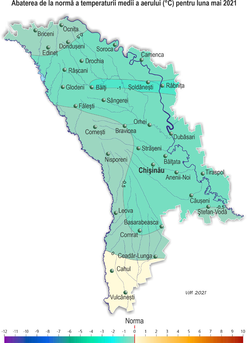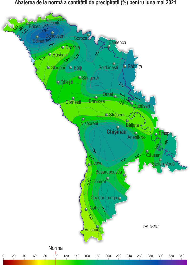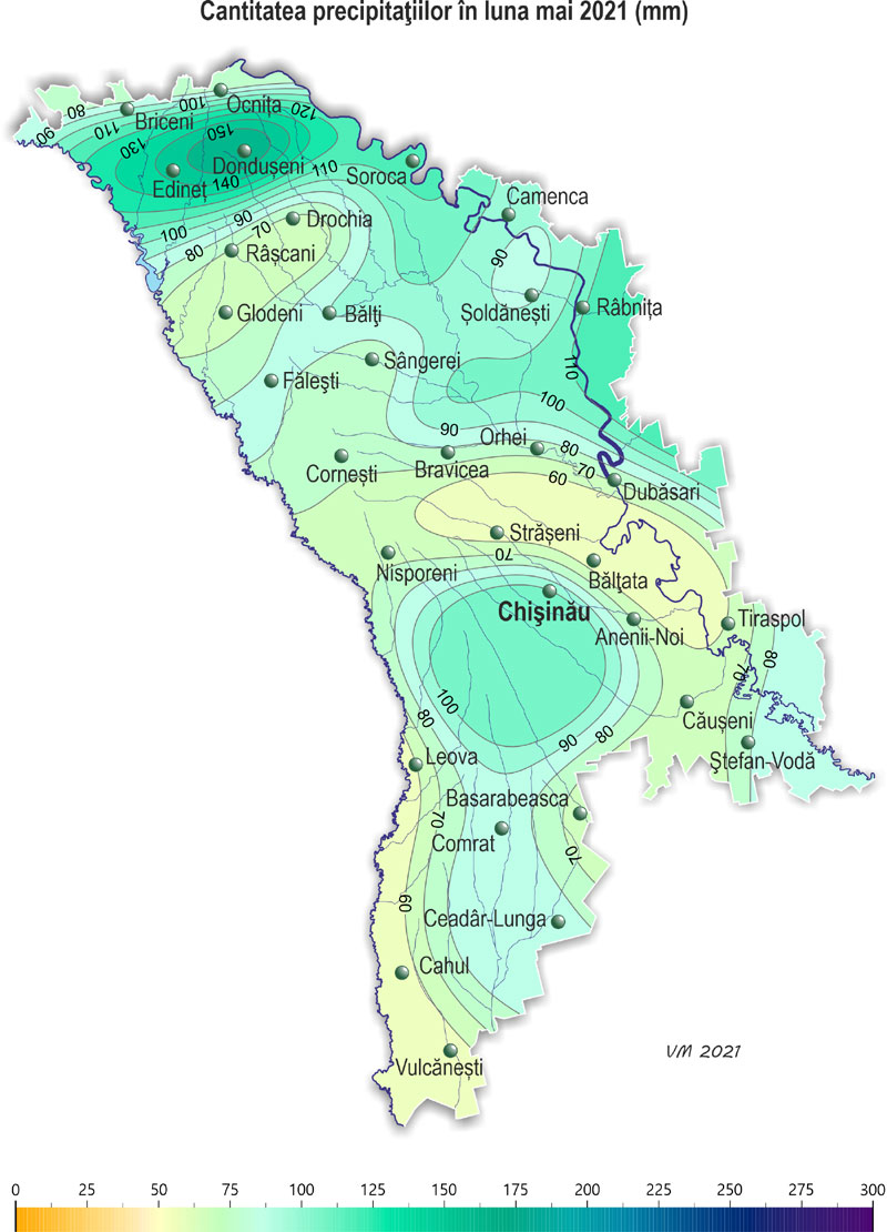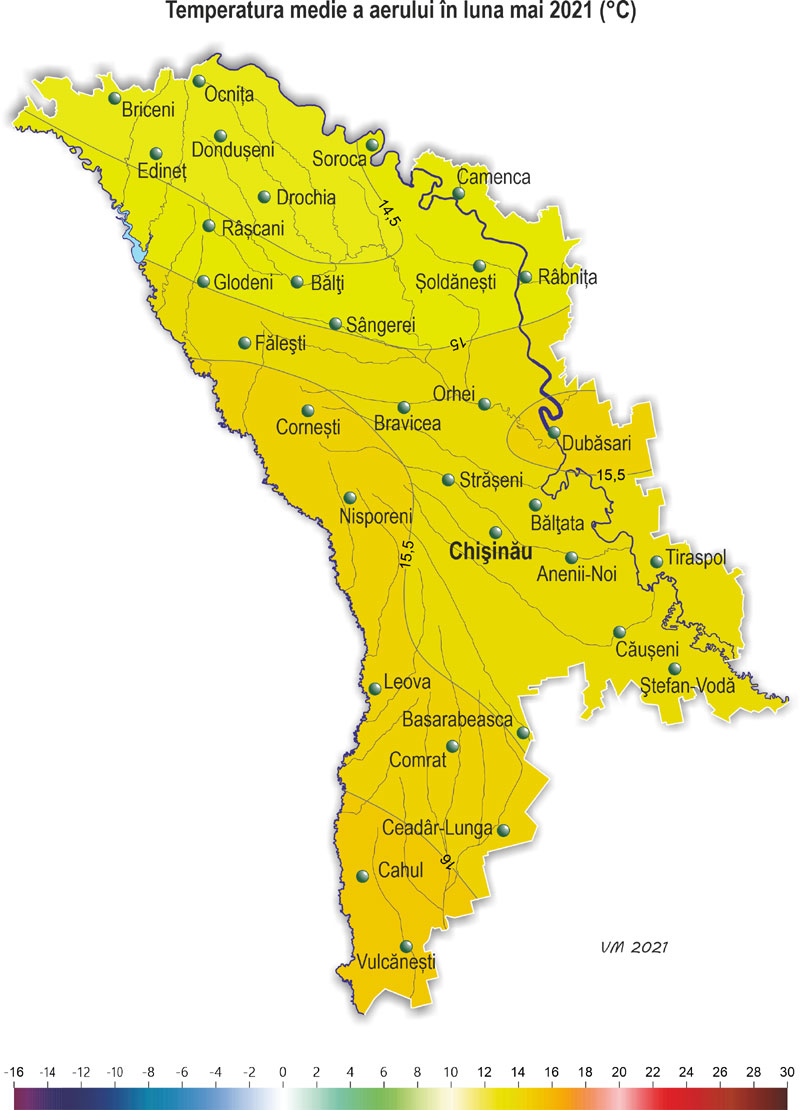Pe parcursul lunii mai pe teritoriul ţării s-a semnalat vreme neomogenă după regimul termic și cu precipitații. Temperatura medie lunară a aerului a constituit +14,0..+16,5ºÑ, fiind pe o mare parte a teritoriului țării mai scăzută faţă de valorile normei cu 0,5-1,0ºÑ, doar izolat în jurul valorilor ei. Temperatura maximă a aerului a urcat până la +29ºÑ (staţia meteorologică Cahul). Numărul de zile cu temperatura maximă a aerului de +25ºÑ și mai mult în luna mai pe teritoriul țării a constituit în fond 1-5 zile (norma fiind 6-11 zile). Temperatura minimă a aerului a scăzut până la +0,3ºÑ (stația meteorologică Codrii). Pe 9 mai izolat la suprafața solului au fost înregistrate înghețuri cu intensitatea de -1ºÑ, iar pe 4, 9 și 10 mai la înălțimea de 2 cm de la suprafața solului cu intensitatea de -1..-5ºÑ. Înghețuri cu astfel de intensitate în această perioadă sunt posibile în medie o dată în 10-30 ani. Suma precipitațiilor în decursul lunii pe 80% din teritoriu a constituit 50-90 mm (100-170% din normă), în restul teritoriului cantitatea acestora a atins 100-160 mm (185-265% din normă). Suma precipitațiilor căzute după regiuni a constituit: - în nordul țării în fond – 65-90 mm (105-170% din normă), izolat – 105-165 mm (185-265% din normă); - în centrul țării – 55-100 mm (110-195% din normă); - în sudul țării – 50-85 mm (100-170% din normă). Condiţiile meteorologice a lunii mai pe cea mai mare parte a teritoriului țării au fost în fond satisfăcătoare pentru creșterea și dezvoltarea culturilor agricole. Vremea ploioasă și umiditatea ridicată a aerului au creat condiții mai puțin favorabile pentru coacerea cireșelor și au contribuit la dezvoltat bolilor la culturile agricole. Ploile puternice căzute pe parcursul lunii, izolat însoţite de grindină, au cauzat vătămarea culturilor agricole și deteriorarea obiectivelor economiei naţionale. La culturile de toamnă în decursul lunii mai s-a atestat faza formării paiului, înspicării și înfloririi. Înălţimea plantelor spre sfârșitul lunii a constituit în fond 45-75 cm, izolat – 80-100 cm. La situaţia din 28 mai rezervele de umezeală productivă în stratul de sol cu grosimea de 0,5 m pe semănăturile cu culturi de toamnă au constituit: 55-125 mm (150-250% din normă), în centrul – 60-80 mm (125-190% din normă), în sud – 40-65 mm (85-135% din normă). În stratul de sol cu grosimea de 1 m rezervele de umezeală productivă în sol au constituit: în nordul țării 105-190 mm (130-185% din normă); în centrul – 120-160 mm (125-180% din normă); în sud – 90-135 mm (95-125% din normă). La semănăturile cu orz de primăvară s-a semnalat formarea paiului. La mazăre s-a semnalat apariția frunzei a treia, spre sfârșitul lunii – apariția inflorescențelor. La sfecla de zahăr a continuat dezvoltarea frunzelor următoare, spre sfârșitul lunii – apariția frunzei a treia și a cincea adevărate, la semănăturile timpurii a început creșterea rădăcinii principale. Majoritatea gospodăriilor la începutul lunii au efectuat semănatul porumbului. În decada a doua a lunii la porumb s-a semnalat încolțirea semințelor și răsărirea, la sfârșitul ei s-a format frunza a treia și a cincea, izolat în raioanele din sudul țării – frunza a șaptea și a noua. Înălţimea plantelor a constituit în fond 5-20 cm, izolat – 30-40 cm. La situaţia din 28 mai rezervele de umezeală productivă în stratul arabil al solului pe semănăturile cu porumb au constituit: în nordul țării 35-60 mm (125-185% din normă), în centrul – 20-35 mm (80-140% din normă), în sud – 20-30 mm (85-100% din normă). În stratul de sol cu grosimea de 1 m rezervele de umezeală productivă au constituit: în nordul țării – 140-205 mm (125-160% din normă), în centrul țării – 130-165 mm (100-120% din normă), în sudul țării – 100-160 mm (90-130% din normă). La floarea-soarelui la începutul lunii s-a semnalat în fond răsărirea, la semănăturile mai timpurii – formarea perechii a doua de frunze adevărate. În decursul lunii mai la floarea-soarelui a continuat formarea următoarelor frunze. Înălţimea plantelor a constituit în fond 15-30 cm, izolat – 5-10 cm. La situaţia din 28 mai rezervele de umezeală productivă în stratul arabil al solului pe terenurile cu floarea-soarelui au constituit: în nordul țării – 25-55 mm (90-190% din normă), în centrul țării – 30-35 mm (90-135% din normă), în sudul țării – 25-35 mm (80-105% din normă). În stratul de sol cu grosimea de 1 m rezervele de umezeală productivă au constituit: în nordul țării – 125-205 mm (100-140% din normă), în centrul țării – 145-155 mm (95-110% din normă), în sudul țării – 110-145 mm (80-105% din normă). La culturile pomicole și nuc pe parcursul lunii s-a semnalat formarea și creșterea rodului, la soiurile timpurii de cireș – începutul coacerii, la vița de vie – formarea inflorescențelor. La situaţia din 28 mai rezervele de umezeală productivă în stratul de sol cu grosimea de 1 m pe plantaţiile multianuale au constituit: în nordul țării – 140-170 mm (110-115% din normă), în centrul țării – 135-200 mm (115-175% din normă), în sudul țării – 115-155 mm (95-160% din normă).