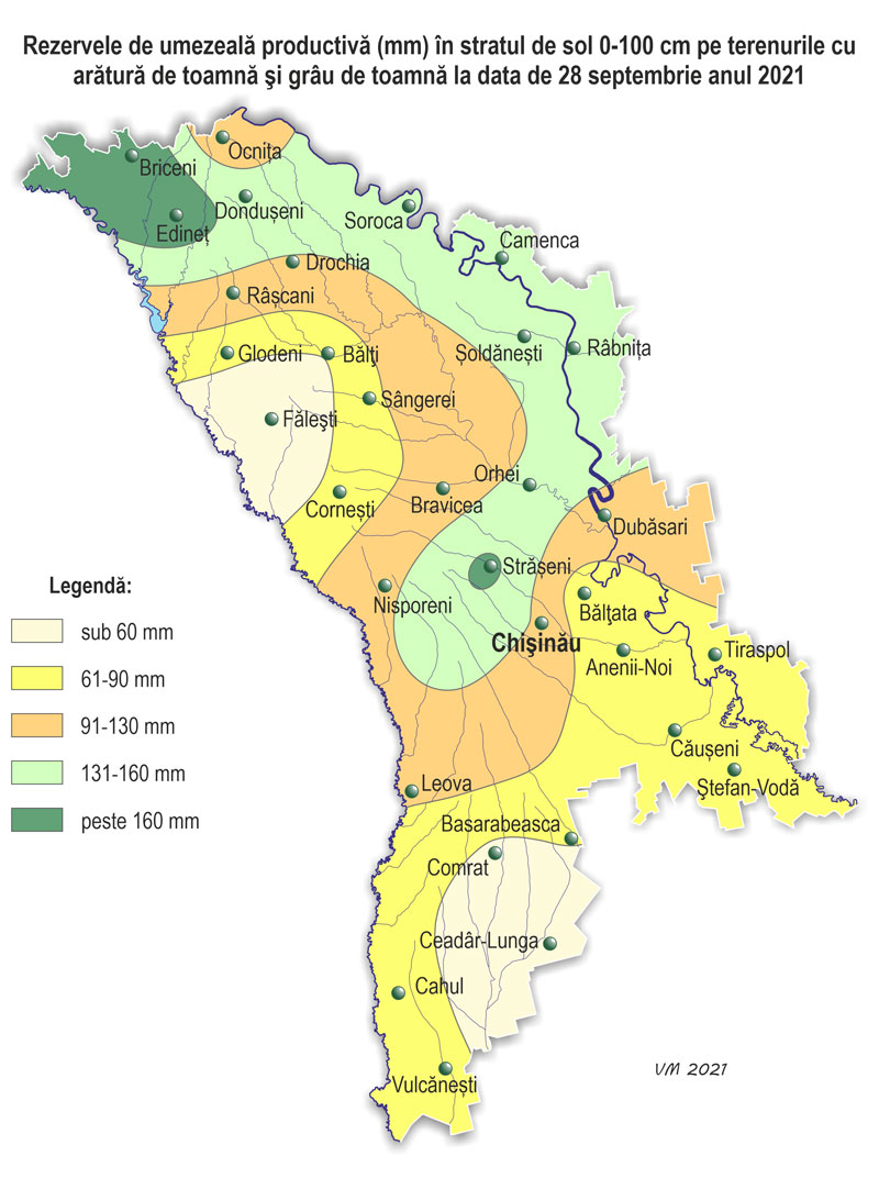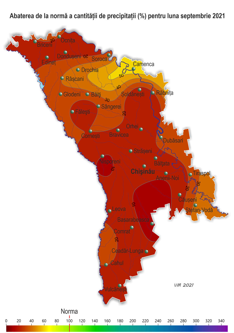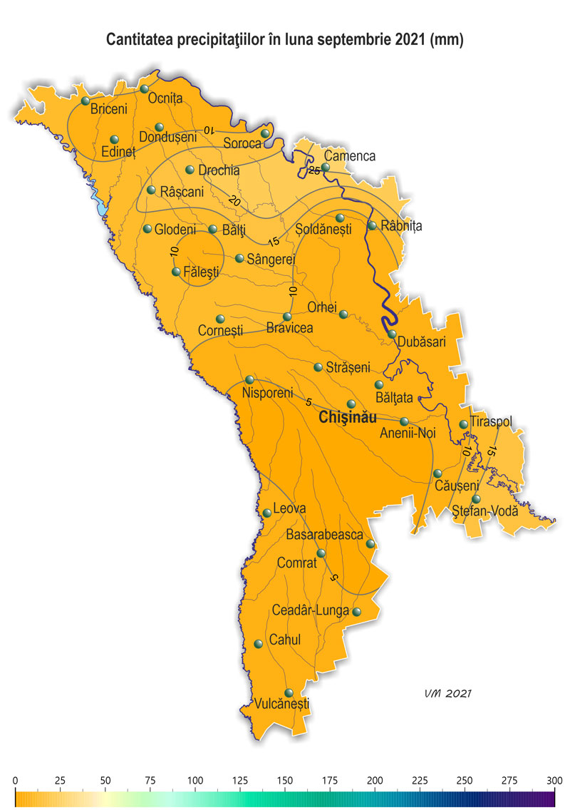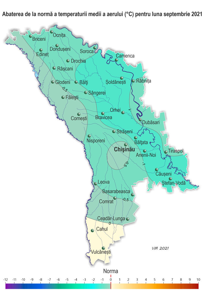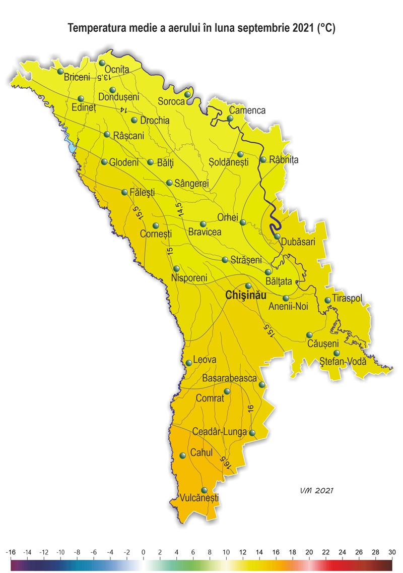 Pe parcursul lunii septembrie pe teritoriul țării s-a semnalat vreme neomogenă după regimul termic și cu deficit de precipitații. Temperatura medie lunară a aerului s-a situat în fond sub valorile normei cu 0,5-1,5ºÑ, izolat în sudul țării – în jurul valorilor acestei și a constituit +13,5..+16,8ºÑ. Temperatura maximă a aerului a urcat până la +30ºÑ (stația meteorologică Ceadîr-Lunga). Temperatura minimă a aerului a scăzut până la +1ºÑ (stația meteorologică Soroca, Rîbnița, Bălțata). Primele înghețuri la suprafața solului cu intensitatea de -1ºÑ (stația meteorologică Râbnița) s-au semnalat pe 28 septembrie. Înghețuri cu asemenea intensitate în această perioadă se semnalează în medie o dată în 5-10 ani. Primele înghețuri la înălțimea de 2 cm de la suprafața solului cu intensitatea de -1ºÑ s-au observat în perioada 6-8 septembrie izolat în centrul și sudul țării, ceea ce în această perioadă se semnalează în medie o dată în 20-30 ani. De asemenea înghețuri la înălțimea de 2 cm de la suprafața solului s-au înregistrat pe 28 și 30 septembrie izolat în nordul și centrul țării cu intensitatea de -1..-2ºÑ. Înghețuri cu asemenea intensitate în această perioadă se semnalează în medie o dată în 5-10 ani. Trecerea stabilă a temperaturii medii a aerului prin valoarea de +15ºÑ în direcția scăderii ei, ce caracterizează sfârșitul verii meteorologice, s-a înregistrat pe 19-20 septembrie, fiind pe o mare parte a teritoriului republicii în termenii obișnuiți, doar în nordul țării cu o săptămână mai târziu. Suma precipitațiilor căzute în decursul lunii pe 95% din teritoriu a constituit 2-19 mm (5-35% din normă), izolat în nordul țării (5% din teritoriu) cantitatea acestora a constituit 23-26 mm (50-60% din normă). Suma precipitațiilor căzute după regiuni a constituit: - în nordul țării – în fond 7-19 mm (15-35% din normă), izolat 23-26 mm (50-60% din normă); - în centrul țării – 5-11 mm (10-20% din normă); - în sudul țării – 2-16 mm (5-35% din normă). Condițiile meteorologice ale lunii au fost în fond favorabile pentru coacerea culturilor pomicole și strugurilor. Însă, din cauza deficitului de precipitații și rezervelor scăzute de umiditate productivă în stratul arabil al solului, predominant în jumătatea de sud a țării, s-au atestat condiții nefavorabile pentru semănatul culturilor de toamnă. La porumb în decursul lunii s-a semnalat coacerea deplină, izolat la semănăturile târzii – coacerea în ceară. La floarea-soarelui pe o mare parte a teritoriului țării la începutul lunii s-a semnalat coacerea deplină și gospodăriile agricole ale țării au început recoltarea roadei. În decursul lunii la culturile pomicole a continuat coacerea rodului. La soiurile de masă a viței de vie a continuat recoltarea roadei, la soirile tehnice s-a semnalat coacerea boabelor, spre sfârșitul lunii gospodăriile agricole au început recoltarea strugurilor. La situația din 28 septembrie rezervele de umezeală productivă în stratul de sol cu grosimea de 1 m pe plantațiile multianuale au constituit: în nordul țării – 70-90 mm (75-85% din normă); în centrul țării – în fond 70-140 mm (75-130% din normă), izolat 35-60 mm (55-65% din normă; în sudul țării – în fond 55-95 mm (80-130% din normă), izolat – 25-40 mm (30-45% din normă). În decursul lunii septembrie gospodăriile agricole au efectuat recoltarea florii-soarelui, porumbului, sfeclei de zahăr, culturilor legumicole, pomicole și strugurilor. Unele gospodării spre sfârșitul lunii au început semănatul culturilor de toamnă. La situația din 28 septembrie rezervele de umezeală productivă în stratul arabil al solului pe terenurile cu arătură de toamnă și semănăturile cu grâu de toamnă au constituit: în nordul țării – 15-35 mm (75-140% din normă), în centrul țării – 15-30 mm (75-145% din normă), în sudul țării – în fond 4-15 mm (20-70% din normă), izolat rezervele de umezeală productivă în sol au lipsit). În stratul de sol cu grosimea de 1 m rezervele de umezeală productivă au constituit: în nordul țării – în fond 70-175 mm (80-140% din normă), izolat – 35-60 mm (45-55% din normă); în centrul țării – 70-125 mm (80-145% din normă), în sudul țării – 55-95 mm (65-100% din normă).