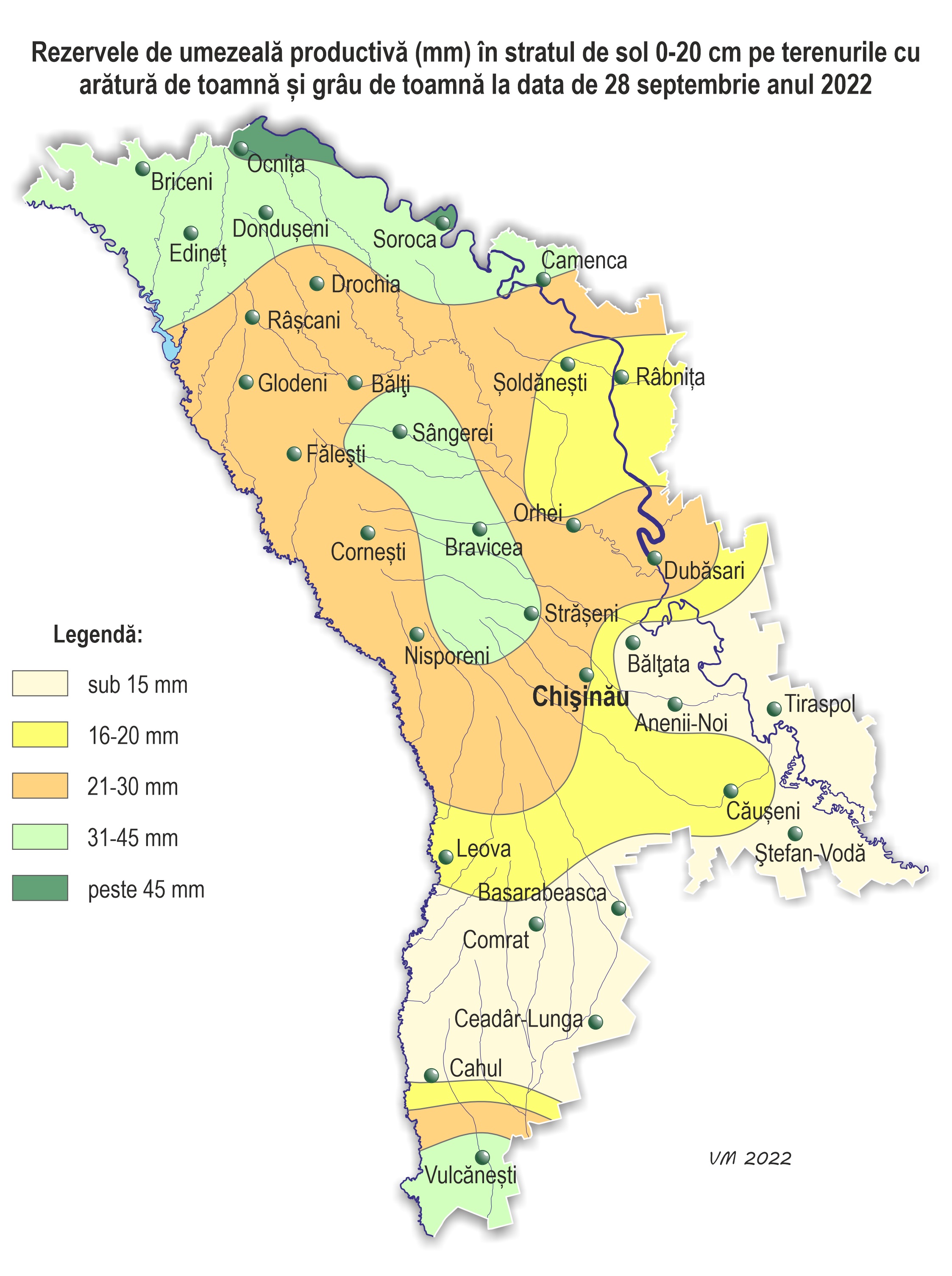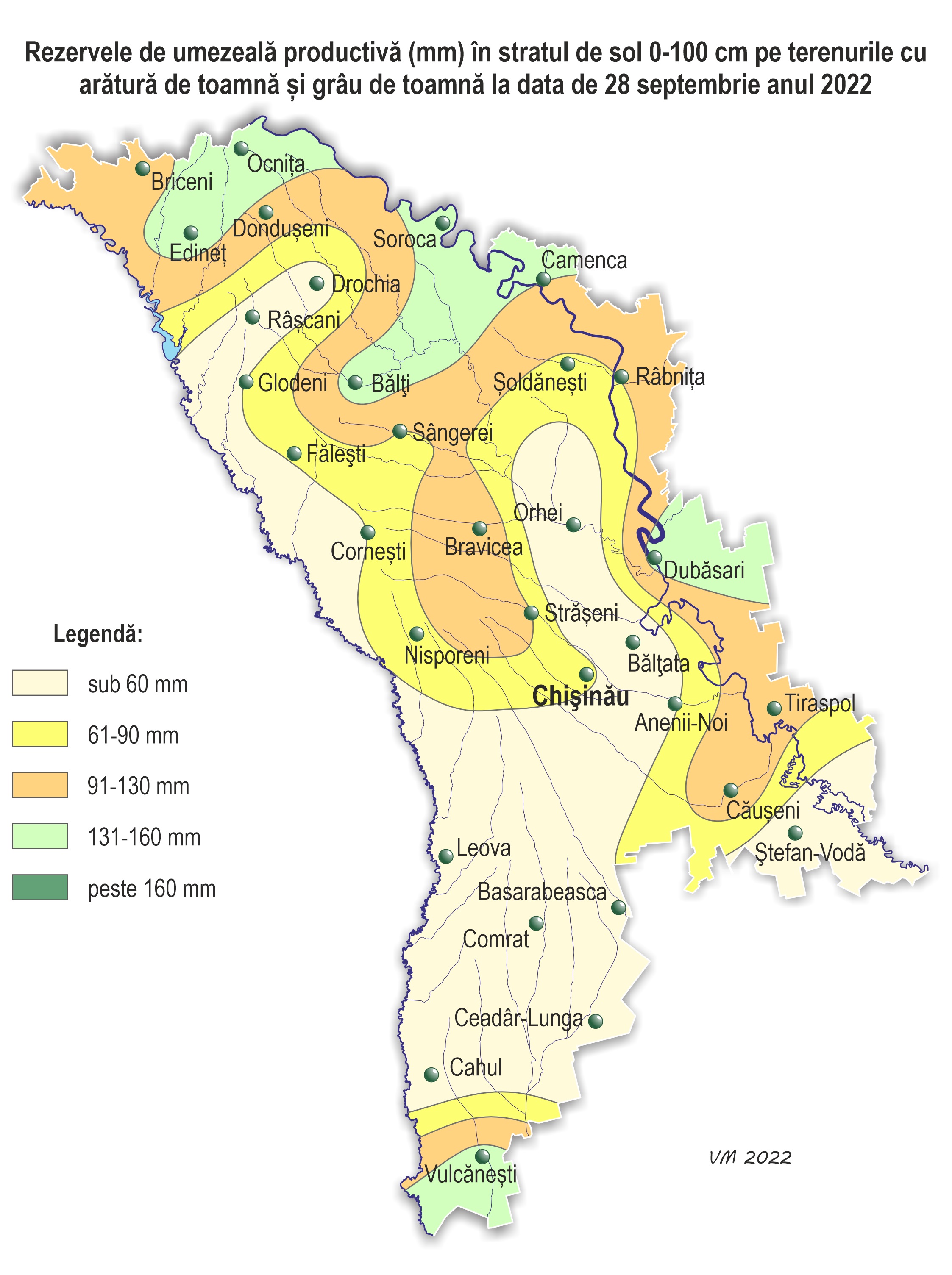 La situaţia din 28 septembrie, rezervele de umezeală productivă al solului la adâncimea de 1m pe terenurile cu arătură de toamnă și cu grâu de toamnă a constituit: