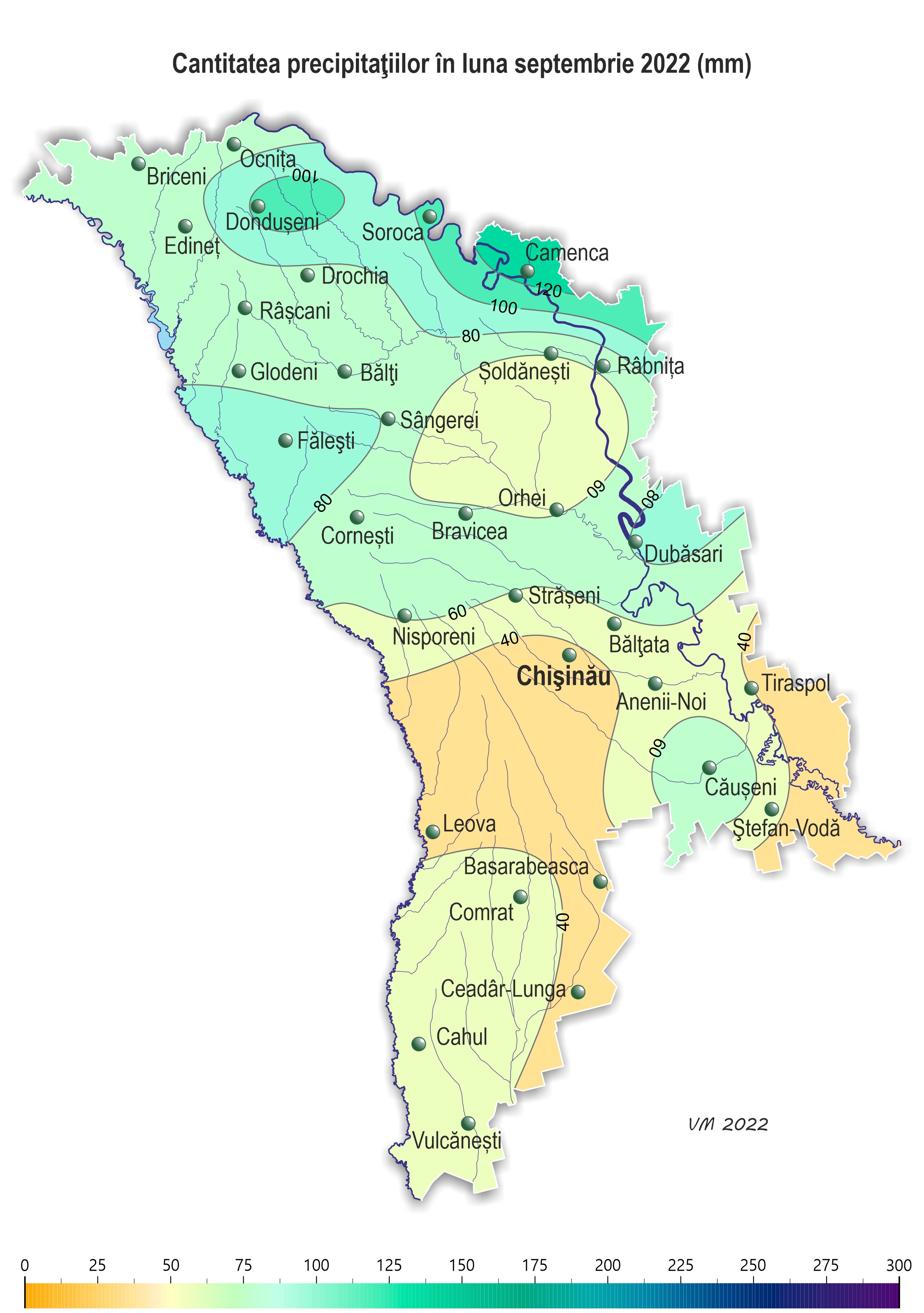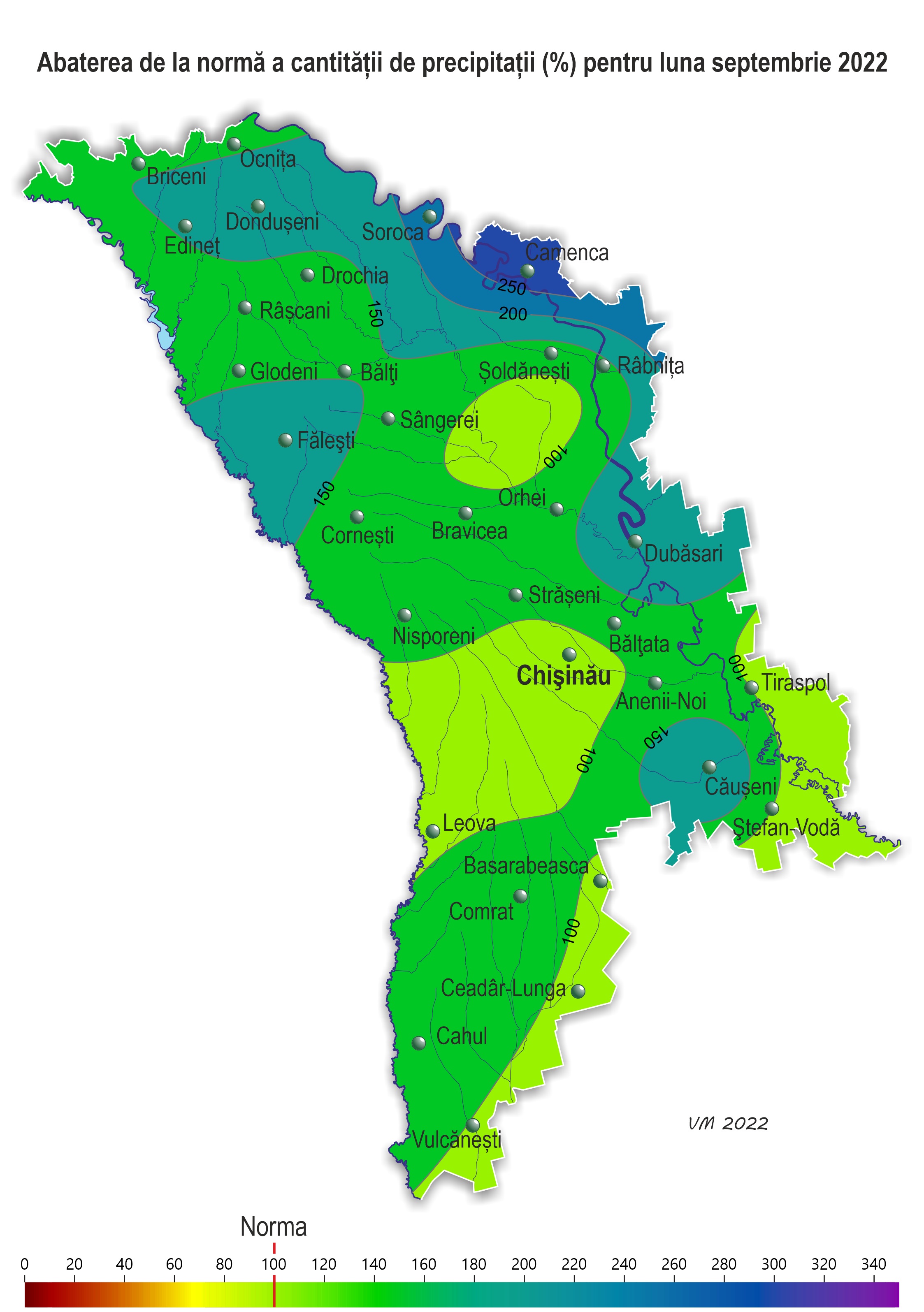 Rezervele de umezeală productivă pe terenurile cu arătură de toamnă și cu grâu de toamnă în stratul arabil al solului și la adâncimea de 1 m reprezintă valori suficiente în majoritatea regiunilor țării, în unele raioane, preponderent în cele de sud – joase. La situaţia din 28 septembrie, rezervele de umezeală productivă în stratul de sol cu adâncimea de 1 m pe terenurile cu culturi multianuale au constituit: – în nordul și centrul țării: în fond 70-105 mm (75-155% din normă), izolat – 15-55 mm (25-65% din normă); – în sud: în fond 50-95 mm (80-155% din normă), izolat – 10-45 mm (30-60% din normă). Rezervele de umezeală în stratul de sol cu adâncimea de 1 m pe terenurile cu culturi multianuale reprezintă în fond valori suficiente, izolat – joase. 3. Prognoză agrometeorologică pentru luna octombrie 2022 (conform datelor multianuale) Regimul termic prognozat pentru luna octombrie va fi în fond favorabil pentru semănatul culturilor de toamnă, cât și pentru creșterea și dezvoltarea culturilor agricole. Cantitatea de precipitații apropiată de valorile normei multianuale va contribui la completarea rezervelor de umiditate productivă în sol. Culturile de toamnă. Gospodării agricole ale țării vor efectua semănatul masiv a culturilor de toamnă. La grâul de toamnă, semănat în luna septembrie, în prima jumătate a lunii octombrie se va semnala frunza a treia, iar în a doua parte a lunii – înfrățirea. Culturile de primăvara. La sfecla de zahăr se va finaliza recoltarea roadei. La culturile pomicole și la vița de vie vor lua sfârșit lucrările de recoltare a roadei, în a doua jumătate a lunii octombrie se va semnala căderea frunzelor.