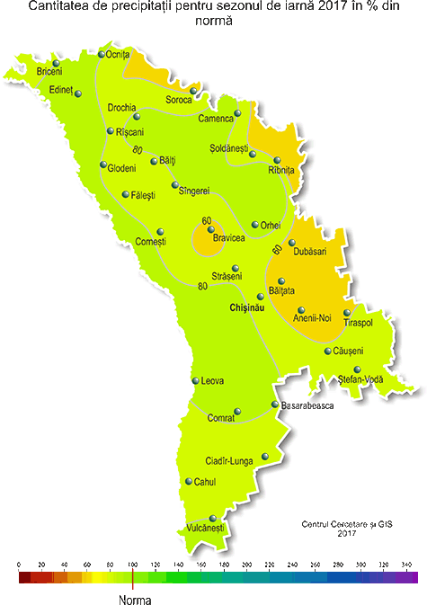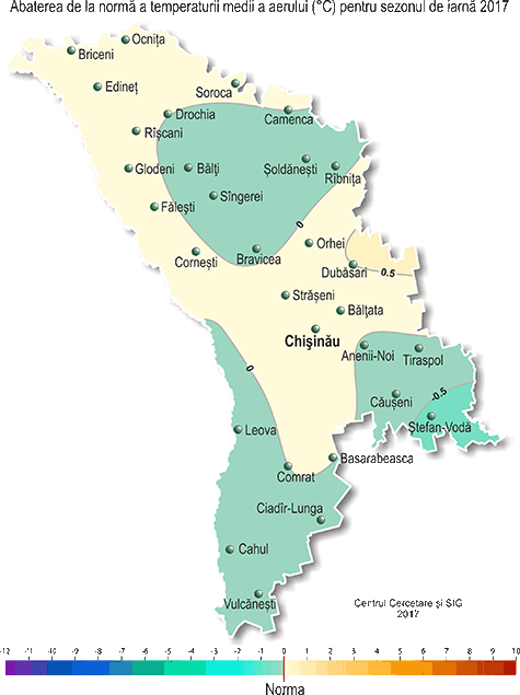 Stratul de zăpadă stabil s-a stabilit în fond pe 6-7 ianuarie şi s-a menţinut pe o mare parte a teritoriului până la 22-23 februarie. Grosimea maximă a acestuia pe platformele meteorologice a atins 28 cm (ianuarie, SM Ceadâr-Lunga). De asemenea stratul de zăpadă s-a semnalat izolat şi în majoritatea zilelor lunii decembrie. Pe 7 ianuarie s-a înregistrat fenomen meteorologic stihinic sub formă de vînt puternic: la SM Leova viteza maximă a vîntului a atins 26 m/s. Pe parcursul sezonului de iarnă s-au semnalat ceaţă, depuneri de chiciură şi polei cu diametrul de până la 1-12 mm, viscol, pe drumuri gheţuş. Comparativ cu iarna anului 2015-16, acest sezon a fost cu 3,0-3,5ºC mai rece şi cu o sumă de precipitaţii similară. Sezon analog după regimul termic este 2012-13. Condiţiile meteorologice pentru iernarea culturilor de toamnă, pomilor fructiferi şi viţei de vie în perioada de iarnă 2016-17 au fost în fond favorabile. Culturile de toamnă şi plantaţiile multianuale în decursul majorităţii perioade de iarnă s-au aflat în stare de repaus vegetativ. În decursul lunii decembrie stratul de zăpadă pe terenurile cu culturi de toamnă s-a semnalat preponderent în raioanele din nordul ţării şi grosimea acestuia nu a depăşit 1-5 cm. Temperatura minimă a solului la adâncimea nodului de înfrăţire a culturilor de toamnă (3 cm) a scăzut până la -1..-5ºC, fiind mai ridicată faţă de valorile critice (-15°C). În o mare parte a lunii decembrie solul a fost dezgheţat. La sfârşitul lunii solul a îngheţat până la 2-11 cm. În luna ianuarie stratul de zăpada pe terenurile cu culturi de toamnă s-a stabilit în fond pe data de 6-7 ianuarie. În prima jumătate a lunii ianuarie înălţimea stratului de zăpadă a variat în fond de la 10 cm pînă la 22 cm. Către sfîrşitul lunii ianuarie grosimea acestuia a constituit în fond 2-10 cm, izolat în raioanele din sud-estul ţării stratul de zăpadă a lipsit. Temperatura minimă a solului la adâncimea nodului de înfrăţire a culturilor de toamnă (3 cm) a scăzut până la -3..-10ºC, fiind mult mai ridicată faţă de valorile critice (-15°C). În decursul lunii ianuarie adâncimea de îngheţ a solului a variat de la 10 pînă la 40 cm. Culturile de toamnă şi plantaţiile multianuale în majoritatea zilelor din luna februarie s-au aflat în stare de repaus vegetativ. Temperatura minimă a solului la adîncimea nodului de înfrăţire a culturilor de toamnă (3 cm) pe parcursul lunii februarie a scăzut pînă la -1..-6ºC, fiind mult mai ridicată faţă de valorile critice (-15°C). Îngheţul solului pe teritoriul ţării s-a semnalat în majoritatea zilelor din luna februarie, adîncimea maximă de îngheţ a solului a constituit 20-56 cm. La sfîrşitul lunii solul pretutindeni a fost dezgheţat. Pentru stabilirea stării culturilor de toamnă, pomilor fructiferi şi viţei de vie în perioada iernatului, pe 25 ianuarie şi 20 februarie 2017 Serviciul Hidrometeorologic de Stat a colectat probe pentru creşterea şi analiza lor. Rezultatele creşterii culturilor de toamnă au demonstrat că procesul de iernare a decurs bine, pieirea culturilor de toamnă în general nu s-a depistat. Izolat pieirea lor a constituit 1-4%, fiind mai joasă de normă (10%). Pe o mare parte a teritoriului cercetat, la culturile pomicole principale nu s-a înregistrat pieirea mugurilor florali, izolat pieirea lor a constituit 1-10%, ceea ce nu a depăşit norma (15%). Rezultatele creşterii lăstarilor viţei de vie au demonstrat, că pe cea mai mare parte a teritoriului cercetat, pieirea ochiurilor la viţa de vie în fond nu s-a înregistrat, izolat a constituit 3-15%, ceea ce nu a depăşit norma (20%). La sfîrşitul lunii februarie, din cauza regimului termic ridicat, a început vegetaţia culturilor de toamnă (cu trei săptămîni mai devreme faţă de termenii obişnuiţi). În raioanele extreme din sudul ţării la sfîrşitul lunii februarie izolat s-a semnalat umflarea mugurilor la soiurile timpurii de cais şi piersic (cu o lună mai devreme faţă de termenii obişnuiţi).