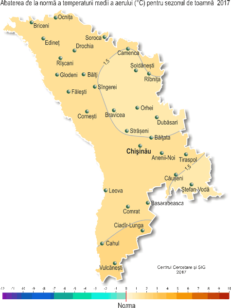 Toamna anului 2017 a fost caldă şi cu precipitaţii. Tipul vremii de toamnă (trecerea stabilă a temperaturii medii zilnice a aerului prin 15°C în direcţia scăderii ei) pe teritoriul ţării s-a stabilit pe 22-27 septembrie, ceea ce în raioanele de nord şi centrale s-a constatat cu o săptămână mai târziu faţă de datele medii multianuale, în cele din sudul ţării fiind în termeni apropiaţi de cei obişnuiţi. Temperatura medie a aerului pe parcursul sezonului de toamnă (septembrie-noiembrie) a constituit în teritoriu +9,9..+12,6ºÑ, fiind cu 1,3-2,2°Ñ mai ridicată faţă de normă şi se semnalează în medie o dată în 5-10 ani.