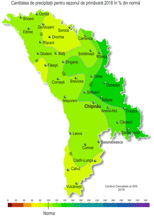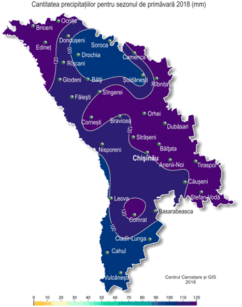 Precipitaţiile pe parcursul sezonului au căzut neuniform. Deosebit de multe precipitaţii s-au semnalat în luna martie, când suma lunară a acestora a constituit în fond 60-120 mm (200-420% din norma lunară), ceea ce pe 65% din teritoriu se semnalează în medie o dată la 20-30 ani. Deficit semnificativ de precipitaţii s-a semnalat în luna aprilie, când suma lunară a acestora pe 80% din teritoriu, în fond în raioanele centrale şi de sud ale ţării, nu a depăşit 1-5 mm (5-15% din norma lunară), iar izolat ele au lipsit. Deficitul de precipitaţii s-a menţinut şi în luna mai. Cantitatea acestora pe parcursul lunilor aprilie-mai a constituit pe teritoriu în fond 10-50 mm (10-55% din normă), ceea ce se semnalează în medie o dată la 10-30 ani. Pe parcursul sezonului s-au înregistrat fenomene meteorologice stihinice sub formă de ninsori abundente cu cantitatea de precipitaţii de până la 20-26 mm în decursul a 12 ore (pe 18 şi pe 23 martie). În luna martie aproape pretutindeni în cea mai mare parte a acesteia (pe 1-8 şi pe 18-28 martie) s-a menţinut stratul de zăpadă. Grosimea maximă a acestuia pe platformele meteorologice a atins 33 cm (24 martie, SM Dubăsari). De asemenea, pe parcursul sezonului s-au semnalat depuneri de chiciură şi polei, viscol, pe drumuri gheţuş, ceaţă, intensificări ale vântului de până la 20 m/s, oraje, grindină. Comparativ cu primăvara anului 2017, acest sezon a fost similar după regimul termic şi cu precipitaţii mai puţine (cu 30-70 mm). Trecerea temperaturii medii zilnice a aerului prin +5ºÑ în acest an s-a semnalat pe 29-30 martie, fiind în raioanele din centrul şi sudul ţării cu o săptămână mai târziu faţă de termenii obişnuiţi, în cele din nord – în fond în termeni apropiaţi de cei obişnuiţi. În majoritatea zilelor din luna martie culturile de toamnă s-au aflat în stare de repaus vegetativ. Reluarea vegetaţiei culturilor de toamnă a început pe 30-31 martie, fiind cu 1-2 săptămâni mai târziu faţa de termenii obişnuiţi. Pe cea mai mare parte a teritoriului ţării culturile de toamnă s-au aflat în faza înfrăţirii, izolat – frunza a treia. Plantaţiile multianuale în decursul lunii s-au aflat în stare de repaus vegetativ. La sfârşitul lunii martie în raioanele extreme din sudul ţării s-a observat umflarea mugurilor la cais şi soiurile timpurii de cireş, fiind aproape de datele medii multianuale. Trecerea stabilă a temperaturii medii zilnice a aerului prin valoarea de +10ºÑ, în direcţia creşterii ei, fenomen ce caracterizează începutul vegetaţiei active a culturilor agricole, a avut loc în perioada 31 martie - 4 aprilie, fiind cu 2 săptămâni mai devreme faţă de termenii obişnuiţi. În prima jumătate a lunii aprilie condiţiile meteorologice au fost în fond favorabile pentru creşterea şi dezvoltarea culturilor de toamnă, pomicole şi viţei de vie, de asemenea pentru semănatul şi răsărirea culturilor cerealiere de primăvară. În a doua jumătate a lunii regimul termic ridicat şi deficitul de precipitaţii au contribuit la evaporarea intensivă a umezelii din stratul superior al solului, fapt care a înrăutăţit condiţiile pentru creşterea şi dezvoltarea culturilor de toamnă, a celor de primăvară şi efectuarea semănatului culturilor tehnice. La culturile de toamnă în decursul lunii aprilie s-a semnalat înfrăţirea şi formarea paiului. La situaţia din 28 aprilie rezervele de umezeală productivă în stratul arabil al solului pe terenurile cu culturi de toamnă în cea mai mare parte a teritoriului au fost joase şi au constituit 5-15 mm (15-65% din normă), izolat, preponderent în raioanele din nordul ţării, ele s-au egalat cu 20-35 mm (70-125% din normă). Rezervele de umezeală productivă în stratul de sol cu grosimea de 1 m au constituit în fond 100-165 mm (75-130% din normă), izolat – 60-90 mm (55-65% din normă). Pe parcursul lunii aprilie gospodăriile agricole ale ţării au efectuat semănatul orzului de primăvară, mazării, sfeclei de zahăr, florii-soarelui, în a doua jumătate a lunii au început semănatul porumbului. Temperatura medie a solului la adâncimea de 10 cm în decursul lunii a variat de la +10..+12ºC la începutul lunii până la +15..+20ºC la sfârşitul ei. La sfârşitul lunii la semănăturile cu orz de primăvară şi mazăre s-au semnalat răsărirea şi frunza a treia, la sfecla de zahăr şi floarea-soarelui – răsărirea, la porumb – încolţirea boabelor şi răsărirea. La culturile pomicole în prima jumătate a lunii aprilie s-a semnalat înflorirea şi desfacerea primelor frunze. Spre sfârşitul lunii la cais, piersic, cireş, prun şi vişin în fond s-a finisat înflorirea şi a început formarea rodului, la măr, păr şi nuc s-a semnalat înflorirea. La viţa de vie în prima jumătate a lunii aprilie s-a semnalat umflarea şi desfacerea ochiurilor, în a doua jumătate a lunii – desfacerea frunzelor, izolat – formarea inflorescenţelor. La situaţia din 28 aprilie rezervele de umezeală productivă în stratul de sol cu grosimea de 1 m pe plantaţiile multianuale au constituit 100-140 mm (75-130% din normă). Din cauza regimului termic ridicat şi deficitul de precipitaţii semnalate în cea mai mare parte a lunii mai, condiţiile meteorologice au fost mai puţin favorabile pentru creşterea şi dezvoltarea culturilor de toamnă, răsărirea şi dezvoltarea culturilor prăşitoare, de asemenea pentru sădirea răsadului şi răsărirea culturilor legumicole. Vreme predominant uscată a contribuit la evaporarea intensivă a umezelii din straturile superioare ale solului şi la micşorarea rezervelor de umezeală productivă acestuia. La culturile de toamnă în decursul lunii mai s-au semnalat fazele: formarea paiului, înspicarea şi înflorirea. Spre sfârşitul lunii pe 30% din teritoriul ţării, preponderent în jumătatea de sud, a început faza coa