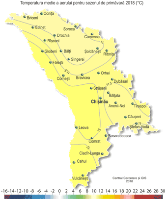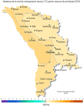 Temperatura maximă a aerului pe parcursul sezonului a urcat până la +33ºÑ (5 mai, SM Dubăsari), ceea ce în această perioadă a anului se semnalează în medie o dată la 20 ani. Temperatura minimă a aerului a scăzut până la -21ºÑ (2 martie, SM Briceni, Bălţi), ceea ce în această perioadă se semnalează în medie o dată la 15 ani. Ultimele îngheţuri în aer s-au semnalat pe 3 aprilie cu intensitatea de până la -2°C. Ultimele îngheţuri la suprafaţa solului cu intensitatea de până la -3°C s-au semnalat izolat pe teritoriu pe 28 aprilie şi la înălţimea de 2 cm de la suprafaţa solului (până la -1ºÑ) – pe 30 aprilie. Vreme anomal de rece s-a semnalat în perioada 18-23 martie. Temperatura medie zilnică a aerului în aceste zile a constituit -4..-8ºÑ, fiind cu 7-11ºÑ mai scăzută faţă de normă, ceea ce în jumătatea a doua a lunii martie se semnalează în medie o dată la 10-20 ani. Vreme anomal de caldă s-a semnalat pe parcursul lunii aprilie, când temperatura medie lunară a aerului a depăşit norma cu 4,5-5,5ºÑ, ceea ce se semnalează pentru prima dată din toată perioadă de observaţii. Vreme foarte caldă s-a menţinut şi în luna mai. Temperatura medie a aerului pe parcursul lunilor aprilie-mai a fost cu 3,0-4,5ºÑ mai ridicată faţă de normă, ceea ce de asemenea se semnalează pentru prima dată din toată perioadă de observaţii. Cantitatea de precipitaţii căzute în decursul sezonului de primăvară pe 80% din teritoriu a constituit 95-145 mm (80-120% din normă), doar la SM Dubăsari şi Bălţata suma lor a atins 150-165 mm (130-140% din normă). Izolat în raioanele de nord şi din sudul ţării au căzut 80-90 mm (70-75% din normă).