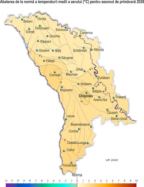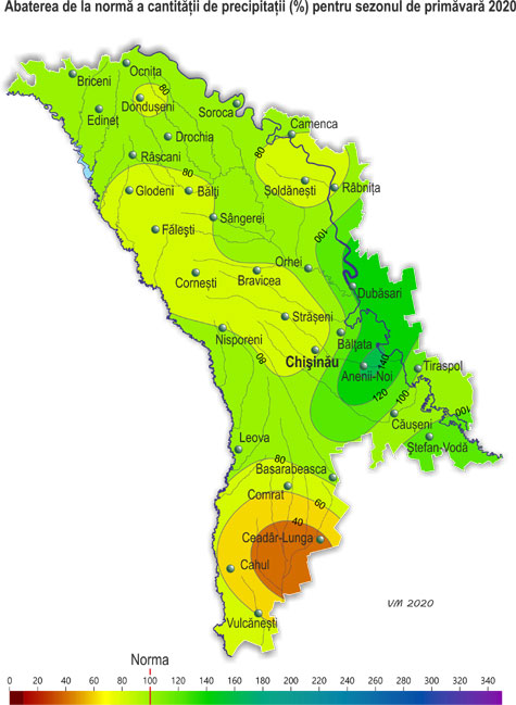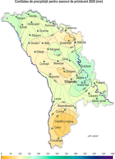 Precipitațiile pe parcursul sezonului au căzut neuniform. Deficit semnificativ de precipitaţii s-a semnalat în luna aprilie, când suma lunară a acestora pe cea mai mare parte a teritoriului nu a depășit 1-10 mm (5-25% din norma lunară), ceea ce se semnalează în medie o dată în 15 ani. Pe parcursul sezonului s-au înregistrat fenomene meteorologice stihinice sub formă de averse foarte puternice: pe 28 mai la SM Ștefan-Vodă și PAM Anenii Noi în timp de 12 ore au căzut 62 și 67 mm corespunzător. Ploile puternice căzute pe parcursul lunii mai, în unele raioane cu grindină, au cauzat vătămarea culturilor agricole, deteriorarea obiectelor economiei naţionale şi deconectarea de la sursele de energie electrică. De asemenea, pe parcursul sezonului s-au semnalat ceaţă, oraje, grindină, intensificări ale vântului de până la 19 m/s. Comparativ cu primăvara anului 2019, acest sezon a fost analogic după temperatura medie a aerului sezonieră și izolat cu cantități mai joase de precipitaţii (cu 50-100 mm). Trecerea stabilă a temperaturii medii zilnice a aerului prin valoarea de +5ºŅ a avut loc în nordul ţării pe 1-2 martie, în restul teritoriului pe 23-24 februarie, fiind cu o lună mai devreme faţă de termenii obişnuiţi. Condiţiile meteorologice în luna martie au fost satisfăcătoare pentru creşterea şi dezvoltarea culturilor de toamnă şi plantaţiilor multianuale. Însă lipsa precipitaţiilor esenţiale şi regimul termic ridicat au contribuit la uscarea stratului superior al solului, ceea ce a complicat pregătirea solului şi efectuarea semănatului culturilor cerealiere timpurii de primăvară. Înghețurile în aer, semnalate în decursul lunii, au creat pericolul de afectare pentru mugurii desfăcuți la culturile pomicole, totodată la sfârșitul lunii izolat au cauzat vătămarea florilor la soiurile timpurii de cais și piersic. În prima jumătatea a lunii martie la culturile de toamnă pe o mare parte a teritoriului republicii s-au semnalat faza înfrățirii, izolat frunza a treia. În a doua jumătatea a lunii pe 70% din teritoriu la culturile de toamnă a continuat înfrăţirea, izolat s-a atestat formarea paiului (în fond cu o lună mai devreme faţă de termenii obişnuiţi). La plantele înfrăţite s-au format în medie câte 1-3 tulpini. Înălţimea plantelor la sfârşitul lunii în fond a constituit 15-25 cm. La situaţia din 28 martie rezervele de umezeală productivă în stratul arabil al solului pe terenurile cu culturi de toamnă în jumătatea de nord a țării au constituit în fond 25-35 mm (70-105% din normă), în jumătatea de sud 5-20 mm (20-45% din normă). În stratul de sol cu grosimea de 1 m rezervele de umezeală productivă în jumătatea de nord a ţării în fond au constituit 75-120 mm (55-90% din normă), în jumătatea de sud 30-70 mm (25-50% din normă), izolat, predominant în nordul țării, ele au constituit 140-185 mm (105-135% din normă). La principalele culturi pomicole în luna martie s-a semnalat umflarea mugurilor, desfacerea mugurilor şi desfacerea primelor frunze. La soiurile timpurii de cais şi piersic la sfârşitul lunii, preponderent în jumătatea de sud a ţării, a început înflorirea, ceea ce în medie cu săptămâni mai devreme faţă de termenii obişnuiţi. La viţa de vie la mijlocul lunii izolat a început circulaţia sevei, la sfârşitul lunii a continuat circulaţia sevei, izolat s-a semnalat umflarea ochiurilor. La situaţia din 28 martie rezervele de umezeală productivă în stratul de sol cu grosimea de 1 m pe plantaţiile multianuale au constituit în fond 45-90 mm (30-60% din normă), izolat în nordul țării 130-135 mm (80-90% din norma). În a doua jumătate a lunii martie unele gospodării agricole ale ţării au început semănatul culturilor cerealiere timpurii de primăvară, florii-soarelui şi sfeclei de zahăr. Temperatura medie a solului la adâncimea de 10 cm în decursul lunii a variat de la +6ºC până la +10ºC. Trecerea stabilă a temperaturii medii zilnice a aerului prin valoarea de +10°C în direcţia creşterii ei, fenomen ce caracterizează începutul vegetaţiei active a culturilor agricole, a avut loc pe 7-8 aprilie, fiind în raioanele din centrul şi sudul ţării cu o săptămână mai devreme faţă de termenii obişnuiţi, în cele de nord - 16-23 aprilie, în fond în termeni apropiaţi de cei obişnuiţi. Deficitul de precipitații și rezervele de umiditate din sol scăzute, semnalate în decursul lunii aprilie, au creat condiţii meteorologice nefavorabile pentru creșterea și dezvoltarea culturilor de toamnă, de primăvară, celor multianuale, totodată şi pentru efectuarea semănatului culturilor prăşitoare. Pe multe semănăturile cu grâu de toamnă s-a semnalat vătămarea din cauza secetei îngălbinirea și uscarea frunzelor inferioare, izolat în sudul țării s-a atestat uscarea paiului. Înghețurile în aer izolat au creat pericolul de afectare la culturile pomicole înflorite. La culturile de toamnă la începutul lunii aprilie pe o mare parte a teritoriului republicii s-a semnalat faza de înfrățire, în restul perioadei formarea paiului. La situaţia din 28 aprilie rezervele de umezeală productivă în stratul arabil al solului pe terenurile cu culturi de toamnă pe o mare parte a teritoriului țării au lipsit sau izolat nu au depășit 1-10 mm (5-35% din normă). Doar în raioanele extreme din nordul țării acestea au constituit 18-20 mm (70-80% din normă). În stratul de sol cu grosimea de 1 m rezervele de umezeală productivă în jumătatea de nord a ţării au fost joase și au constituit în fond 30-70 mm (20-65% din normă), doar izolat 95-160 mm (70-120% din normă), în jumătatea de sud rezervele de umezeală în sol nu au depășit în fond 15-40 mm (15-35% din normă), izolat acestea au scăzut până la 7-10 mm (5-10% din normă). Către sfârșitul lunii aprilie la semănăturile cu or