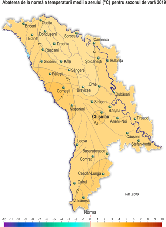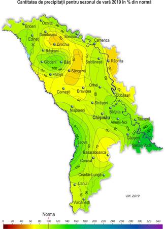 Cele mai multe precipitaţii au căzut în luna iunie. Suma acestora pentru luna pe o mare parte a teritoriului a constituit în fond 80-160 mm (100-200% din norma lunară). În lunile iulie şi august pe o mare parte a teritoriului s-au observat deficit semnificativ de precipitaţii. Astfel, în luna iulie pe 70% din teritoriu cantitatea acestora lunară nu a depăşit 10-35 mm (15-50% din norma lunară), iar în a doua şi a treia decadă a lunii august ele în fond au lipsit. Pe perioada sezonului de vară s-au semnalat fenomene meteorologice stihinice sub formă de ploi torenţiale şi grindină (iunie, iulie), de asemenea vântul puternic cu viteza maxima de până la 27 m/s (3 iulie, SM Ceadâr-Lunga), care au cauzat vătămarea culturilor agricole, deteriorarea obiectelor economiei naţionale şi deconectarea de la sursele de energie electrică. Comparativ cu vara din anul 2018 acest sezon a fost analogic privind temperatura medie a aerului sezonieră şi doar izolat cu precipitaţii mai puţine (cu 20-65 μμ). Conform datelor de observaţii agrometeorologice, condiţiile de vreme în cea mai mare parte a perioadei de vară au fost în fond satisfăcătoare pentru creşterea şi dezvoltarea culturilor agricole. Însă din cauza vremii secetoase menţinută în o mare parte a lunii august, s-au creat condiţii mai puţin favorabile pentru formarea recoltei culturilor agricole şi pregătirea terenurilor pentru semănatul culturilor de toamnă. La culturile de toamnă în prima jumătate a lunii iunie s-a semnalat coacerea în lapte, izolat la începutul lunii înflorirea, în a doua jumătate a lunii coacerea în ceară, spre sfârşitul lunii izolat coacerea deplină a boabelor. La porumb a continuat formarea frunzelor, spre sfârşitul lunii iunie s-a format în fond frunza a cincisprezecea - a nouăsprezecea, izolat frunza a unsprezecea - a treisprezecea. Înălţimea plantelor s-a egalat în fond cu 130-210 cm, izolat 70-105 cm. La situaţia din 28 iunie rezervele de umezeală productivă în stratul de sol cu grosimea de 0,5 m pe terenurile cu porumb în fond au constituit 45-75 mm (85-120% din normă), izolat 30-35 m (60-70% din normă), în stratul de sol cu grosimea de 1 m 80-160 mm (70-130% din normă). La floarea-soarelui în prima jumătate a lunii iunie a continuat formarea frunzelor, în a doua jumătate s-a semnalat apariţia inflorescenţelor, spre sfârşitul lunii izolat a început înflorirea. Înălţimea plantelor s-a egalat în fond cu 105-185 cm, izolat la semănăturile mai târzii 80-95 cm. La situaţia din 28 iunie rezervele de umezeală productivă în stratul de sol cu grosimea de 0,5 m pe terenurile cu floarea-soarelui în fond au constituit 45-90 mm (75-150% din normă), izolat 20-30 mm (35-55% din normă). În stratul de sol cu grosimea de 1 m acestea au constituit în fond 75-160 mm (80-140% din normă), izolat 40-65 mm (45-55% din normă). La semănăturile cu orz de primăvară în prima jumătatea a lunii iunie s-a semnalat înspicarea, în a doua jumătatea coacerea în lapte, spre sfârşitul lunii a început coacerea în ceară. La sfecla de zahăr a continuat creşterea rădăcinii principale şi s-a semnalat acoperirea integrală a spaţiilor dintre rânduri. La culturile pomicole în fond a continuat creşterea rodului, la vişin, cireş şi soirile timpurii de cais şi piersic coacerea şi recoltarea roadei. La viţa de vie în prima jumătate a lunii s-a semnalat înflorirea, în a doua jumătate a început creşterea boabelor. La situaţia din 28 iunie rezervele de umezeală productivă în stratul de sol cu grosimea de 1 m pe plantaţiile multianuale în fond au constituit 75-140 mm (80-120% din normă), izolat în raioanele din sudul ţării 60-70 mm (55-65% din normă). În decursul lunii iulie condiţiile meteorologice în fond au fost satisfăcătoare pentru formarea roadei de porumb, florii-soarelui, sfeclei de zahăr, culturilor pomicole, viţei de vie, cât şi pentru creşterea şi dezvoltarea culturilor legumicole şi altor culturi agricole. În prima decadă a lunii iulie a început recoltarea în masă a cerealelor, fiind în fond cu 1-2 săptămâni mai devreme de termenii obişnuiţi. Spre sfârşitul lunii gospodăriile agricole ale ţării în fond au finisat recoltarea culturilor cerealiere. Condiţiile meteorologice pentru efectuarea recoltării au fost, în general, favorabile. La porumb pe parcursul lunii iulie s-a semnalat formarea paniculului, înflorirea paniculului şi ştiuletelui, la sfârşitul lunii a început coacerea în lapte. Înălţimea plantelor la sfârşitul lunii s-a egalat în fond cu 180-265 cm. La situaţia din 28 iulie rezervele de umezeală productivă în stratul de sol cu grosimea de 1 m pe terenurile cu porumb în cea mai mare parte a teritoriului au constituit 30-60 mm (25-65% din normă), izolat 80-95 mm (80-100% din normă). La floarea-soarelui în decursul lunii iulie s-a semnalat înflorirea şi creşterea capitolului, la sfârşitul lunii izolat a început coacerea seminţelor. Înălţimea plantelor la sfârşitul lunii s-a egalat în fond cu 130-200 cm. Diametrul capitolului a constituit în fond 18-24 cm, izolat 12-16 cm. La situaţia din 28 iulie rezervele de umezeală productivă în stratul de sol cu grosimea de 1 m pe terenurile cu floarea-soarelui pe o mare parte a teritoriului au constituit 25-65 mm (20-70% din normă), izolat în nordul ţării 80-120 mm (80-100% din normă). La sfecla de zahăr a continuat creşterea rădăcinii principale. La culturile pomicole a continuat creşterea rodului, la piersic, cais, prun şi soiurile timpurii de măr coacerea şi recoltarea roadei. La viţa de vie a continuat creşterea rodului, spre sfârşitul lunii la soiurile timpurii a început coacerea boabelor. La situaţia din 28 iulie rezervele de umezeală productivă în stratul de sol cu grosimea de 1 m pe plantaţiile multianuale în fond au constituit 35-55 mm (30-60% din normă), izo