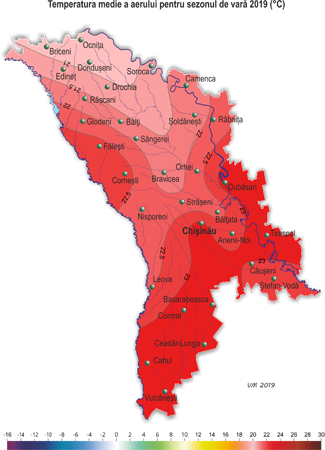 Vara anului 2019 în Republica Moldova a fost în fond caniculară şi pe o mare parte a teritoriului cu precipitaţii. Trecerea stabilă a temperaturii medii zilnice a aerului prin valoarea de +15ºC, fenomen ce determină începutul verii meteorologice, a avut loc pe teritoriul ţării pe 12-13 mai, fiind în termeni apropiaţi de cei obişnuiţi. Temperatura medie a aerului pentru acest sezon a constituit în teritoriu +20,8..+23,4ºΡ, fiind în fond cu 2,0-3,1ºΡ mai ridicată faţă de normă, ceea ce se semnalează în medie o dată în 10-15 ani din toată perioada de observaţii, iar în ultimii 20 de ani în medie o dată în 3-5 ani.