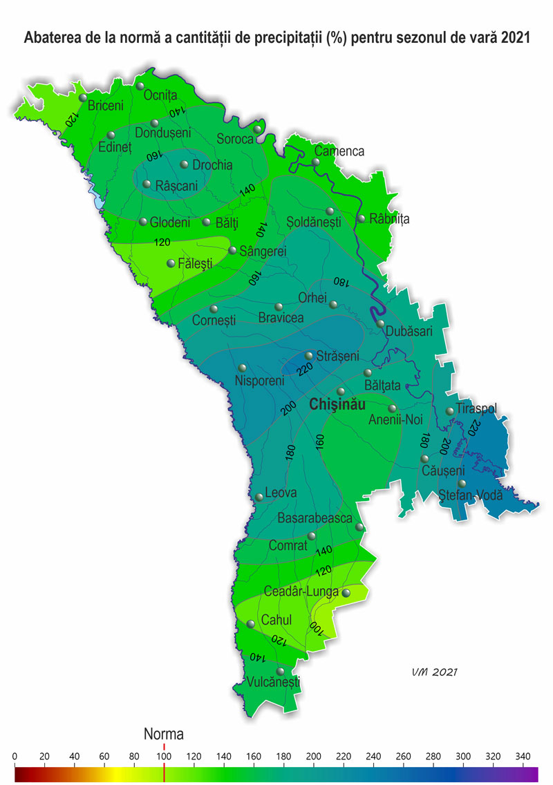 Pe perioada sezonului de vară s-au semnalat fenomene meteorologice extreme sub formă de ploi torenţiale și grindină (iunie-august), care au cauzat vătămarea culturilor agricole şi deteriorarea obiectelor economiei naţionale. Comparativ cu vara din anul 2020, temperatura medie a aerului în acest sezon a fost cu 0,5-1,5ºC mai scăzută și precipitaţii au căzut mai multe (cu 100-300 mm). Sezon analog după regimul termic este 2017. Pe parcursul sezonului de vară condiţiile meteorologice au fost, în fond, favorabile pentru formarea roadei la porumb, florii-soarelui, sfeclei de zahăr, de asemenea pentru creșterea și dezvoltarea culturilor legumicole, culturilor pomicole și viței de vie. În prima jumătate a lunii iunie condiţiile meteorologice au fost satisfăcătoare pentru creșterea și dezvoltarea culturilor agricole. Vremea ploioasă și umiditatea relativă a aerului ridicată (80% și mai mult) în a doua jumătate a lunii au creat condiții mai puțin favorabile pentru coacerea culturilor de toamnă și celor pomicole, de asemenea au contribuit la dezvoltarea bolilor la culturile agricole. Însă asemenea condiții ale vremii au fost în fond favorabile pentru creșterea și dezvoltarea porumbului, florii-soarelui și plantelor multianuale. La culturile de toamnă în prima jumătate a lunii iunie s-a atestat faza înfloririi, în a doua – coacerea în lapte, la sfârșitul lunii a început coacerea în ceară. Către sfârşitul lunii iunie în sudul țarii unele gospodării au început recoltarea culturilor cerealiere de toamnă. La situaţia din 28 iunie rezervele de umezeală productivă în stratul de sol cu grosimea de 1 m pe terenurile cu culturi de toamnă au constituit: în nordul țării – 80-200 mm (130-230% din normă), în centrul țării – 100-170 mm (130-190% din normă), în sudul țării – 85-180 mm (135-185% din normă). La porumb a continuat formarea frunzelor, la sfârșitul lunii iunie s-a format frunza a 9-a – 13-a, izolat – frunza a 15-a – 17-a. Înălţimea plantelor a constituit în fond 85-170 cm, izolat – 40-70 cm. La situaţia din 28 iunie rezervele de umezeală productivă în stratul de 0,5 m pe terenurile cu porumb au constituit: în nordul țării – 65-85 mm (110-140% din normă), în centrul țării – 60-70 mm (105-135% din normă), în sudul țării – 50-115 mm (80-150% din normă). În stratul de sol cu grosimea de 1 m rezervele de umezeală productivă au constituit: în nordul țării – 125-200 mm (120-150% din normă), în centrul țării –120-150 mm (105-130% din normă), în sudul țării – 100-220 mm (90-155% din normă). La floarea-soarelui în prima parte a lunii iunie s-a atestat formarea frunzelor, în a doua – formarea inflorescențelor. Înălţimea plantelor către sfârşitul lunii a constituit în fond 100-190 cm, izolat – 40-80 cm. La situaţia din 28 iunie rezervele de umezeală productivă în stratul de sol de 0,5 m pe terenurile cu floarea-soarelui au constituit: în nordul țării – 45-85 mm (75-145% din normă), în centrul țării – 40-65 mm (75-110% din normă), în sudul țării – 40-70 mm (70-120% din normă). În stratul de sol cu grosimea de 1 m rezervele de umezeală productivă au constituit: în nordul țării – 100-160 mm (90-145% din normă), în centrul țării – 100-140 mm (80-125% din normă), în sudul țării – 100-130 m (85-125% din normă). La semănăturile cu orz de primăvară în prima jumătate a lunii iunie s-a semnalat înspicarea, în a doua jumătate – coacerea în lapte. La sfecla de zahăr a continuat îngroșarea rădăcinii principale, totodată s-a semnalat acoperirea integrală a spațiilor dintre rânduri. La culturile pomicole a continuat creșterea rodului, la cireș, vișin și soiurile timpurii de piersic și cais – coacerea și colectarea roadei. La vița de vie în prima jumătate a lunii iunie a continuat formarea inflorescențelor, în a doua jumătate – înflorirea, spre sfârșitul lunii s-a semnalat creșterea boabelor. La situaţia din 28 iunie rezervele de umezeală productivă în stratul de sol cu grosimea de 1 m pe plantaţiile multianuale au constituit: în nordul țării – 150-175 mm (110-125% din normă), în centrul țării – 110-150 mm (105-145% din normă), în sudul țării – 115-185 mm (100-170% din normă). Condițiile meteorologice în luna iulie au fost în fond favorabile pentru formarea roadei la porumb, floarea-soarelui, sfeclă de zahăr, precum și pentru creșterea și dezvoltarea culturilor legumicole, culturilor pomicole și viței de vie. La începutul lunii iulie la culturile de toamnă pe o mare parte a teritoriului țării s-a atestat coacerea deplină, izolat – coacerea în ceară. În a doua jumătate a lunii, gospodăriile agricole au efectuat recoltarea masivă a culturilor cerealiere de toamnă și spre sfârșitul acestei în general au încheiat recoltarea. Condiţiile pentru efectuarea recoltării au fost predominant favorabile. La porumb la începutul lunii iulie a continuat formarea frunzelor, în a doua parte a lunii s-a semnalat înflorirea paniculului, formarea și înflorirea ştiuletelui, spre sfârșitul lunii izolat în sudul țării a început coacerea în lapte. Înălţimea plantelor la sfârșitul lunii s-a egalat cu 175-265 cm. La o plantă de porumb s-a format în medie doi știuleți. La situaţia din 28 iulie rezervele de umezeală productivă în stratul de sol cu grosimea de 1 m la semănăturile cu porumb au constituit: în nordul țării – 85-150 mm (80-130% din normă); în centrul țării – 75-115 mm (80-120% din normă); în sudul țării – în fond 75-130 mm (80-140% din normă), izolat – 40-50 mm (50-70% din normă). La floarea-soarelui pe parcursul lunii iulie s-a atestat înflorirea și creșterea capitolului. Înălţimea plantelor către sfârşitul lunii a constituit 175-210 cm, diametrul capitolului s-a egalat cu 15-21 cm. La sit