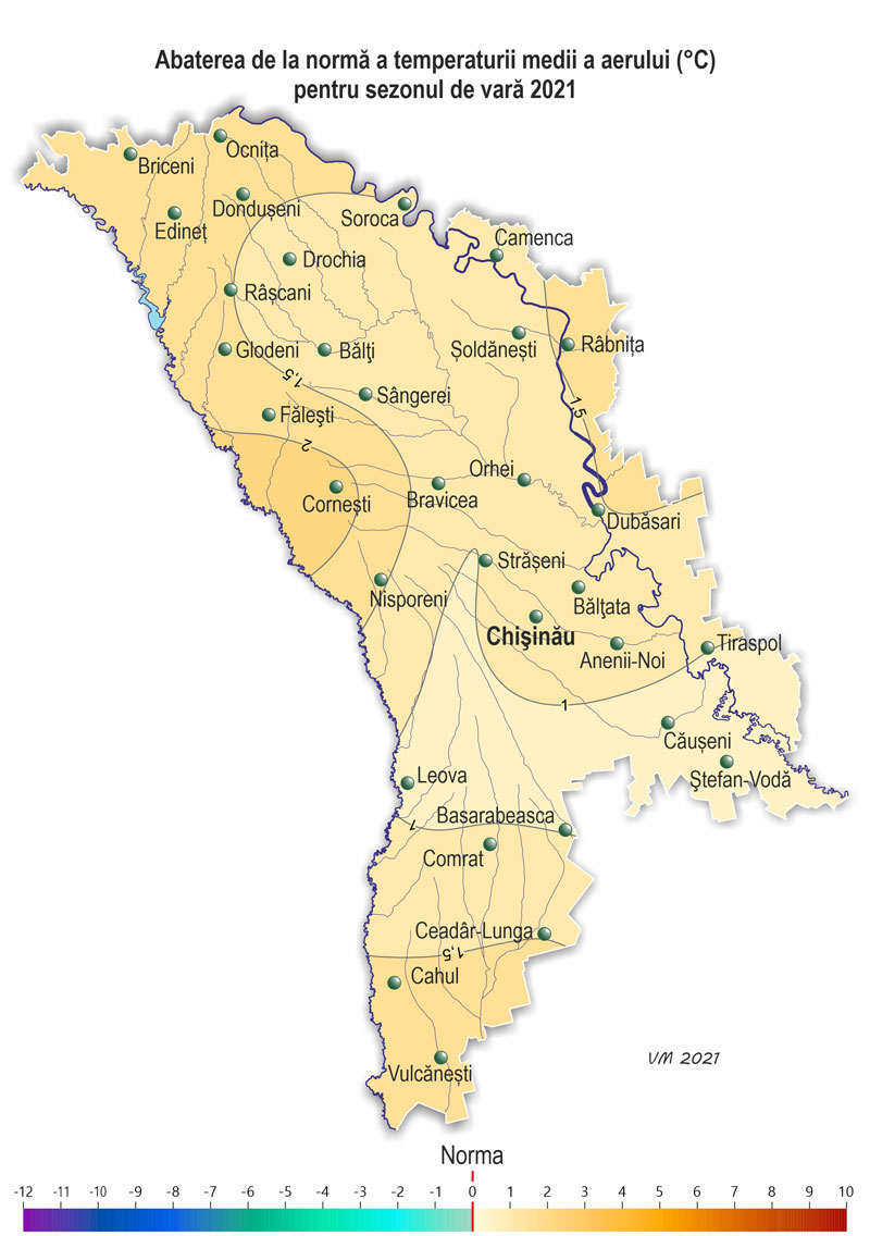 Temperatura maximă a aerului pe parcursul verii a urcat până la +37ºC (iulie, august), ceea ce se semnalează în medie o dată la 3-5 ani. Temperatura minimă a aerului a scăzut până la +7ºÑ (iunie). Mai rece ca de obicei s-a semnalat în prima decadă a lunii iunie. Temperatura medie decadică a aerului a fost cu 1,0-2,4ºÑ mai scăzută faţă de normă, ceea ce se semnalează în medie o dată la 3-5 ani (fig.1). Vreme îndeosebi de răcoroasă s-a semnalat pe 1-2 iunie, când temperatura medie zilnică a aerului a constituit +10..+12ºÑ (ñu 5-8ºÑ mai scăzută faţă de normă), ceea ce pe o mare parte a teritoriului țării în aceste zile se semnalează pentru prima dată din toată perioadă de observații, iar în această decadă – în medie o dată la 15-20 ani.