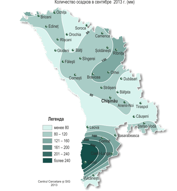 В сентябре на территории республики наблюдалась холоднее обычного с обильными осадками погода. Средняя за месяц температура воздуха была на 1-2°С ниже нормы и составляла 12,9.. 15,6°С, что отмечается в этот период в среднем один раз в 5-7 лет. Максимальная температура воздуха на территории республики повышалась до 27°С (МС Каменка, Фэлешть, Дубэсарь, Тираспол, Чадыр-Лунга, Кахул). 30 сентября местами в северной половине республики отмечались первые заморозки в воздухе интенсивностью до -1°С и на поверхности почвы – до -2°С. 28-30 сентября наблюдались заморозки на высоте 2 см от поверхности почвы интенсивностью до -1..-2°С. Заморозки такой интенсивности в это время возможны в среднем один раз в 5-10 лет. Устойчивый переход средней суточной температуры воздуха через 15°С в сторону более низких значений, характеризующий окончание метеорологического лета, произошел 14-19 сентября, что в северных районах республики в обычные сроки, на остальной территории на неделю раньше обычных сроков. Сумма осадков за сентябрь составляла в основном 60-135 мм (135-320% месячной нормы). В районе МС Комрат количество осадков составило 168 мм (480% месячной нормы), в районе МС Чадыр-Лунга – 166 мм (370% месячной нормы), что отмечается в этих пунктах в этом месяце впервые за весь период наблюдений. Наибольшее количество осадков выпало в районе МС Кахул – 288 мм, или 55% годовой нормы, такое количество осадков превысило их наибольшее месячное значение в этом пункте за весь период наблюдений. 11-13 сентября наблюдались СГЯ в виде сильных и продолжительных ливней. Так, 13 сентября на МС Чадыр-Лунга за 1 ч выпало 34 мм осадков. В этот же день в ряде районов (Бричень, Рыбница, Резина, Орхей и Комрат) за 12 ч выпало от 50 до 77 мм. На МС Кахул за 12 ч выпало 172 мм, что наблюдается по территории второй раз за весь период наблюдений. На МС Чадыр-Лунга сумма осадков за 11-13 сентября составила 120 мм. Прошедшие в течение месяца сильные дожди, местами с грозами и сильным ветром до 23 м/с (МС Фэлешть) вызвали повреждение сельскохозяйственных культур, народнохозяйственных объектов и отключение электроэнергии. В течение месяца погодные условия были в основном удовлетворительными для формирования урожая сельскохозяйственных культур. Прошедшие во второй половине сентября дожди пополнили запасы продуктивной влаги в почве, однако дождливая погода сдерживала проведение сева озимых культур и была не вполне благоприятной для накопления сахаров у винограда. Пониженный температурный режим, наблюдавшийся в последней пятидневке месяца, приостановил активную вегетацию сельскохозяйственных культур на 1-2 недели раньше обычных сроков. В хозяйствах, где сев озимых культур проводили во второй половине сентября, у озимой пшеницы отмечались фазы прорастание зерна - всходы, у озимого рапса – первый настоящий лист. По состоянию на 28 сентября с.г. запасы продуктивной влаги на участках, предназначенных под посев озимых культур в пахотном слое почвы составляли 20-45 мм (100-225% нормы), в метровом слое почвы - 75-205 мм (85-205% нормы). В течение месяца в хозяйствах республики убирали подсолнечник, кукурузу, сахарную свеклу, овощные и плодовые культуры, виноград. Также отдельные хозяйства проводили сев озимых культур, в сроки близкие к оптимальным (20 сентября - 10 октября). По состоянию на 28 сентября с.г. запасы продуктивной влаги под многолетними насаж