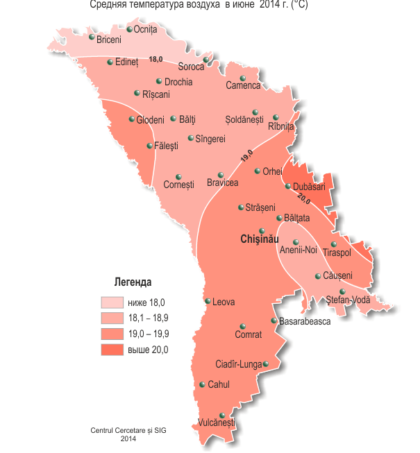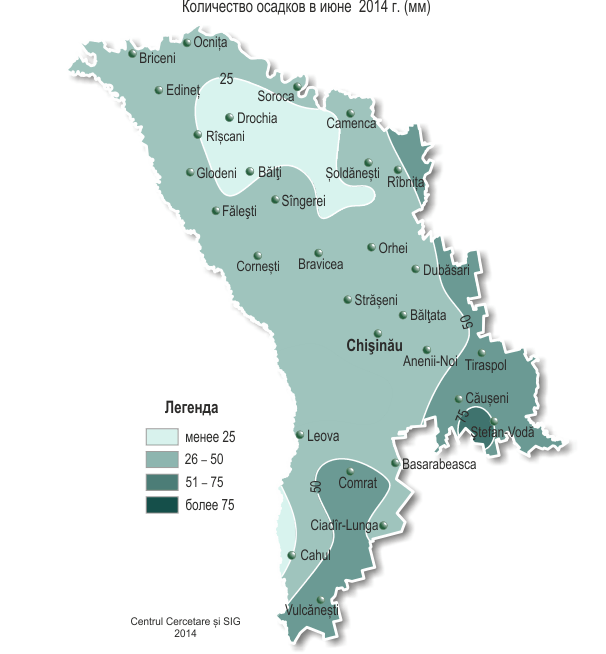 В течение июня на территории республики наблюдалась обычная по температурному режиму погода. Средняя за месяц температура воздуха на территории республики была близка к норме и составляла +17,5..+20,0°С. Максимальная температура воздуха повышалась до +34ºС (МС Дубэсарь). Минимальная температура воздуха понижалась до +6°С (МС Сорока, Рыбница). Осадки в течение июня выпадали неравномерно по территории и носили преимущественно ливневой характер. Сумма осадков за месяц на 80% территории республики составила в основном 17-45 мм (20-60% нормы), местами, преимущественно в южных районах республики, - 50-75 мм (75-115% нормы). Прошедшие в течение месяца в отдельных районах сильные дожди, местами с грозами, градом диаметром до 8 мм и сильным ветром до 20 м/с (МС Комрат), вызвали повреждение сельскохозяйственных культур, народнохозяйственных объектов и отключение электроэнергии. В течение июня погодные условия были в основном благоприятными для роста, развития и формирования урожая сельскохозяйственных культур. У озимых зерновых культур в первой половине месяца отмечалась молочная спелость, а во второй половине июня началась восковая спелость. Местами к концу месяца в центральных и южных районах республики отмечалась полная спелость. Отдельные хозяйства приступили к уборке. У яровых зерновых культур к концу месяца отмечалась молочная спелость. Состояние озимых и яровых культур преимущественно хорошее. По состоянию на 28 июня с.г. запасы продуктивной влаги под озимыми культурами в метровом слое почвы составляли в основном 70-160 мм (80-175% нормы), местами – 40-55 мм (55-65% нормы). У кукурузы в течение месяца продолжалось листообразование, к концу месяца сформировался 13-17 лист, местами началось выметывание метелки. Высота растений на конец месяца равнялась в основном 105-195 см, местами – 85-95 см. По состоянию на 28 июня с.г. запасы продуктивной влаги под кукурузой в полуметровом слое почвы составляли 40-85 мм (70-155% нормы), в метровом слое почвы – 95-165 мм (80-150% нормы). У подсолнечника в первой половине месяца отмечалось формирование листьев, во второй половине - образование соцветий, к концу месяца местами началось цветение. Высота растений на конец месяца составляла в основном 105-200 см, местами – 65-90 см. По состоянию на 28 июня с.г. запасы продуктивной влаги под подсолнечником в полуметровом слое почвы составляли в основном 35-85 мм (80-150% нормы), местами – 20-30 мм (40-55% нормы), в метровом слое почвы они оставляли в основном 70-150 мм (85-155% нормы), местами – 55-65 мм (55-70% нормы). У сахарной свеклы продолжался рост корнеплода, и отмечалось закрытие междурядий. У плодовых культур в основном продолжался рост плодов, у вишни, черешни, ранних сортов персика и абрикоса – созревание и сбор урожая. У винограда продолжается рост ягод. По состоянию на 28 июня с.г. запасы продуктивной влаги под многолетними насаждениями в метровом слое почвы составляли 65-170 мм (70-150% нормы).