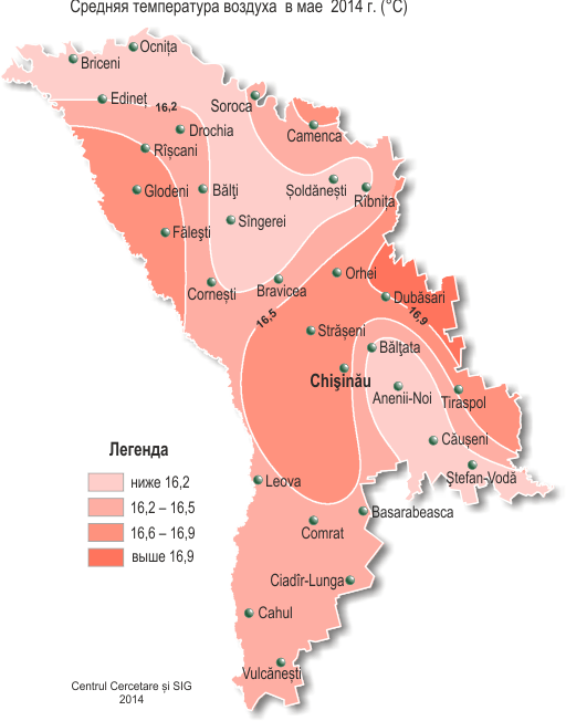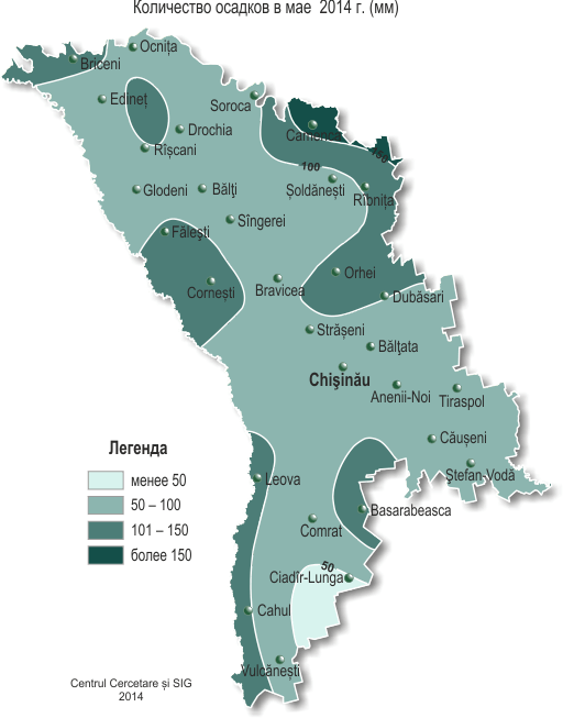 В течение мая на территории республики удерживалась теплая с осадками погода. Средняя за месяц температура воздуха была выше нормы на 0,3-1,1°С и составляла +16..+17°С. Максимальная температура воздуха в мае повышалась по территории до +32°С (МС Тираспол, Чадыр-Лунга, 26 мая). 6 мая местами в северных и центральных районах республики наблюдались заморозки в воздухе интенсивностью до -1°С. 6 мая почти повсеместно, а 7-8 мая отмечались заморозки на поверхности почвы и на высоте 2 см от поверхности почвы интенсивностью до -3..-5°С. Заморозки такой интенсивности в этот период в воздухе и на поверхности почвы отмечаются в среднем один раз в 10-20 лет. Устойчивый переход средней суточной температуры воздуха через 15ºС, обусловливающий начало метеорологического лета, на территории республики произошел 15-16 мая, что близко к обычным срокам. Сумма осадков за месяц на 90% территории республики составляла 45-105 мм (95-195% нормы), на 10% территории выпало 110-130 мм (200-230% нормы). Наибольшее количество осадков зарегистрировано на МС Каменка -171 мм (311% нормы), на ГП Ширеуць – 147 мм (230% нормы), что в этом месяце отмечается в этих пунктах впервые за весь период наблюдений, и на ГП Костешть - 158 мм (295 % нормы), что отмечается в мае в этом пункте второй раз за весь период наблюдений. 30-31 мая наблюдались СГЯ в виде сильного дождя: на ГП Хынчешть за 11 часов выпало 58 мм осадков, на МС Каменка за 3 часа – 68 мм. В течение месяца наблюдались грозы, град диаметром до 13 мм (МС Кахул), усиление скорости ветра до 21 м/с (МС Тирасполь). Прошедшие в течение месяца сильные дожди, местами с градом, вызвали повреждение сельскохозяйственных культур. Погодные условия мая были в основном благоприятными для роста, развития озимых, яровых и пропашных культур. Дождливая погода и повышенная влажность воздуха во второй половине месяца создавали не вполне благоприятные условия для созревания черешни и способствовали развитию болезней у винограда. У озимых культур в течение мая отмечались фазы появление нижнего стеблевого узла, колошение и цветение. К концу месяца местами в южной половине республики началась фаза молочная спелость (на 1 неделю раньше обычных сроков). По состоянию на 28 мая запасы продуктивной влаги под озимыми культурами в метровом слое почвы составляли в основном 80-160 мм (85-150% нормы), местами – 50-70 мм (65-75% нормы). У яровой пшеницы в первой половине месяца отмечалась фаза появление нижнего стеблевого узла, во второй половине - колошение, к концу месяца началось цветение. У гороха отмечался третий лист - образование соцветий, к концу мая – цветение. У кукурузы в начале месяца отмечались всходы, во второй половине месяца началось формирование вегетативной массы. К концу месяца сформировался 5-7-й лист, на более поздних посевах – 3-й лист. Высота растений на конец месяца равнялась в основном 20-60 см. По состоянию на 28 мая с.г. запасы продуктивной влаги под кукурузой в пахотном слое почвы составляли 25-40 мм (90 -140%% слое почвы – 105-180 мм (85-140%% нормы). У подсолнечника отмечалось формирование 2-ой пары настоящих листьев, к концу месяца местами наблюдалось появление соцветий. Высота растений на конец месяца равнялась в основном 10-45 см. По состоянию на 28 мая с.г. запасы продуктивной влаги под подсолнечником в пахотном слое почвы составляли в основном 17-35 мм (75-150% нормы). В метровом слое почвы они составляли - 100-175 мм (90-145% но