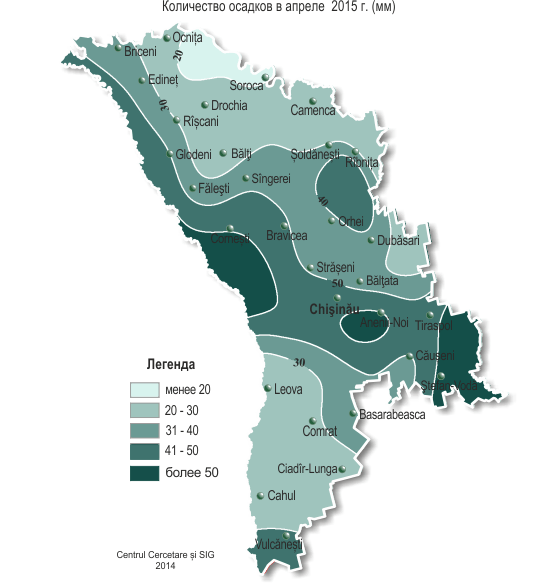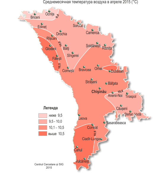 В течение апреля на территории республики наблюдалась в основном обычная по температурному режиму с осадками погода. Средняя за месяц температура воздуха на территории республики была близка к норме и составляла +9,3.. +10,9ºС. Максимальная температура воздуха на территории республики повышалась до +28ºС (МС Комрат, Чадыр-Лунга). В районе МС Рыбница 15 апреля, а также местами в южной половине республики 22 и 23 апреля отмечались заморозки в воздухе интенсивностью до -1..-2°С, что отмечается в это время в среднем один раз в 5-10 лет. На поверхности почвы и на высоте 2 см от поверхности почвы 15 апреля и в период 19 - 24 апреля по территории страны отмечались заморозки интенсивностью до -1..-6°. Устойчивый переход средней суточной температуры воздуха через 10°С, характеризующий начало активной вегетации сельскохозяйственных культур, в южной половине республики наступил в основном 10 апреля, что на неделю раньше обычных сроков, в северной - 23-24 апреля, что близко к средним многолетним датам. Сумма осадков за апрель на 80% территории составляла в основном 30-55 мм (75-150% нормы), в отдельных северных и местами в южных районах – 20-25 мм (45-55% нормы). В отдельных северных районах 4 апреля отмечался снежный покров, его высота не превышала 1 см. 7-8 апреля на большей части территории республики наблюдалось усиление скорости ветра до 15 - 20 м/с, местами – до 24 м/с (МС Чадыр-Лунга, Кахул). Погодные условия большую часть апреля были в основном благоприятными для роста и развития озимых, плодовых культур и винограда, а также для проведения сева и появления всходов яровых культур. У озимой пшеницы в первой половине апреля продолжалось кущение, во второй - выход в трубку. Состояние посевов преимущественно хорошее. По состоянию на 28 апреля с.г. запасы продуктивной влаги в почве под озимыми культурами в пахотном слое составляли в основном 20-35 мм (80-140% нормы), в метровом слое почвы они равнялись 115-190 мм (85-130% нормы). На посевах у гороха к концу месяца отмечались всходы и 3-й настоящий лист, у сахарной свеклы и подсолнечника - всходы. У плодовых культур в начале апреля в северной половине республики отмечалось распускание почек, в южной половине - развертывание первых листьев, у абрикоса отмечалось цветение. К концу месяца у плодовых культур продолжалось цветение, у абрикоса начался рост плодов. У грецкого ореха в конце апреля отмечалось цветение, местами - появление соцветий. У винограда в первой декаде апреля отмечалось сокодвижение во второй и третьей декаде - распускание глазков и развертывание листьев. По состоянию на 28 апреля с.г. запасы продуктивной влаги под многолетними насаждениями в метровом слое почвы составляли в основном 105-180 мм (75-125% нормы). Хозяйства республики продолжали сев сахарной свеклы, подсолнечника и кукурузы. Средняя температура почвы на глубине 10 см составляла +6..+8ºС в начале месяца и +13..+15ºС в конце.
