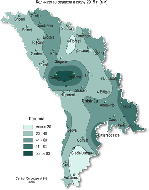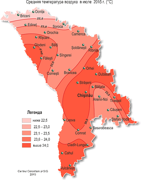 В течение июля на территории республики наблюдалась очень теплая с недобором осадков погода. Средняя за месяц температура воздуха была на 1,7-3,4°С выше нормы и составляла +22,1..+ 24,7°С, что отмечается в среднем один раз в 7-10 лет. Максимальная температура воздуха по территории республики повышалась до +38°С (МС Бравича, Дубэсарь, Тираспол, Комрат), что отмечается в среднем один раз в 10 лет. Минимальная температура воздуха понижалась до + 8°С (МС Бэлцата). Число дней с максимальной температурой воздуха ≥30°С составило по территории 14-20 дней (норма 3-11), что отмечается в среднем один раз в 5-10 лет. Число дней с максимальной температурой воздуха ≥35°С составило по территории 3-12 дней (при норме 1 день). Осадки в течение июля выпадали по территории неравномерно. На 75% территории сумма осадков составила 15-45 мм (25-65% месячной нормы), на остальной территории осадков выпало 50-85 мм (75-145% месячной нормы). 9 июля на МС Бравича наблюдалось СГЯ в виде сильного дождя: за 3 часа выпало 59 мм осадков. Прошедшие в течение июля дожди с грозами, градом и сильным ветром вызвали повреждения сельскохозяйственных культур, народнохозяйственных объектов и отключение электроэнергии. Из-за засушливой погоды, сохранявшейся большую часть месяца, сложились неблагоприятные условия для формирования урожая кукурузы, подсолнечника, сахарной свеклы, а также для роста и развития овощных и других сельскохозяйственных культур. В первой декаде июля, в сроки, близкие к обычным, хозяйства республики приступили к уборке озимых и яровых зерновых культур, к концу месяца большинство хозяйств завершили уборку. У кукурузы в течение июля отмечались фазы: выметывание метелки, цветение метелки и початка. К концу месяца у кукурузы началась молочная спелость (на одну – две недели раньше обычных сроков). Высота растений на конец месяца равнялась в основном 155-220 см, местами – 125-140 см. На одном растении сформировалось в среднем 1-2 початка. По состоянию на 28 июля запасы продуктивной влаги под кукурузой были в основном низкими и составляли в полуметровом слое почвы 10-30 мм (20-50% нормы), местами – 35-45 мм (75-90% нормы), в метровом слое почвы - в основном 25-65 мм (25-70% нормы), местами – 85-95 мм (95-100% нормы). У подсолнечника в течение июля отмечалось цветение, к концу месяца местами началось созревание (на 10-20 дней раньше обычных сроков). Высота растений на конец месяца равнялась в основном 125-175 см. Диаметр корзинки составлял 14-21 см. По состоянию на 28 июля с.г. запасы продуктивной влаги под подсолнечником в метровом слое почвы были низкими и составляли 10-65 мм (15-60% нормы). У сахарной свеклы в течение месяца продолжался рост корнеплода. У плодовых культур в течение июля продолжался рост плодов, у персика, абрикоса, сливы и ранних сортов яблок – созревание и сбор урожая. У винограда продолжался рост ягод, во второй половине месяца у раннеспелых сортов началось созревание. По состоянию на 28 июля с.г. запасы продуктивной влаги под многолетними насаждениями в метровом слое почвы составляли в основном 15-55 мм (15-60% нормы), местами – 70-90 мм (65-115% нормы). Прошедшие 30-31 июля дожди, местами сильные, пополнили в основном запасы продуктивной влаги в верхних слоях почвы и несколько улучшили условия для роста и развития сельскохозяйственных культур на большей части территории республики.