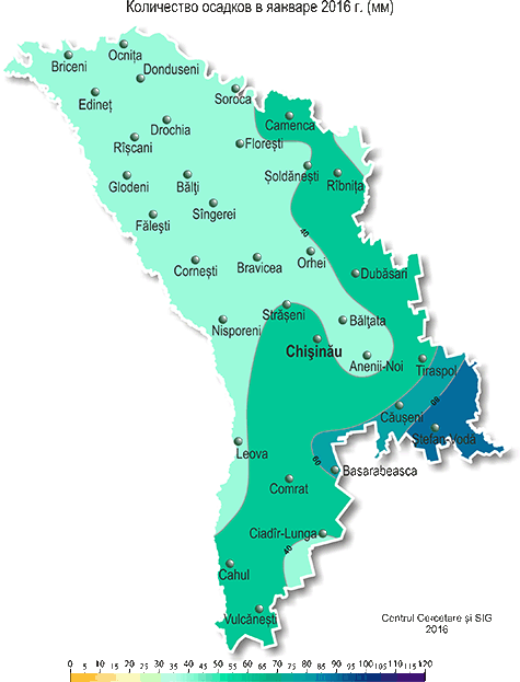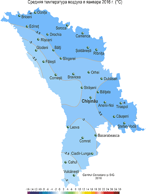 В течение января на территории республики наблюдалась неоднородная по температурному режиму с осадками погода. Средняя за месяц температура воздуха была в основном близка к норме, в отдельных юго-восточных районах - ниже нормы на 0,5-1,0ºС и составляла -2,3..-4,0ºС. Максимальная температура воздуха в январе повышалась по территории до +12ºС (МС Чадыр-Лунга). Минимальная температура воздуха понижалась до -22°С (МС Рыбница, Кодрий, Бэлцата), что в январе наблюдается в среднем один раз в 3-5 лет. Осадки в течение месяца выпадали в виде снега, мокрого снега и дождя. Сумма осадков за месяц составила в основном 28-62 мм (80-220% нормы). Наибольшее их количество было зарегистрировано на МС Штефан-Водэ – 93 мм (282% нормы). 17 января на МС Штефан-Водэ отмечалось стихийное метеорологическое явление в виде сильного снегопада, когда за 12 ч выпало 21 мм осадков. Прошедшие снегопады в южной половине республики сопровождались усилением скорости ветра до 20 м/с (МС Штефан-Водэ, Комрат, Чадыр-Лунга) и метелями, что создало неблагоприятные условия для движения транспорта. Также в течение месяца отмечались туманы, гололедно-изморозевые отложения, гололедица на дорогах. Большую часть января на территории республики отмечался снежный покров. Его максимальная высота на метеорологических площадках достигала 29 см (МС Чадыр-Лунга). В течение месяца глубина промерзания почвы составляла в основном 17-45 см, местами, преимущественно в южной половине республики – 1-15 см. К концу месяца в отдельных районах южной половины республики почва была талая. Озимые культуры и многолетние насаждения в течение месяца находились в состоянии вегетационного покоя. Высота снежного покрова на полях с озимыми культурами в течение месяца составляла в основном 5-18 см, местами – 1-4 см. К концу месяца снежный покров на полях с озимыми культурами отсутствовал. Минимальная температура почвы на глубине залегания узла кущения (3см) у озимых культур понижалась до -5..-10°С, что выше критических значений (-15°С). Условия для перезимовки озимых культур и многолетних насаждений были удовлетворительными.
