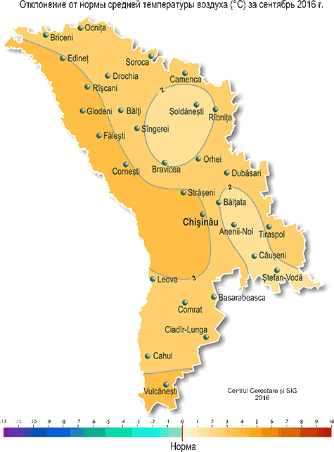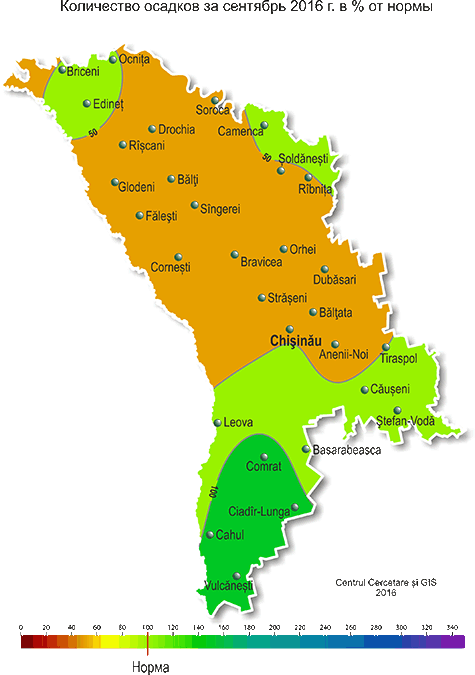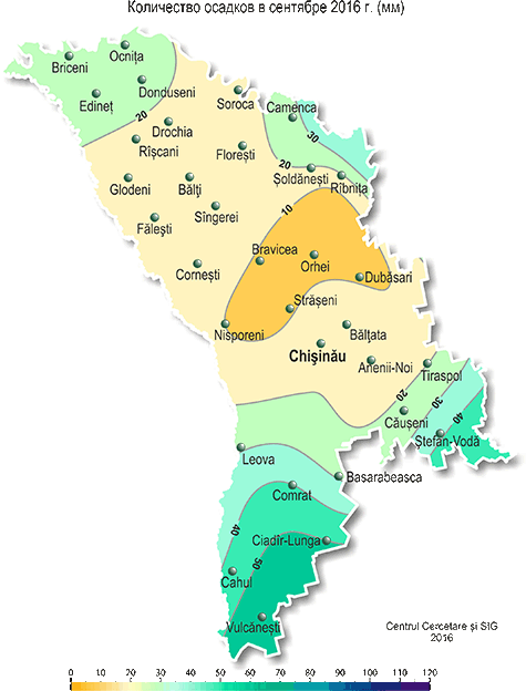 В сентябре на территории республики наблюдалась теплее обычного с недобором осадков погода. Средняя за месяц температура воздуха была на 2-3°С выше нормы и составляла +17,0.. +19,3°С, что отмечается в среднем один раз в 5 лет. Максимальная температура воздуха повышалась до +34°С (МС Тираспол, Чадыр-Лунга), что в сентябре отмечается в среднем один раз в 10 лет. Число дней с температурой воздуха ≥ +30°С составило по территории 5-13 (при норме за месяц 1-2 дня). Минимальная температура воздуха понижалась до +3°С (МС Бричень). Заморозки на высоте 2 см от поверхности почвы интенсивностью до -1°С отмечались местами 22 сентября (МС Бэлцата, Бравича) и 28 сентября (МС Бравича). Заморозки такой интенсивности в это время отмечаются в среднем один раз в 10 лет. Устойчивый переход средней суточной температуры воздуха через +15°С в сторону более низких значений, характеризующий окончание метеорологического лета, произошел 18-20 сентября, что в основном в сроки, близкие к обычным. В сентябре наблюдался значительный недобор осадков на большей части территории. Сумма осадков за месяц на 80% территории республики составляла 6-30 мм (15-70% нормы), и лишь в отдельных южных районах – 40-60 мм (80-130% нормы). Погодные условия сентября были в основном удовлетворительными для созревания плодовых культур и накопления сахара у винограда. Однако из-за низких запасов продуктивной влаги в почве, сложились неблагоприятные условия для подготовки почвы и проведения сева озимых культур в оптимальные сроки на большей части территории республики. По состоянию на 28 сентября запасы продуктивной влаги под зябью (на стерне) на 60% обследованной территории в пахотном слое почвы были низкими и составляли 4-12 мм (20-55% нормы), на остальной территории, преимущественно в южной половине, они составляли 14-30 мм (70-115% нормы). В метровом слое почвы на 60% территории запасы продуктивной влаги в почве составляли в основном 17-60 мм (15-65% нормы), местами – 70-110 мм (80-120% нормы). В течение месяца в хозяйствах республики убирали подсолнечник, кукурузу, сахарную свеклу, овощные и плодовые культуры, виноград. Отдельные хозяйства, преимущественно южной половины республики, где запасы влаги в почве были удовлетворительными, проводили сев озимых культур в конце сентября. По состоянию на 28 сентября запасы продуктивной влаги под многолетними насаждениями в метровом слое почвы на большей части территории республики составляли 25-45 мм (35-65% нормы), местами – 55-105 мм (75-150% нормы).