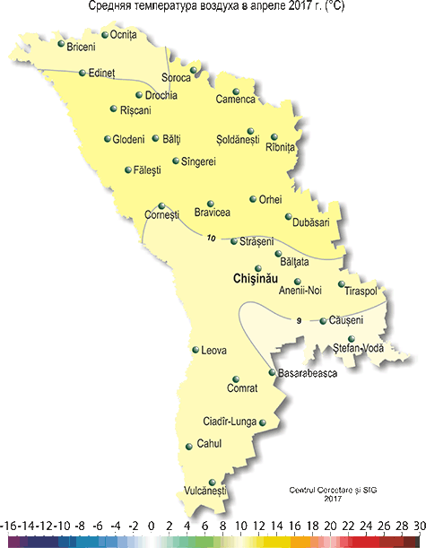 В течение апреля на территории республики наблюдалась неоднородная по температурному режиму с осадками погода. Средняя суточная температура воздуха в отдельные дни месяца (20-21 апреля) понижалась до 0..+4ºС. Средняя за месяц температура воздуха на территории республики была близка к норме и составляла +8,5.. +10,5ºС. Максимальная температура воздуха на территории республики повышалась до +27ºС (Сорока, Бравича). В течение апреля по территории республики наблюдались заморозки. Самые интенсивные заморозки отмечались 19 апреля: местами в воздухе до -3ºС и повсеместно на поверхности почвы до -1..-5ºС и на высоте 2 см от поверхности почвы до -1..-7ºС, что в этот период возможно в среднем один раз в 3-10 лет. Осадки выпадали по территории в виде дождя и мокрого снега. Сумма их за апрель на 60% территории, преимущественно в центральных и южных районах республики, составляла 85-128 мм (205-350% нормы), на остальной территории - 55-70 мм (120-180% нормы). 20 апреля почти повсеместно (за исключением крайних северных районов) образовался снежный покров, что в это время отмечается в среднем один раз в 20-30 лет. Его максимальная высота в северных районах местами достигала 5-14 см, в центральных и южных районах – преимущественно 20-40 см. Однако местами (МС Бэлцата, Кишинэу, Комрат) его высота составила 47-57 см, что в этих пунктах отмечается впервые за весь период наблюдений. Cнежный покров в центральных и южных районах республики сохранялся до 24 апреля. Прошедшие 20-21 апреля сильные снегопады, сопровождавшиеся отложением мокрого снега местами диаметром до 51 мм и усилением скорости ветра до 12-20 м/с, создавали неблагоприятные условия для движения транспорта, вызвали значительные повреждения народнохозяйственных объектов и отключение электроэнергии. а также повреждение сельскохозяйственных культур. Погодные условия большую часть апреля были в основном удовлетворительными для роста и развития озимых, плодовых культур и винограда, а также для проведения сева и появления всходов яровых культур. Понижение средней суточной температуры воздуха 20-21 апреля до 0..+4ºС, после продолжительного теплого периода, и установление снежного покрова на полях и отложение мокрого снега на деревьях создавали неблагоприятные условия для роста, развития яровых и цветущих плодовых культур. Заморозки в воздухе до -3ºС, отмечавшиеся преимущественно в центральных и в южных районах республики, вызвали местами повреждения у цветущих плодовых культур и грецкого ореха. У озимых культур в течение апреля отмечались фазы: кущение, выход в трубку, к концу месяца - появление нижнего стеблевого узла cоломины. Состояние посевов озимых культур преимущественно хорошее. По состоянию на 28 апреля запасы продуктивной влаги в почве под озимыми культурами в пахотном слое составляли 20-45 мм (75-170% нормы), в метровом слое почвы -120-205 мм (80-160% нормы). К концу месяца на посевах ярового ячменя отмечалась фаза выход в трубку, у гороха - 3-й настоящий лист, у сахарной свеклы - всходы и вторая пара настоящих листьев, у подсолнечника отмечались всходы. Состояние посевов преимущественно хорошее. У плодовых культур в первой половине месяца отмечалось цветение и развертывание первых листьев. К концу месяца у абрикоса, персика, черешни, сливы, вишни в основном закончилось цветение и началось формирование плодов, у яблони, груши и грецкого ореха 