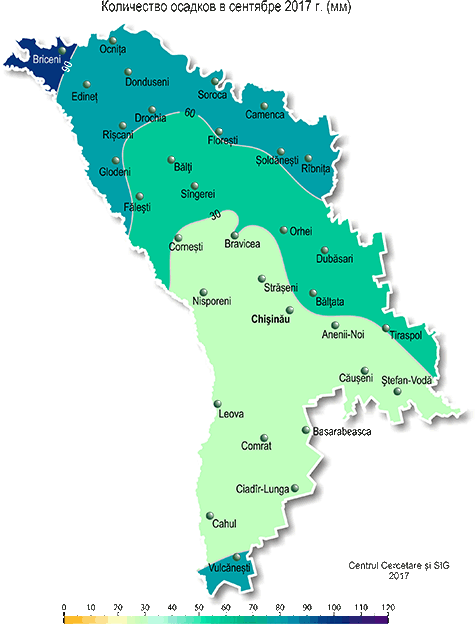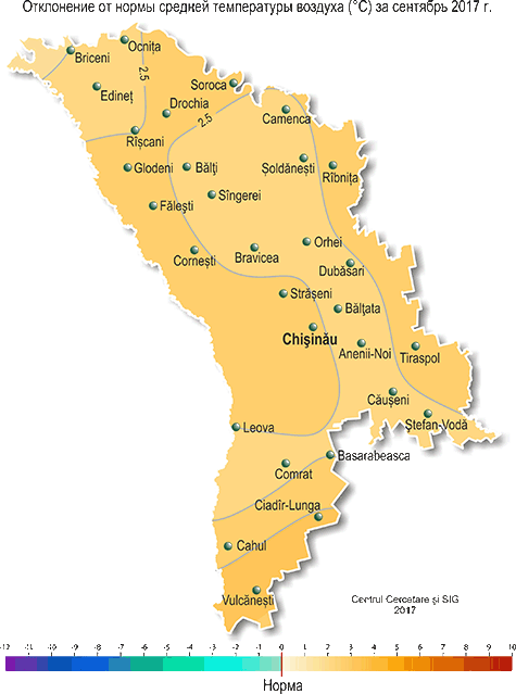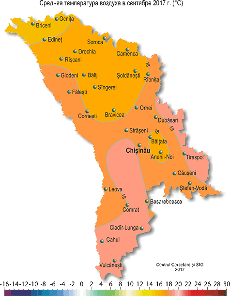 В сентябре на территории республики наблюдалась погода теплее обычного с дефицитом осадков в южной половине республики. Средняя за месяц температура воздуха была на 2-3ºС выше нормы и составляла +16,0.. +19,4ºС, что отмечается в среднем один раз в 5 лет. Максимальная температура воздуха повышалась до +33,0ºС (17 сентября, МС Чадыр-Лунга), что отмечается в среднем один раз в 5 лет. Число дней с максимальной температурой воздуха ≥ +30ºС составило по территории 4-10 (при норме за месяц 1-2 дня). 29-30-го сентября в отдельных районах (МС Бравича, Кодрий, Бэлцата) наблюдались заморозки в воздухе интенсивностью до -2ºС. Заморозки такой интенсивности в третьей декаде сентября в воздухе наблюдаются в среднем один раз в 10 лет. Первые осенние заморозки отмечались 28 сентября (МС Бравича) на высоте 2 см от поверхности почвы интенсивностью до -1ºС. На поверхности почвы первые заморозки интенсивностью до -2ºС отмечались местами 29 сентября (МС Каменка, Бравича), а 30 сентября они отмечались на 40% территории (в основном в северных и центральных районах). На высоте 2 см от поверхности почвы 29-30 сентября заморозки наблюдались на большей части территории. Их интенсивность в северных и южных районах составила до -3ºС, а в центральных – до -4ºС. Заморозки такой интенсивности в третьей декаде сентября на поверхности почвы возможны в среднем один раз в 5 лет, на высоте 2 см от поверхности почвы – один раз в 3-7 лет. Последний раз аналогичные заморозки в этот период отмечались в 2014 г. Устойчивый переход средней суточной температуры воздуха через +15ºС в сторону более низких значений, характеризующий окончание метеорологического лета, произошел 22-27 сентября, что в центральных и северных районах на одну неделю позже среднемноголетних дат, в южных районах - в сроки, близкие к обычным. Сумма осадков, выпавших в сентябре на 55% территории республики, преимущественно в северных и центральных районах, составляла 35-102 мм (75-195% нормы). В большинстве южных районов количество выпавших осадков за месяц не превышало 1-30 мм (2-65% нормы). Погодные условия сентября были в основном удовлетворительными для созревания плодовых культур и накопления сахара у винограда. Однако из-за низких запасов продуктивной влаги в почве, большую часть месяца складывались неблагоприятные условия для подготовки почвы и проведения сева озимых культур в оптимальные сроки на большей части территории республики. Прошедшие 22-24 сентября дожди пополнили запасы влаги в почве и улучшили условия для проведения сева озимых культур в северной половине республики, в южной половине они по-прежнему остаются неблагоприятными. По состоянию на 28 сентября с.г. запасы продуктивной влаги под зябью (на стерне) в северной половине республики в пахотном слое почвы составляли в основном 20-40 мм (85-165% нормы), преимущественно в южной половине запасы продуктивной влаги были низкими и составляли в основном 2-15 мм (10-65% нормы), или местами отсутствовали. В метровом слое почвы на 60% территории запасы продуктивной влаги в почве составляли в основном 15-60 мм (20-65% нормы), на остальной территории, преимущественно в северной половине – 70-150 мм (75-150% нормы). В течение месяца в хозяйствах республики собирали урожай подсолнечника, кукурузы, сахарной свеклы, овощных, плодовых культур и винограда. Отдельные хозяйства на севере республики в третьей декаде сентября на