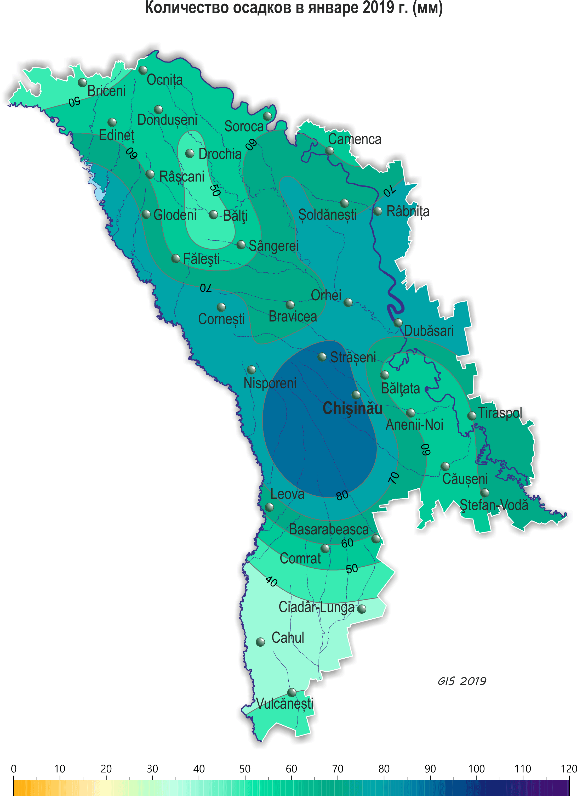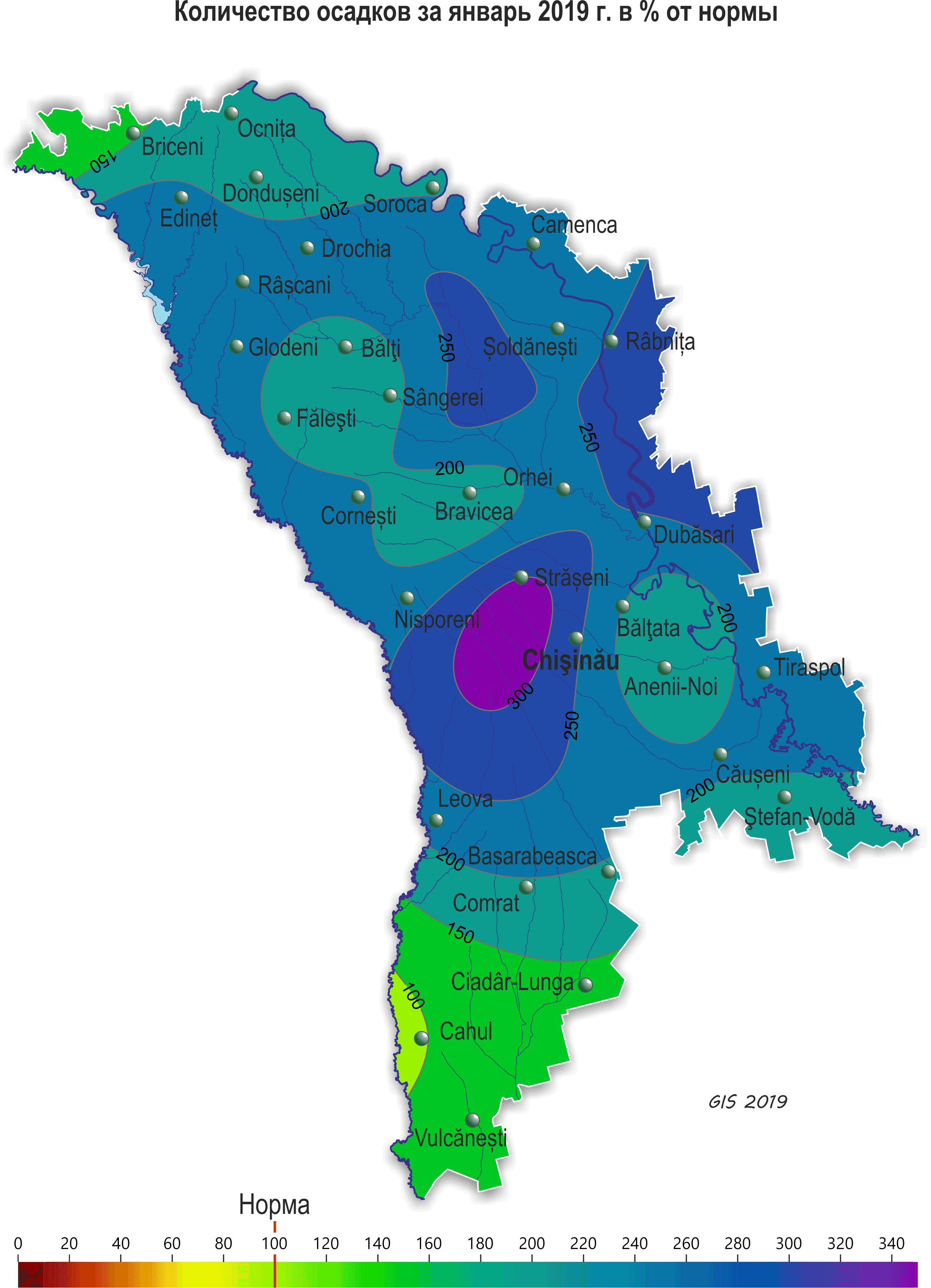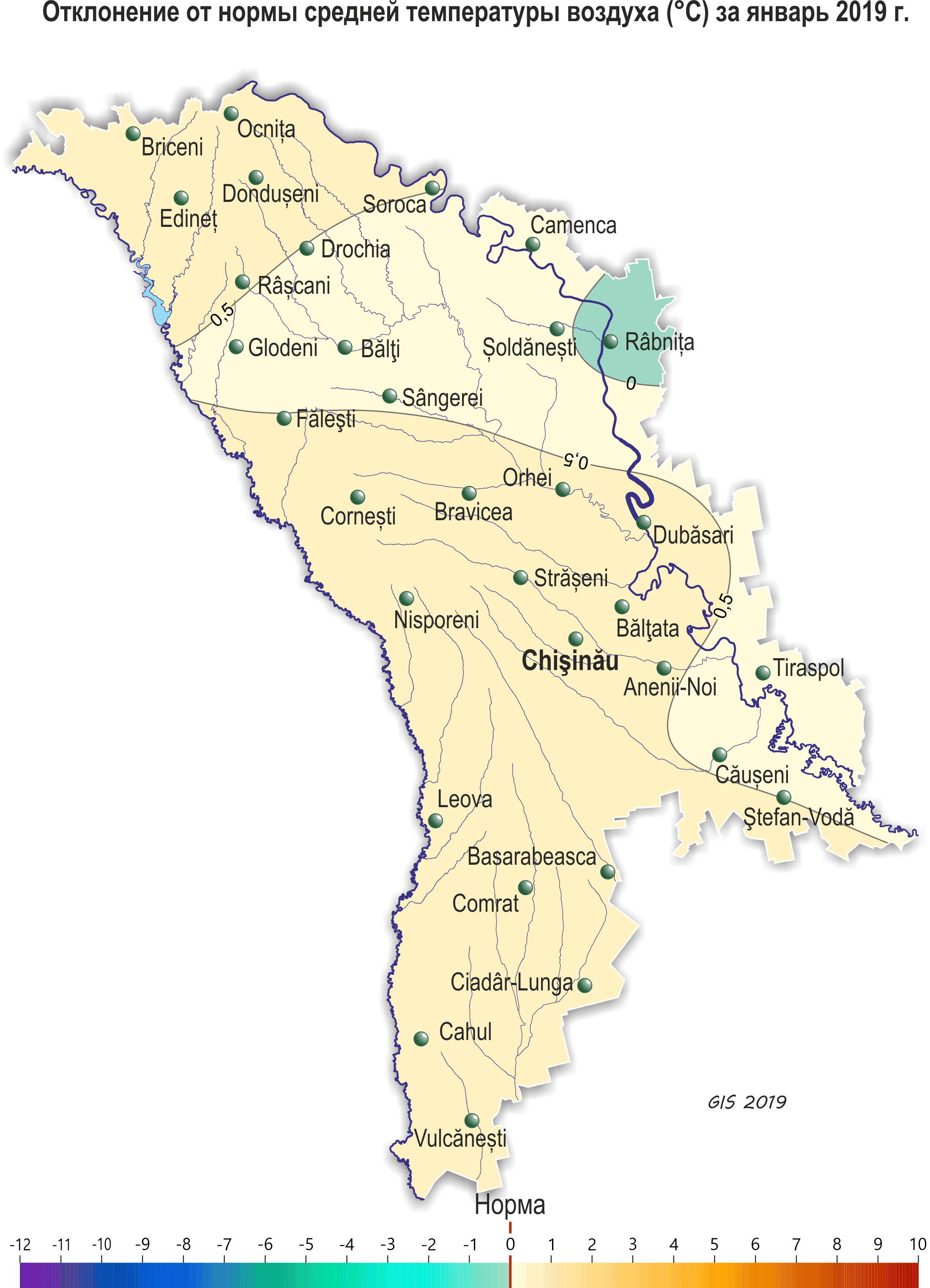 В течение января на территории республики наблюдалась теплее обычного, с обильными осадками погода. Средняя за месяц температура воздуха на территории республики была выше нормы на 0,5-1,0ºС и составляла -1,5..-3,5ºС. Максимальная температура воздуха повышалась до +13ºС (метеостанция Чадыр-Лунга), что в этот период наблюдается в среднем один раз в 5 лет. Минимальная температура воздуха понижалась до -17ºС (метеостанция Бравича). Осадки в течение месяца выпадали в виде снега, мокрого снега и дождя. Сумма их на 80% территории составляла 30-65 мм (100-220% нормы), на остальной территории 70-85 мм (250-300% нормы). Снежный покров в северных районах республики установился 2 января, на остальной территории 6 января и сохранялся в основном до конца месяца. Его максимальная высота на метеорологических площадках достигала 40 см (метеорологическая станция Рыбница). В конце января местами в южных районах республики снег сошел. Глубина промерзания почвы в течение января колебалась по территории в основном от 1 до 13 см, в начале месяца почва местами промерзала до 15-20 см. К концу месяца почва повсеместно оттаяла. В течение месяца также отмечались туманы, гололедно-изморозевые отложения, гололедица на дорогах и усиление скорости ветра до 19 м/с. Озимые культуры и многолетние насаждения в течение месяца находились в состоянии вегетационного покоя. Высота снежного покрова на полях с озимыми культурами большую часть месяца составляла 8-22 см, местами – 1-5 см. К концу месяца в южных районах снежный покров сошел. Минимальная температура почвы на глубине залегания узла кущения (3см) у озимых культур в течение месяца понижалась до -1..-4ºС, что выше критических значений (-15ºС). Условия для перезимовки озимых культур и многолетних насаждений были в основном удовлетворительными.