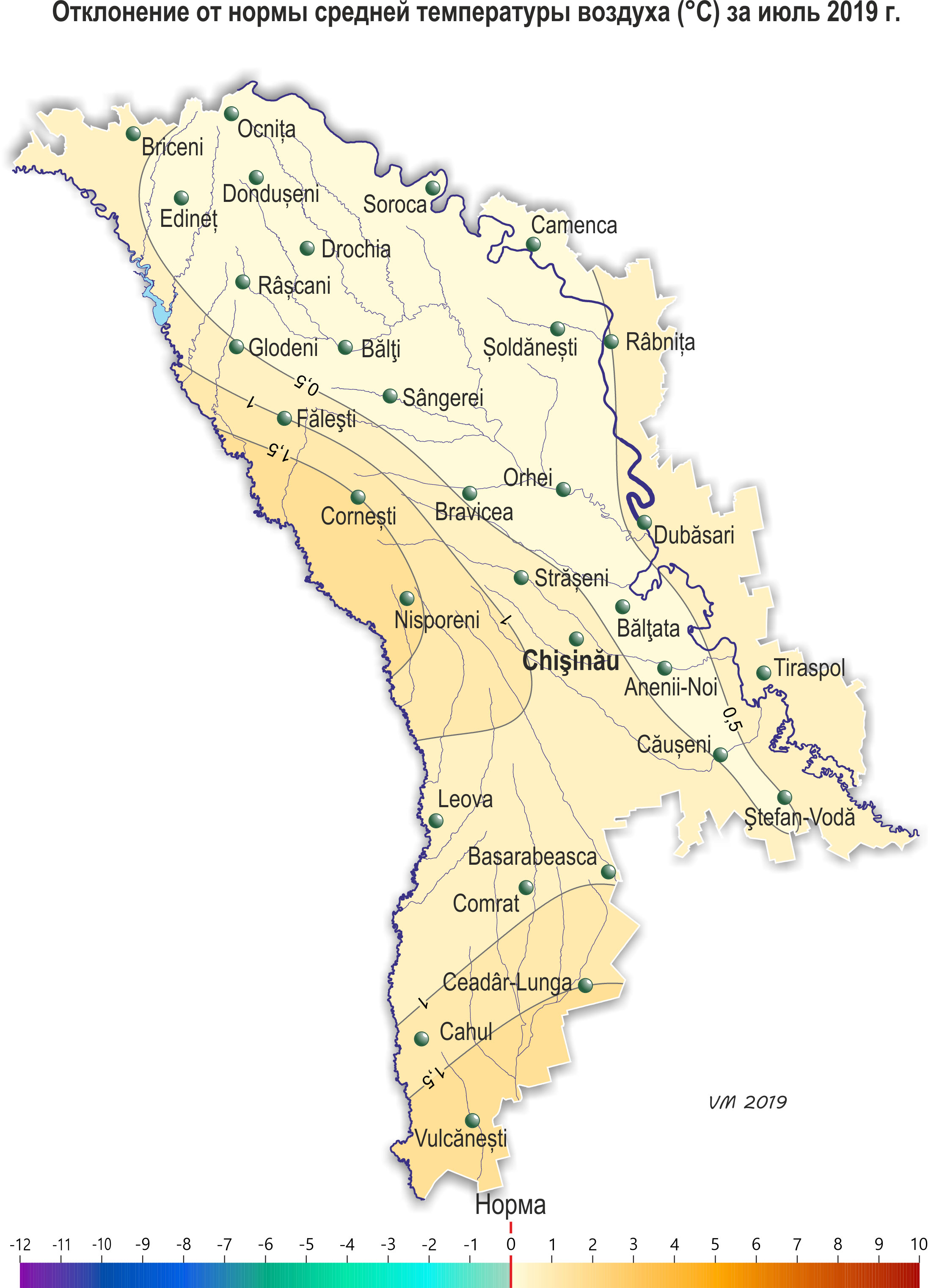 В течение июля на территории республики наблюдалась неоднородная по температурному режиму с недобором осадков погода. Средняя за месяц температура воздуха на большей части территории была выше нормы на 0,5-1,5ºС, местами – около нормы и составляла +19,8..+22,8ºС. Максимальная температура воздуха повышалась до +37ºС (МС Тираспол), что отмечается в среднем по территории один раз в пять лет. Число дней с максимальной температурой воздуха ≥30ºС составило по территории 7-13 дней (норма 3-11), с максимальной температурой ≥35ºС – 1-2 дня (норма - 1 день). Минимальная температура воздуха понижалась до +9ºС (МС Сорока, Каменка, Бэлць, Рыбница, Бэлцата). Осадки в течение июля выпадали по территории неравномерно. На 85% территории сумма осадков за месяц не превышала 10-45 мм (15-65% нормы), на остальной территории их количество равнялось 55-65 мм (80-90% нормы). В течение июля отмечались грозы, местами град. 2-3 июля на большей части территории республики наблюдалось шквалистое усиление ветра до 16-24 м/с. На МС Чадыр-Лунга скорость ветра 3 июля достигала 27 м/с, что является стихийным метеорологическим явлением. Прошедшие в отдельные дни месяца сильные дожди, местами с градом и сильным ветром, вызвали значительные повреждения сельскохозяйственных культур и народнохозяйственных объектов, отключение электроэнергии. В течение июля сложились в основном удовлетворительные условия для формирования урожая кукурузы, подсолнечника, сахарной свеклы, плодовых культур и винограда, а также для роста и развития овощных, и других сельскохозяйственных культур. В первой декаде июля началась массовая уборка хлебов, что в основном на одну - две недели раньше обычных сроков. К концу месяца хозяйства в основном закончили уборку зерновых культур. Условия для проведения уборочных работ были преимущественно благоприятными. У кукурузы в течение июля отмечалось выметывание метелки, цветение метелки и початка, к концу месяца началась молочная спелость. Высота растений на конец месяца равнялась в основном 180-265 см. По состоянию на 28 июля запасы продуктивной влаги под кукурузой в метровом слое на большей части территории составляли - 30-60 мм (25-65% нормы), местами – 80-95 мм (80-100% нормы). У подсолнечника в течение июля отмечалось цветение и рост корзинки, к концу месяца местами началось созревание. Высота растений на конец июля равнялась в основном 130-200 см. Диаметр корзинки составлял в основном 18-24 см, местами – 12-16 см. По состоянию на 28 июля запасы продуктивной влаги под подсолнечником в метровом слое почвы на большей части территории составляли 25-65 мм (20-70% нормы), местами в северных районах – 80-120 мм (80-100% нормы). У сахарной свеклы в течение месяца продолжался рост корнеплода. У плодовых культур в течение июля продолжался рост плодов, у персика, абрикоса, сливы и ранних сортов яблок – созревание и сбор урожая. У винограда продолжался рост ягод, к концу месяца у раннеспелых сортов началось созревание. По состоянию на 28 июля запасы продуктивной влаги под многолетними насаждениями в метровом слое почвы составляли в основном 35-55 мм (30-60% нормы), местами, преимущественно в северных районах, - 75-90 мм (70-80% нормы).