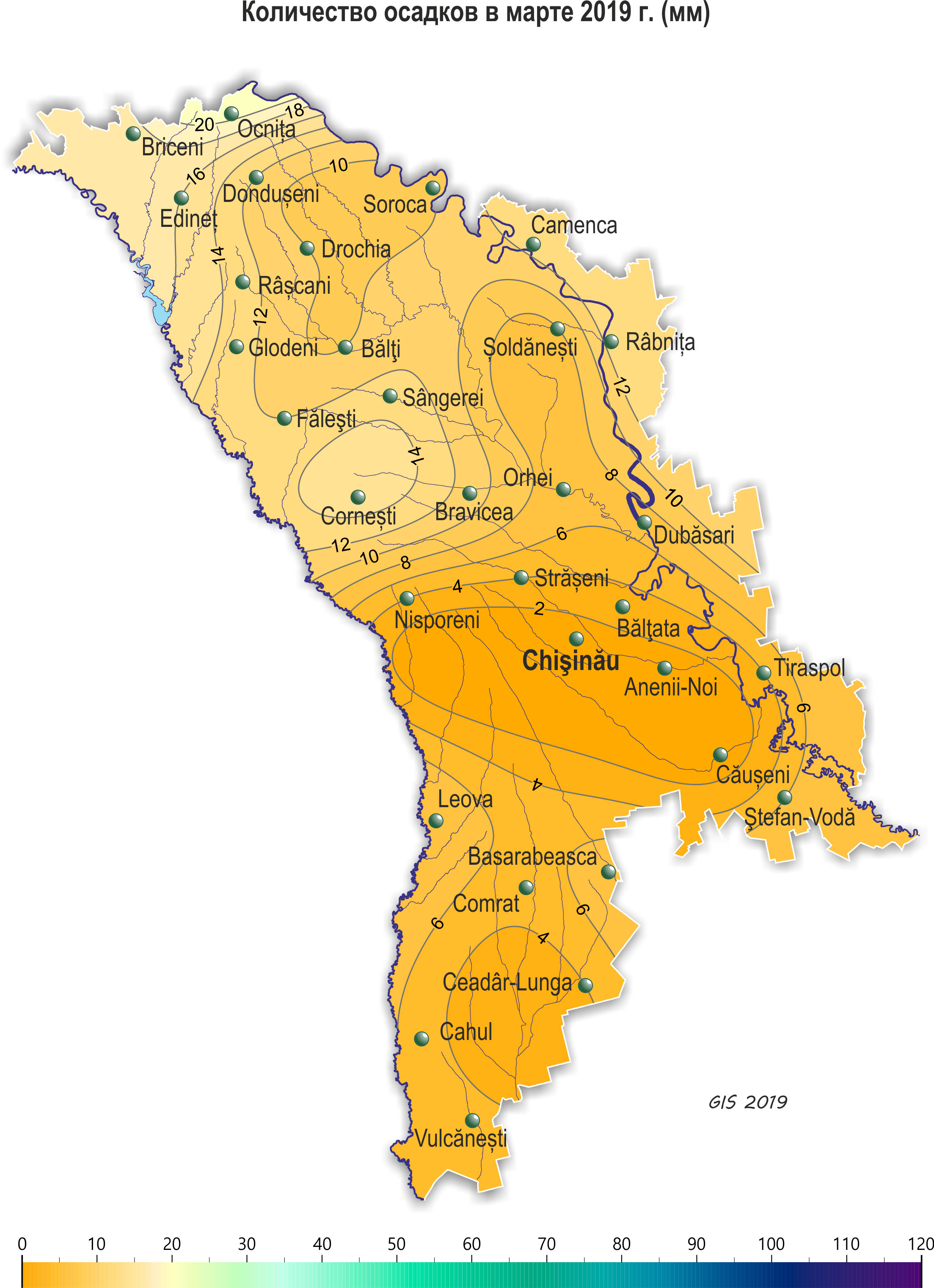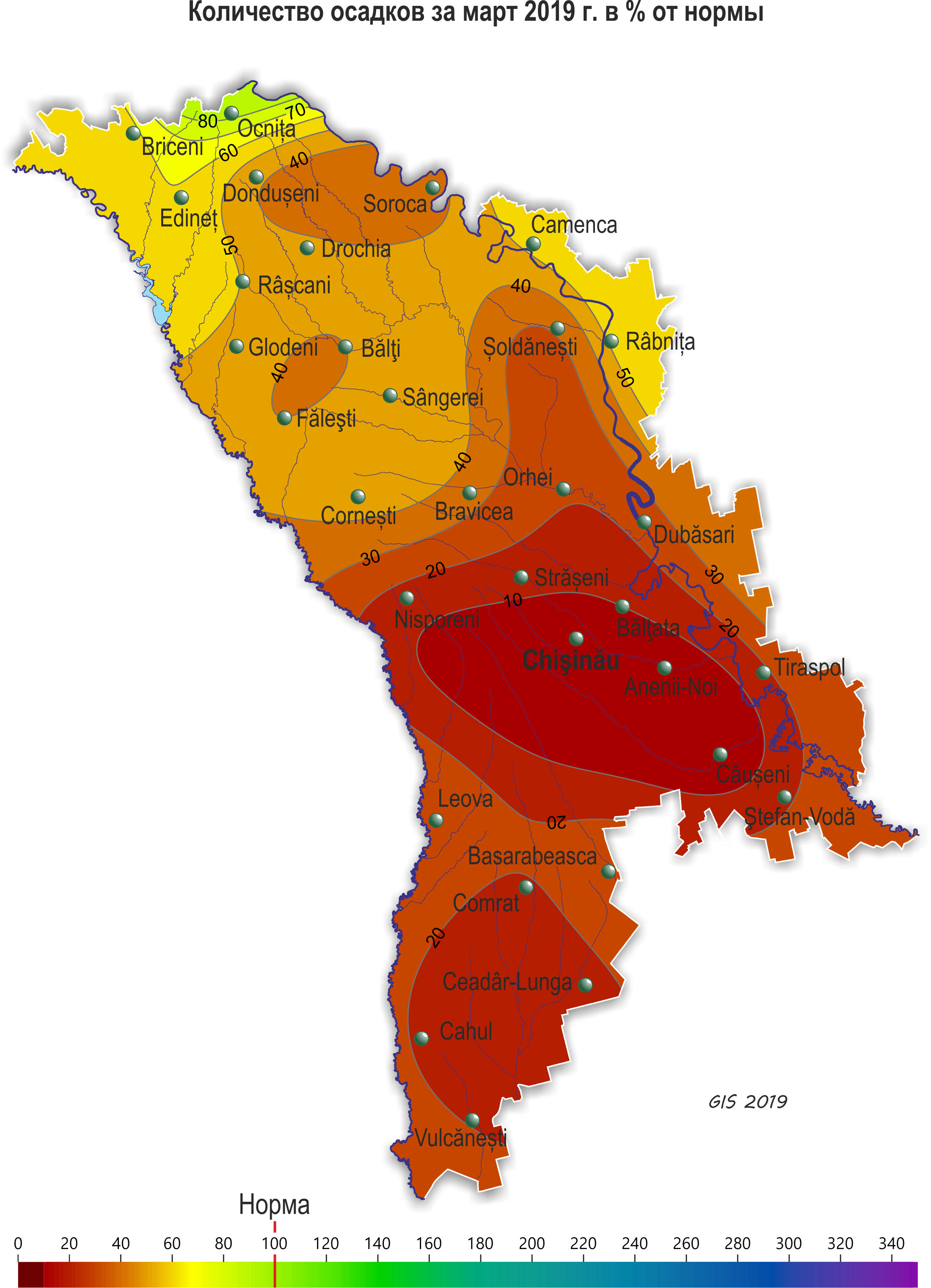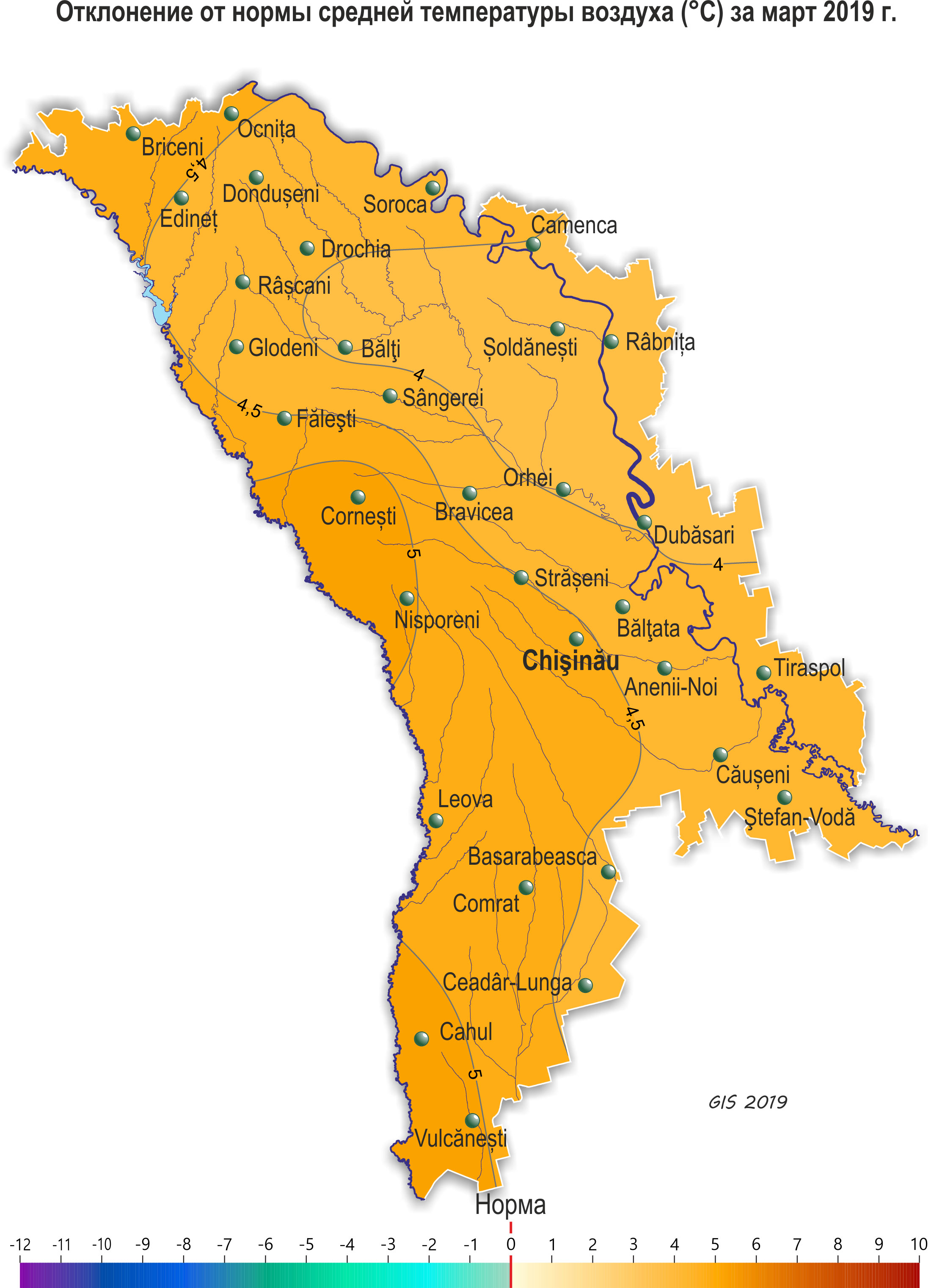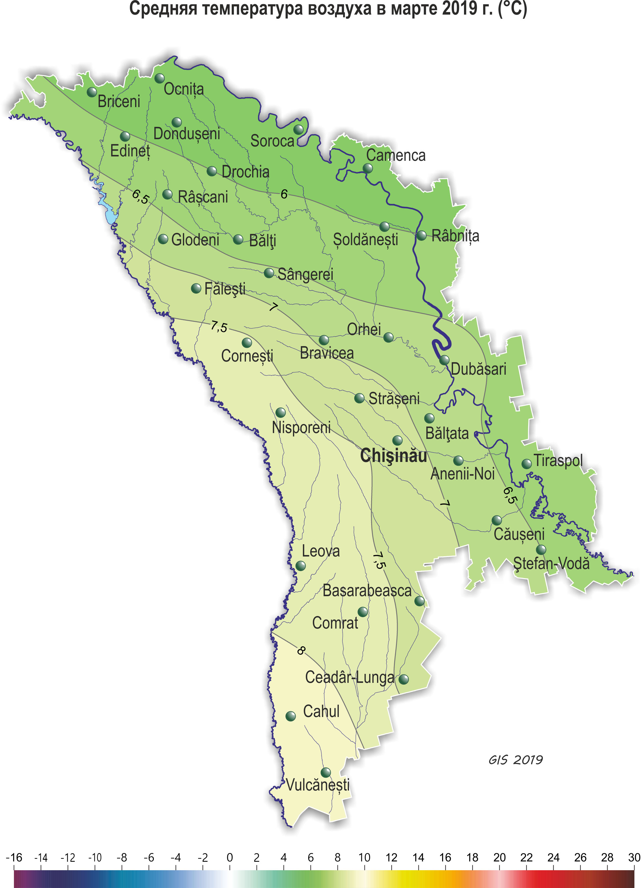 В течение марта на территории республики наблюдалась аномально теплая с недобором осадков погода. Средняя за месяц температура воздуха на территории республики была на 3,5-5,5°С выше нормы и составляла +6,0.. +8,5°С, что отмечается в среднем один раз в 10-15 лет. Максимальная температура воздуха на территории республики повышалась до +24ºС (метеорологические станции Фэлешть, Чадыр-Лунга). Минимальная температура воздуха понижалась до -11ºС (метеорологическая станция Бэлцата). Устойчивый переход средней суточной температуры воздуха через +5°С произошел 4 марта, что на 15-25 дней раньше обычных сроков. Сумма осадков, выпавших за март на территории республики, составляла 1-17 мм (3-55% нормы). Наибольшее количество осадков выпало в районе агрометеорологического поста Окница -21 мм (85% нормы). 10-11 марта на большей части территории республики наблюдалось усиление скорости ветра до 16-23 м/с, местами наблюдалась пыльная буря. В отдельных районах, 11 марта, скорость ветра достигала 28 м/с (МС Сорока, Бэлць, Корнешть), что является стихийным метеорологическим явлением. В результате сильного ветра отмечалось повреждение линий электропередач, народнохозяйственных объектов и сельскохозяйственных угодий. Погодные условия в марте были удовлетворительными для роста и развития озимых культур и многолетних насаждений. Однако отсутствие существенных осадков и повышенный температурный режим способствовали иссушение верхнего слоя почвы, что затрудняло подготовку почвы и проведение сева ранних яровых культур. В первой половине марта у озимых культур отмечались фазы: третий лист, кущение, местами - всходы. Во второй половине месяца на большей части территории озимые раскустились, местами отмечался третий лист. Число растений на 1м2 составляло в основном 335-460, местами – 230-315. На раскустившихся растениях сформировалось в среднем по 2 стебля. Высота растений в зависимости от фазы развития составляла в основном 11-21 см. По состоянию на 28 марта запасы продуктивной влаги в почве под озимыми культурами в пахотном слое составляли на 60% территории 25-40 мм (75-125% нормы), на остальной территории, преимущественно в южной половине республики, - 10-20 мм (30-65% нормы), в метровом слое почвы они составляли в основном 115-185 мм (80-135% нормы), местами – 65-95 мм (45-65% нормы). У основных плодовых культур в марте отмечалось набухание почек, распускание почек и развертывание первых листьев. У ранних сортов абрикоса и персика к концу месяца, преимущественно в южной половине республики, началось цветение, что в среднем на 3 недели раньше обычных сроков. У винограда в середине месяца местами началось сокодвижение, к концу месяца - продолжалось сокодвижение, местами отмечалось набухание глазков. По состоянию на 28 марта запасы продуктивной влаги под многолетними насаждениями в метровом слое почвы составляли в основном 120-165 мм (80-105% нормы), местами в южных районах они не превышали 90-110 мм (65-70% нормы). Во второй половине марта отдельные хозяйства республики приступили к севу ранних яровых культур и сахарной свеклы. Средняя температура почвы на глубине 5 и 10 см в течение месяца колебалась от +5ºC до +10ºС.