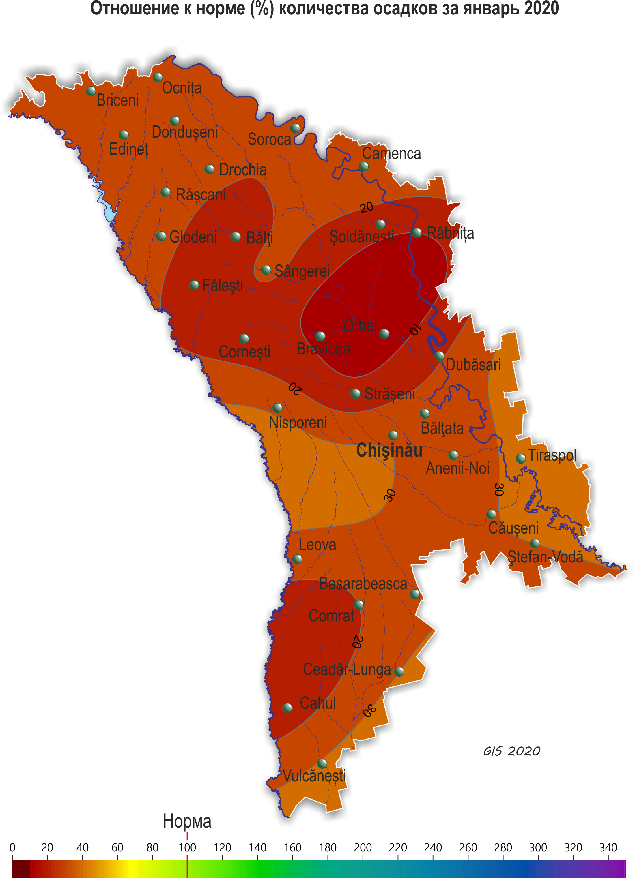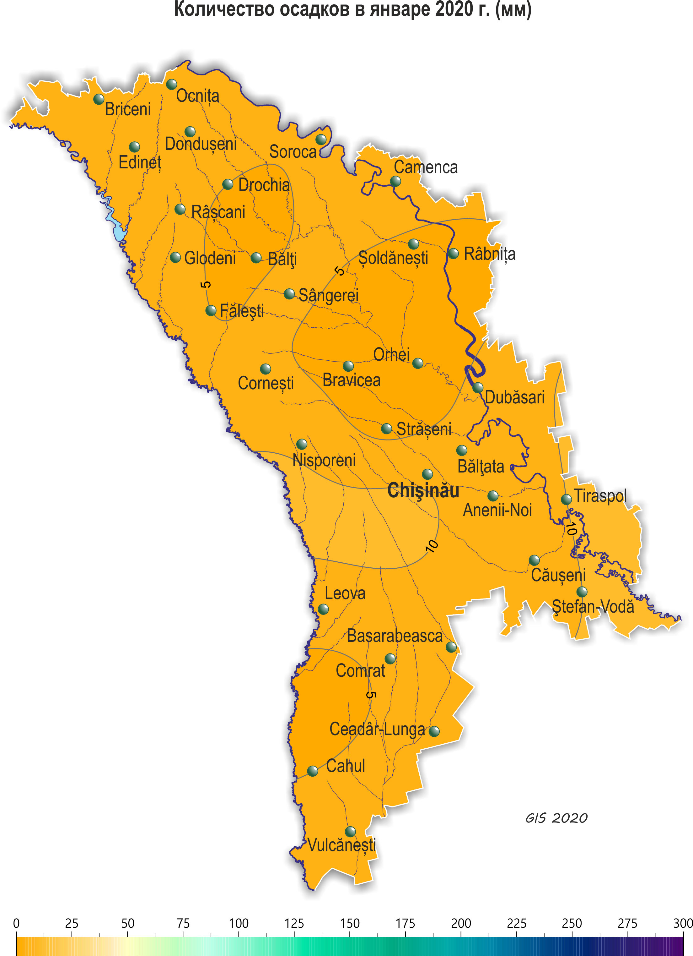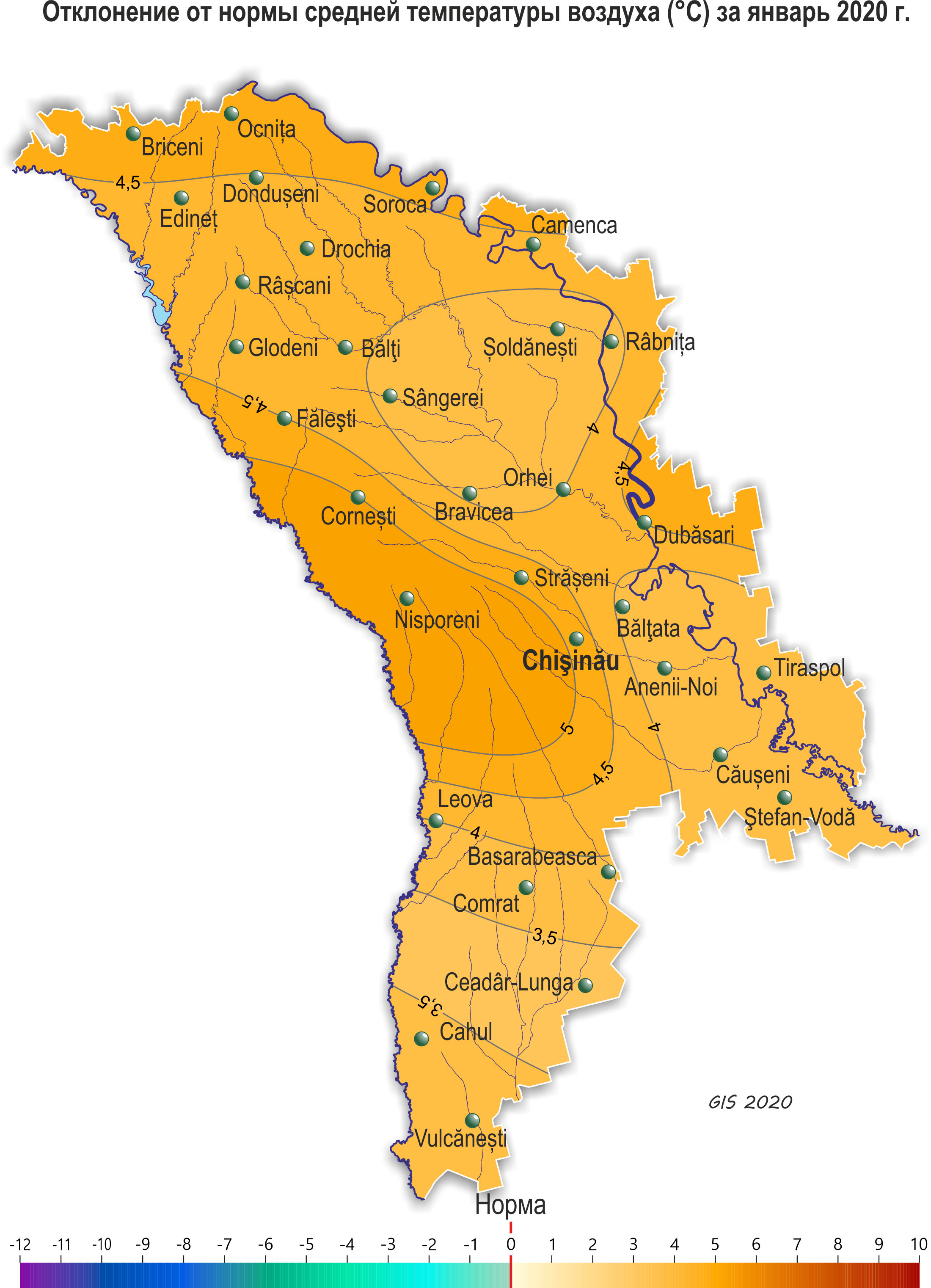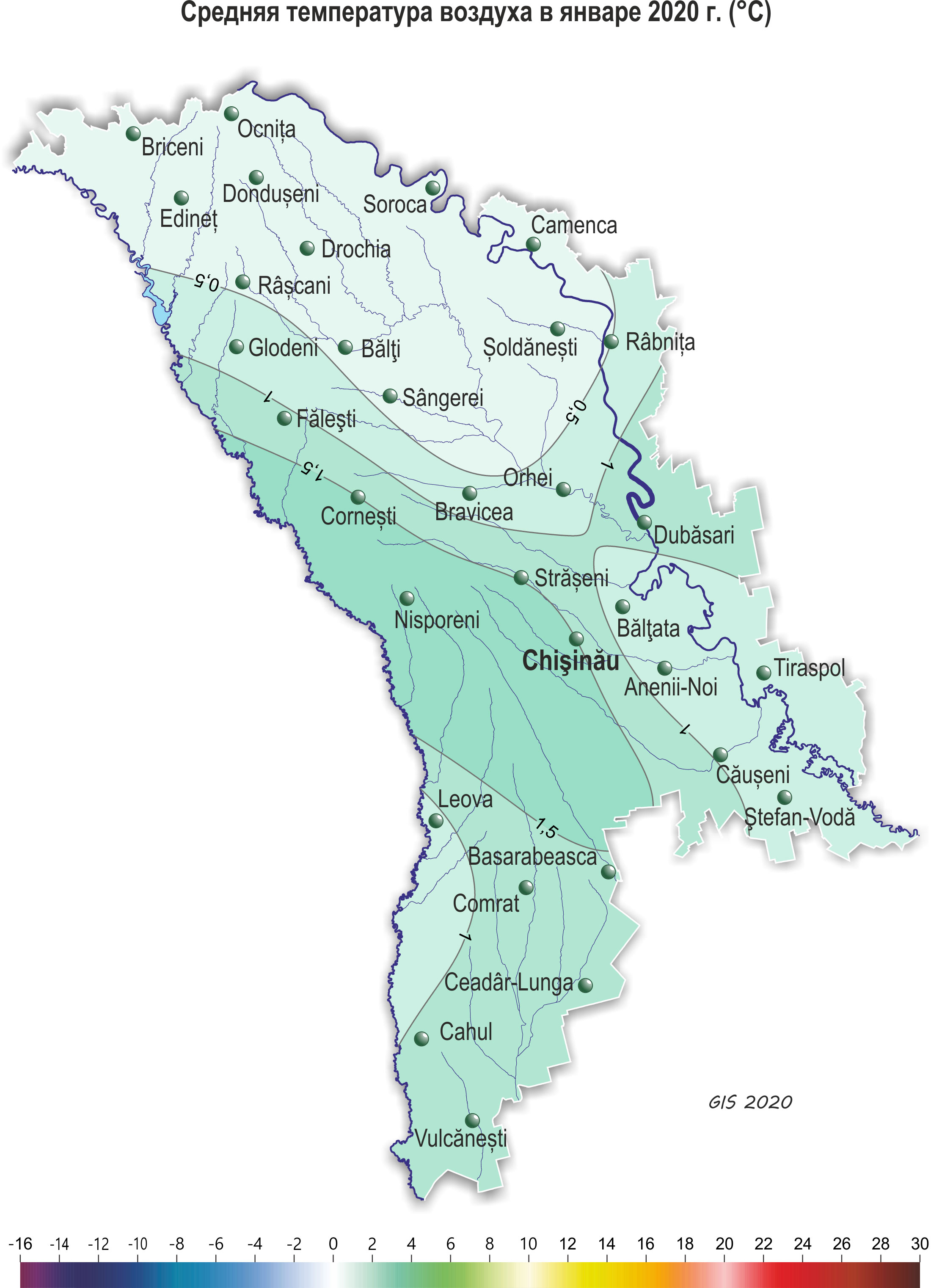 În decursul lunii ianuarie pe teritoriul ţării s-a semnalat vreme anomal de caldă şi cu deficit de precipitaţii. Temperatura medie lunară a aerului a fost mai ridicată faţă de valorile normei cu 3,5-5,0ºÑ şi a constituit +0,1..+1,5ºÑ, ceea ce se semnalează în medie o dată în 7-10 ani. Regim termic similar s-a înregistrat în ianuarie 2005. Temperatura maximă a aerului a urcat până la +13ºÑ (staţia meteorologică Bălţata, Tiraspol). Temperatura minimă a aerului a scăzut până la -10ºÑ (staţia meteorologică Briceni, Rîbniţa, Bravicea, Bălţata). În decursul lunii au căzut precipitaţii sub formă de zăpadă, lapoviţă şi ploaie. Cantitatea acestora a constituit 3-10 mm (10-35% din normă), ceea ce se semnalează în medie odată în 10-15 ani. Adâncimea de îngheţ a solului în decursul lunii ianuarie în fond a variat între 1 şi 7 cm, doar izolat la începutul lunii solul a îngheţat până la 10-13 cm. În unele zile solul a fost dezgheţat.