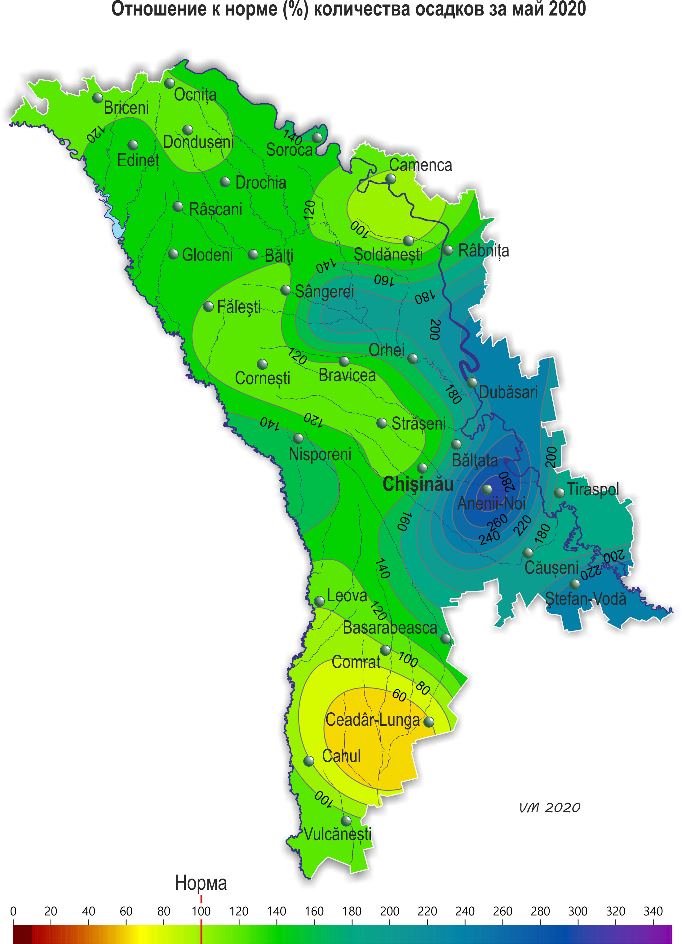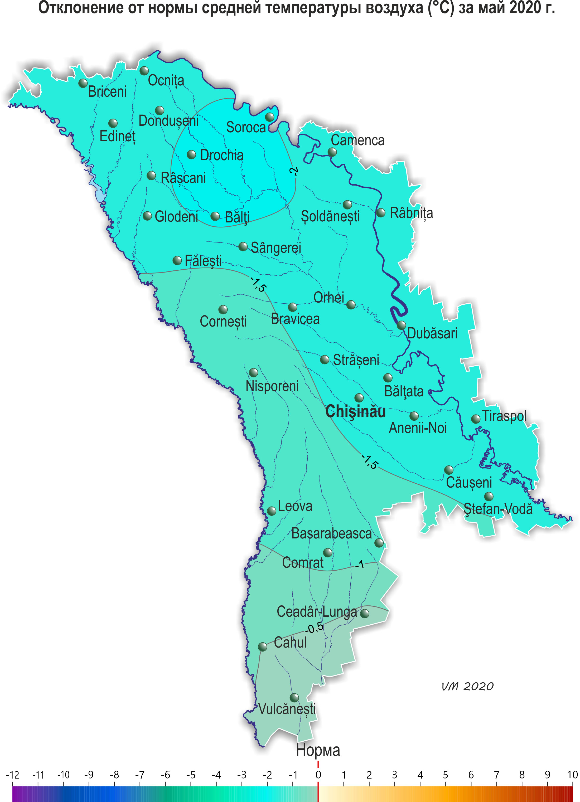В течение мая наблюдалась неоднородная по температурному режиму c осадками погода. Средняя за месяц температура воздуха была ниже нормы на 0,5-2,0ºC и составляла +12,8..+15,5ºС. Максимальная температура воздуха в мае повышалась по территории до +31ºС (МС Каменка, Фэлешть, Чадыр-Лунга, Кахул). Число дней с максимальной температурой воздуха +25ºС и выше за месяц составило по территории в основном 3-8 дней при норме 6-11 дней. Минимальная температура воздуха понижалась до 0ºС (МС Бричень, Каменка, Кодрий). 9 мая местами, преимущественно в северных районах, наблюдались заморозки на поверхности почвы и на высоте 2 см от поверхности почвы интенсивностью -1..-2ºС. 13 мая также местами в северной половине республики, отмечались заморозки на поверхности почвы и на высоте 2 см от поверхности почвы интенсивностью до -3..-4ºС. Осадки в течение месяца выпадали по территории республики неравномерно. Сумма осадков за месяц составила в основном 45-80 мм (80-165% месячной нормы), в отдельных пунктах их количество за месяц достигало 90-140 мм (185-290% месячной нормы). 28 мая на МС Штефан-Водэ и АМП Анений Ной наблюдалось стихийное метеорологическое явление в виде сильного дождя: за 12 ч выпало 62 и 67 мм осадков. Погодные условия в мае были в основном удовлетворительными для роста и развития сельскохозяйственных культур на большей части территории республики. Прошедшие в течение месяца дожди пополнили запасы влаги в почве, что улучшило условия для роста и развития сельскохозяйственных культур. Во многих районах южной половины республики, из-за дефицита осадков, отмечавшегося большую часть месяца, сложились неблагоприятные условия для роста и развития озимых и пропашных культур. У озимых культур в течение мая отмечались фазы: появление нижнего стеблевого узла соломины, колошение и цветение, к концу месяца на отдельных посевах - молочная спелость. Высота растений равнялась в основном 35-55 см, местами 60-70 см. По состоянию на 28 мая запасы продуктивной влаги в почве под озимыми культурами на 60% территории в полуметровом слое почвы составляли 30-60 мм (70-115% нормы), на остальной территории, преимущественно в южной половине – 5-25 мм (15-50% нормы). В метровом слое почвы запасы продуктивной влаги составляли в основном 30-75 мм (40-70% нормы), местами преимущественно в северных районах – 80-150 мм (85-140% нормы). На посевах ярового ячменя в первой половине месяца отмечалось кущение и выход в трубку, во второй половине - колошение. У гороха отмечалось в основном образование соцветий и цветение, в конце месяца началось формирование бобов. У сахарной свеклы продолжалось развитие очередных листьев, к концу мая отмечалось появление пятого настоящего листа. У кукурузы в начале месяца отмечалось прорастание зерна и всходы, во второй половине месяца началось листообразование. К концу месяца у кукурузы сформировался пятый и седьмой лист, местами – 9-й лист, на более поздних посевах – третий лист. Высота растений равнялась в основном 15-25 см, местами 35-40 см. По состоянию на 28 мая запасы продуктивной влаги под кукурузой в пахотном слое почвы составляли в основном 25-40 мм (80-125% нормы), местами – 15-20 мм (50-70% нормы), в метровом слое почвы в основном – 60-70 мм (45-60% нормы), местами – 115-145 мм (75-105% нормы). У подсолнечника в начале мая отмечалось формирование 2-ой пары настоящих листьев, на поздних посевах отмечались всходы. В течение месяца 