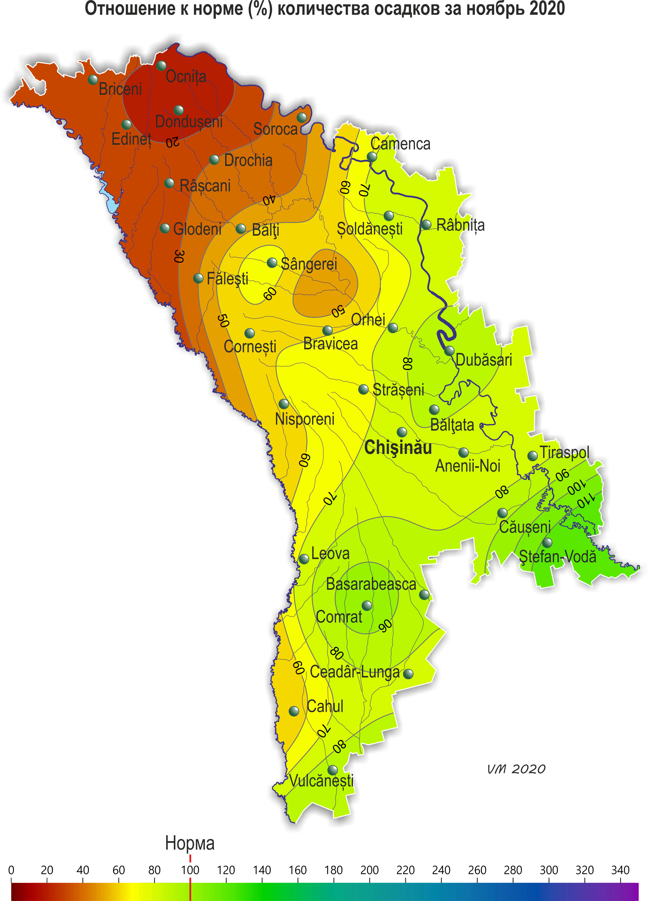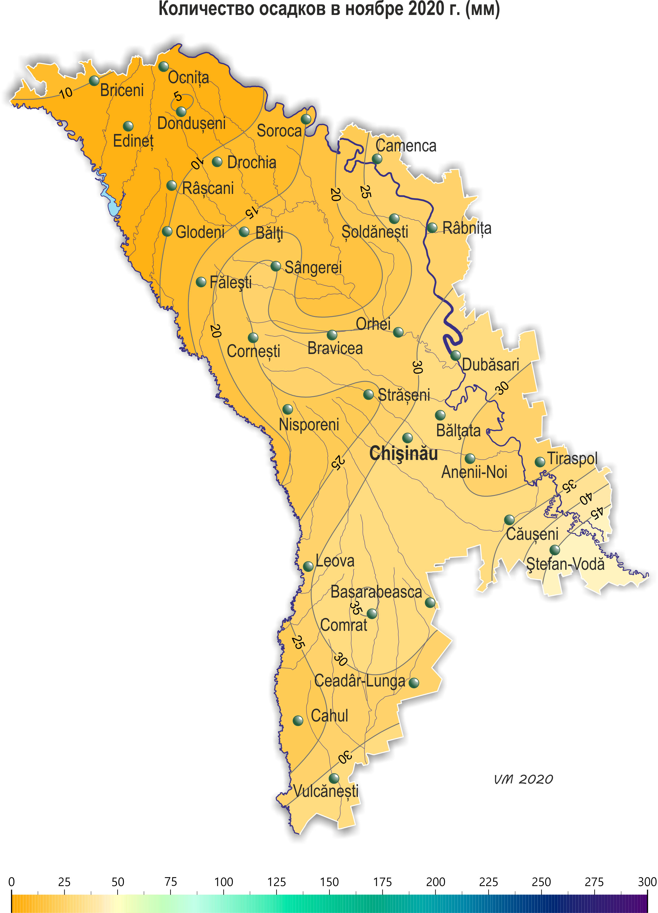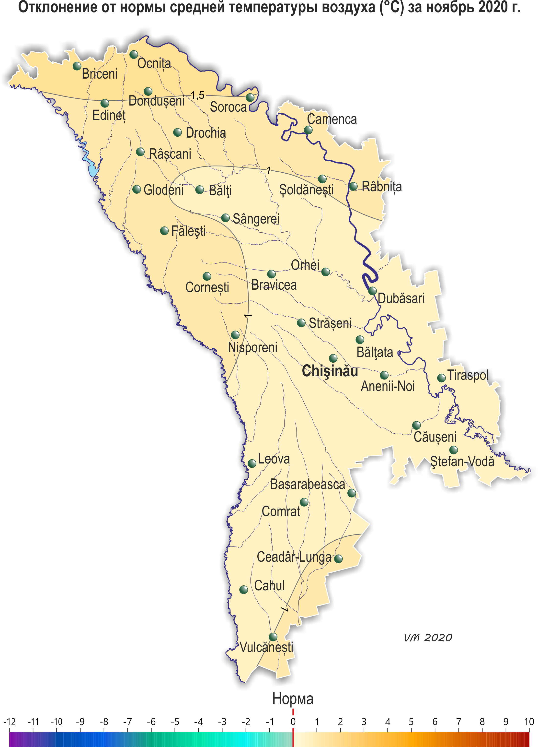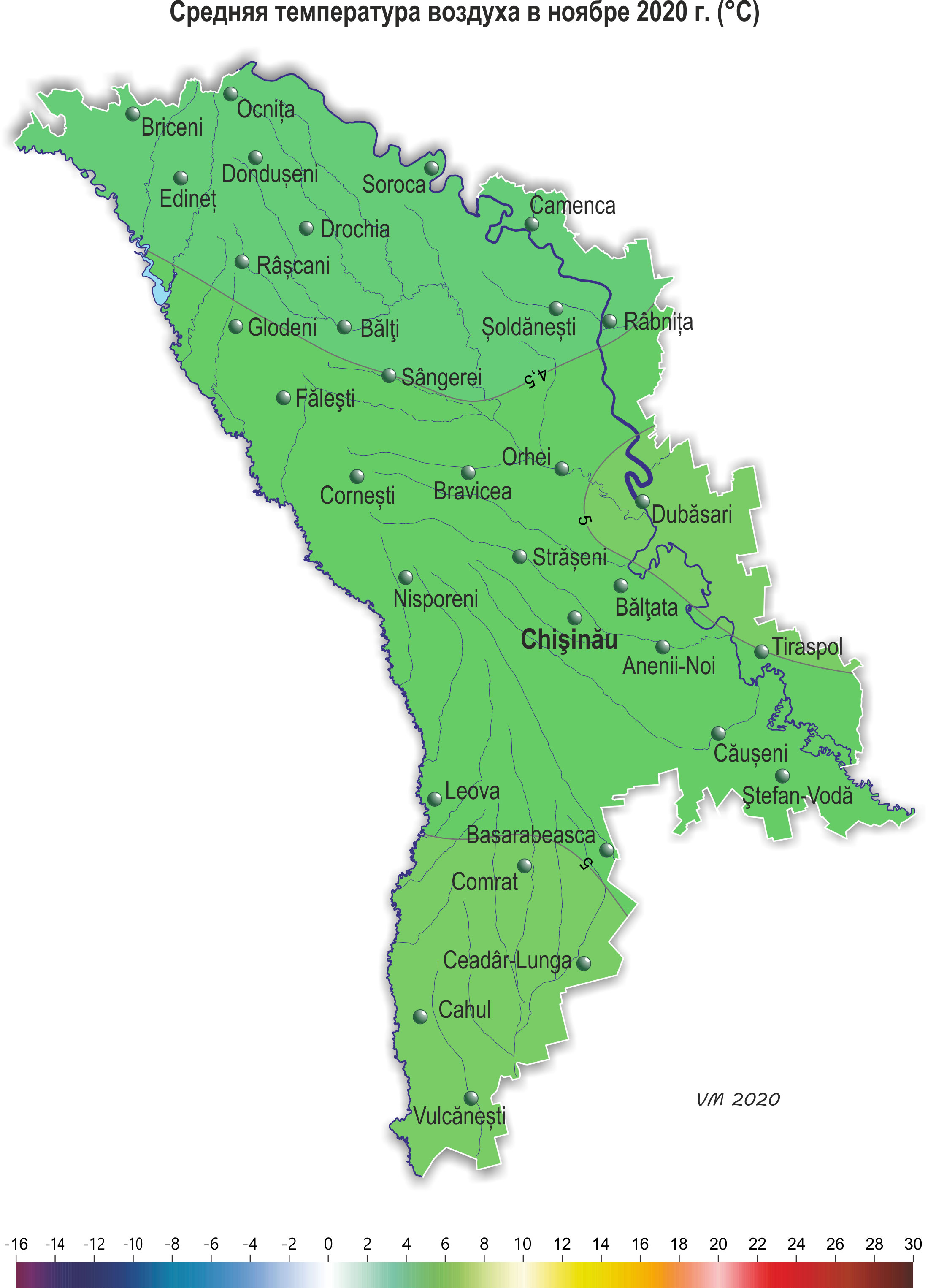 В ноябре на территории республики наблюдалась неоднородная по температурному режиму с недобором осадков погода. Средняя за месяц температура воздуха была выше нормы на 0,7-1,7ºС и составляла +4,0..+5,5ºС. Максимальная температура воздуха повышалась до +16ºС (метеорологические станции Бравича, Чадыр-Лунга). Минимальная температура воздуха понижалась до -6ºС (метеорологическая станция Бравича,). Осадки в ноябре выпадали преимущественно в виде дождя, в конце месяца - в виде мокрого снега и снега. Сумма осадков составила на 55% территории 5-25 мм (15-65% нормы), на остальной территории - 28-45 мм (75-115% нормы). Количество осадков за ноябрь по регионам составило: в северных районах в основном 5-25 мм (15-20% нормы), местами - 27-28 мм (70-75% нормы), в центральных районах в основном 29-33 мм (75-85% нормы), местами- 23-26 мм (55-60% нормы), в южных районах в основном 28-45 мм (75-115% нормы), местами- 20-25 мм (55-60% нормы). Первый снежный покров отмечался 29-30 ноября в отдельных центральных и южных районах республики, его высота на метеорологических площадках не превысила 2 см (метеорологическая станция Комрат). Погодные условия в ноябре были в основном благоприятными для роста, развития озимых культур и завершения вегетации многолетних насаждений. В первой декаде ноября у озимой пшеницы на большей части посевов отмечались всходы и 3-й лист, местами – кущение. К концу второй декады ноября из-за пониженного температурного режима отмечалась слабая вегетация озимых культур лишь в дневные часы. 25-27 ноября из-за понижения средней суточной температуры воздуха до +3ºС и ниже вегетация озимых культур прекратилась, в сроки близкие к обычным. К моменту прекращения вегетации озимые культуры находились в основном фазах: третий лист (45% посевов) и кущение (40% посевов), местами – всходы (15% посевов). Высота растений в зависимости от фазы развития колебалась от 10 до 25 см. Число растений на 1м2 составляло в основном 320-695. На раскустившихся растениях сформировалось в среднем 1-3 стебля. По состоянию на 28 ноября запасы продуктивной влаги под озимыми культурами в пахотном слое почвы составляли: в северных районах 25-40 мм (80-155% нормы); в центральных 25-40 мм (90-140% нормы); в южных в основном 25-35 мм (85-125% нормы), местами - 15-20 мм (60-70% нормы). Запасы продуктивной влаги в метровом слое почвы составляли: в северных районах в основном 95-150 мм (90-120% нормы), местами – 45-80 мм (45-70% нормы); в центральных районах в основном 85-145 мм (70-130% нормы), местами – 65-70 мм (45-70% нормы); в южных районах в основном 70-105 мм (70-100% нормы), местами - 30-50 мм (30-45% нормы). Снежный покров на полях с озимыми культурами отмечался местами в конце месяца в южной половине республики, его высота составляла 1-3 см. У плодовых культур и винограда в начале ноября завершался листопад. Условия для вызревания древесины многолетних насаждений и лозы винограда были в основном удовлетворительными. Из-за понижения средней суточной температуры воздуха до +5ºС и ниже 17-18 ноября вегетация плодовых культур и винограда прекратилась, что на 5-10 дней позже обычных сроков. По состоянию на 28 ноября запасы продуктивной влаги под многолетними насаждениями в метровом слое почвы составляли: в северных районах 95-120 мм (85-105% нормы); в центральных районах 60-115 мм (75-105% нормы); в южных районах в основном 85-95 мм (80-100% нормы), местами - 45-55 мм (50-55% нормы).