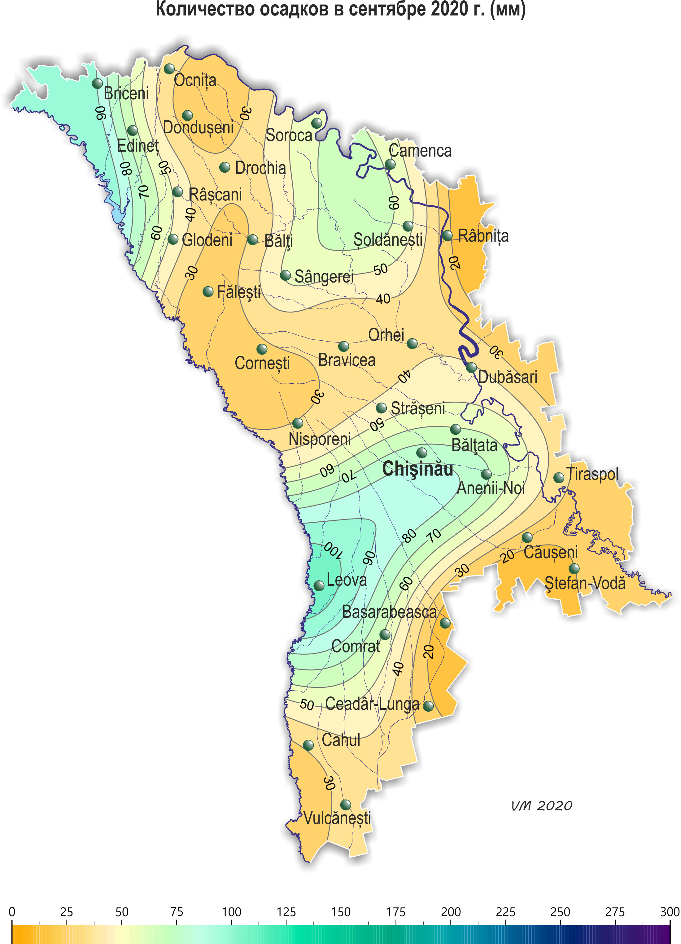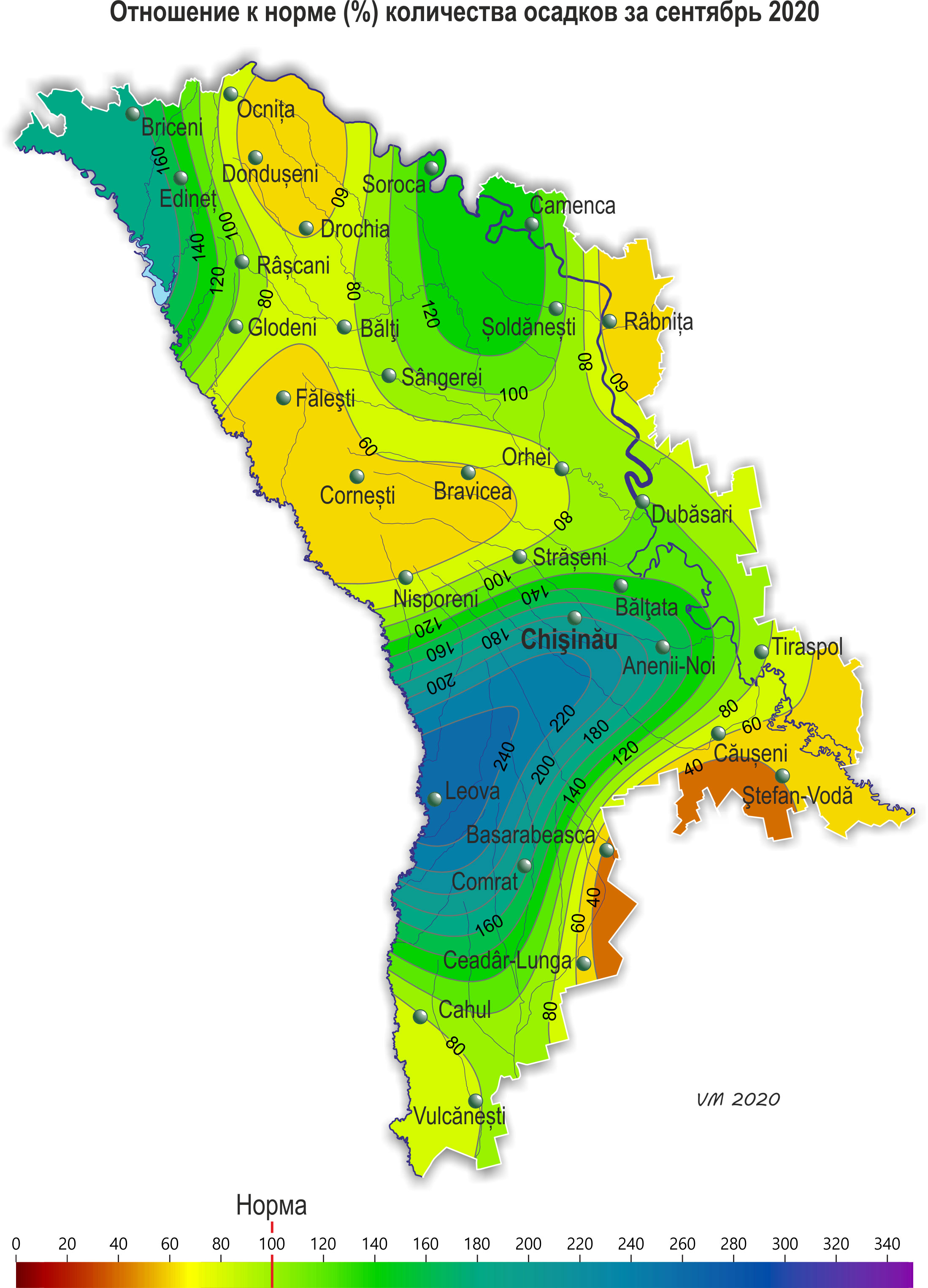 В сентябре на территории республики наблюдалась аномально теплая погода. Средняя за месяц температура воздуха была на 3,5-5,5ºС выше нормы и составляла +18..+21ºС, что отмечается в среднем один раз в 25-30 лет. Максимальная температура воздуха повышалась до +36ºС (метеорологические станции Фэлешть, Бравича, Дубэсарь, Чадыр-Лунга), что по территории отмечается в среднем один раз в 20-30 лет. Число дней с максимальной температурой воздуха ≥ 30ºС составило по территории 3-10 (при норме за месяц 1-2 дня). Минимальная температура воздуха понижалась до +3ºС (метеорологическая станция Бэлцата). Сумма осадков за месяц на 70% территории составила 35-75 мм (70-180% нормы). Наибольшее количество осадков за месяц выпало в районе метеорологической станции Леова – 106 мм (260% нормы). На остальной территории их сумма равнялось 10-30 мм (35-60% нормы). В конце месяца наблюдались стихийные метеорологические явления в виде сильных дождей: – 27 сентября на гидрологическом посту Ширеуць (Бричанский р-н) за 12 час выпало 76 мм осадков; – 29 сентября на гидрологическом посту Костешть (Рышканский р-н) за 12 ч выпало 88 мм, на ГП Браниште (Рышканский р-н) – 72 мм; – 29 сентября на метеорологической станции Леова за 1 ч выпало 51 мм, за 4 ч – 91 мм. Прошедшие в конце месяца сильные дожди, местами вызвали значительные повреждения частных домовладений и народнохозяйственных объектов. Из-за засушливой погоды и низких запасов влаги в почве или местами их отсутствия, сохранявшихся большую часть месяца, отмечались неблагоприятные условия для подготовки почвы и проведения сева озимых культур. Погодные условия были в основном удовлетворительными для созревания плодовых культур и накопления сахаров у винограда. Прошедшие в конце месяца дожди пополнили запасы влаги в почве и улучшили условия для подготовки почвы и проведение сева озимых культур на большей части территории страны. В течение месяца в хозяйствах республики проводили уборку урожая подсолнечника, кукурузы, сахарной свеклы, овощных, плодовых культур и винограда. По состоянию на 28 сентября запасы продуктивной влаги под многолетними насаждениями в метровом слое не превышали 15-65 мм (20-70% нормы).