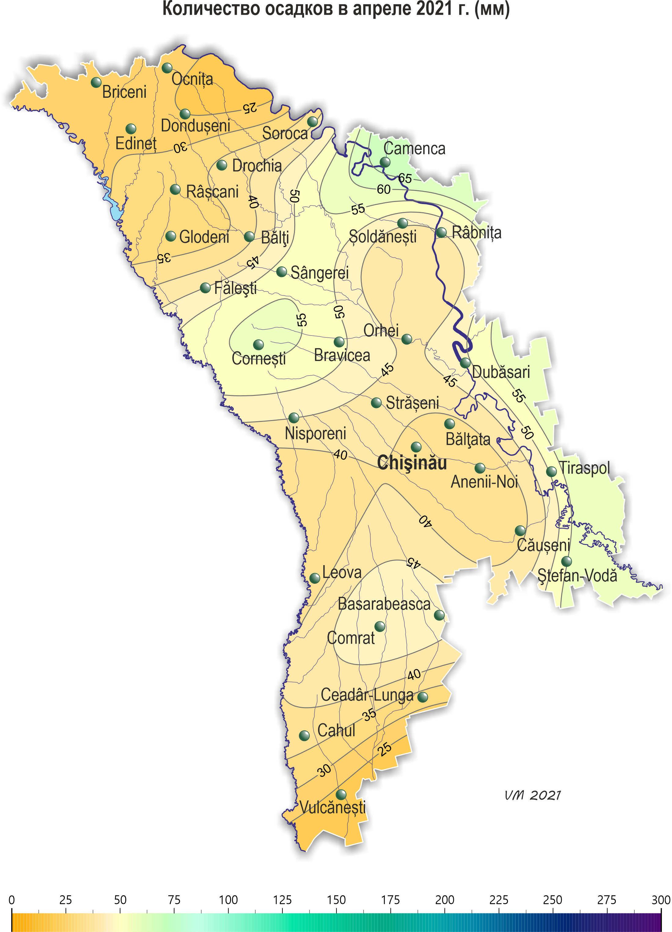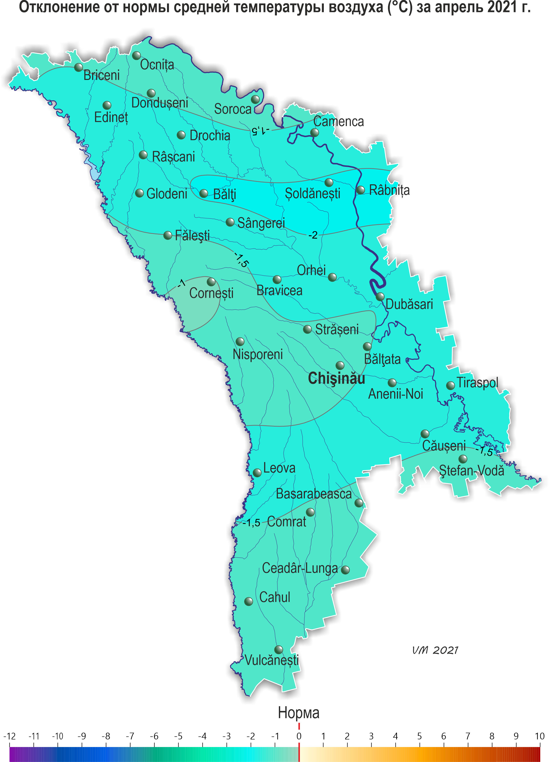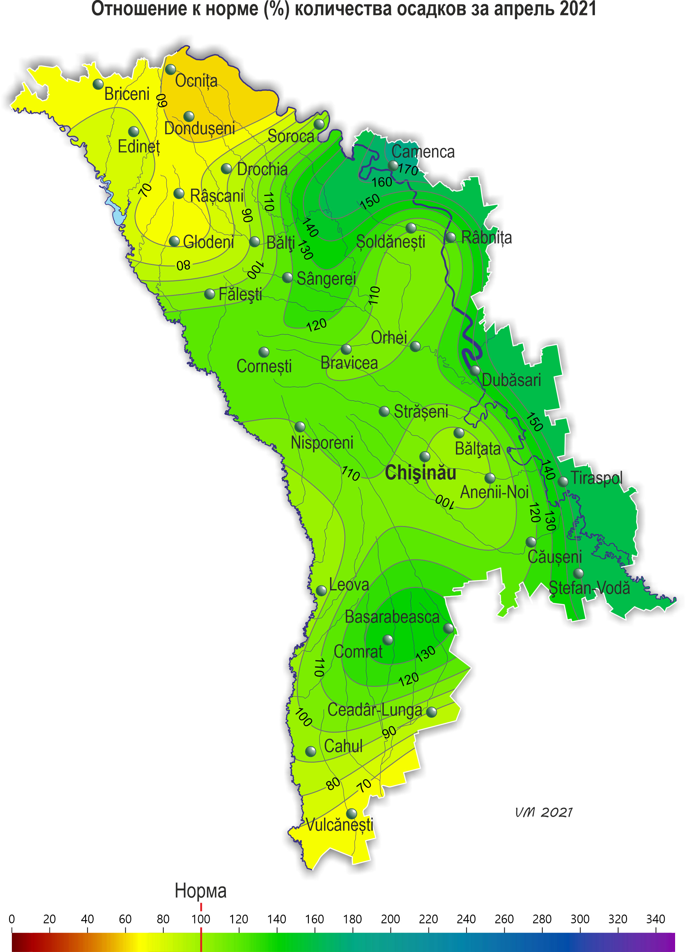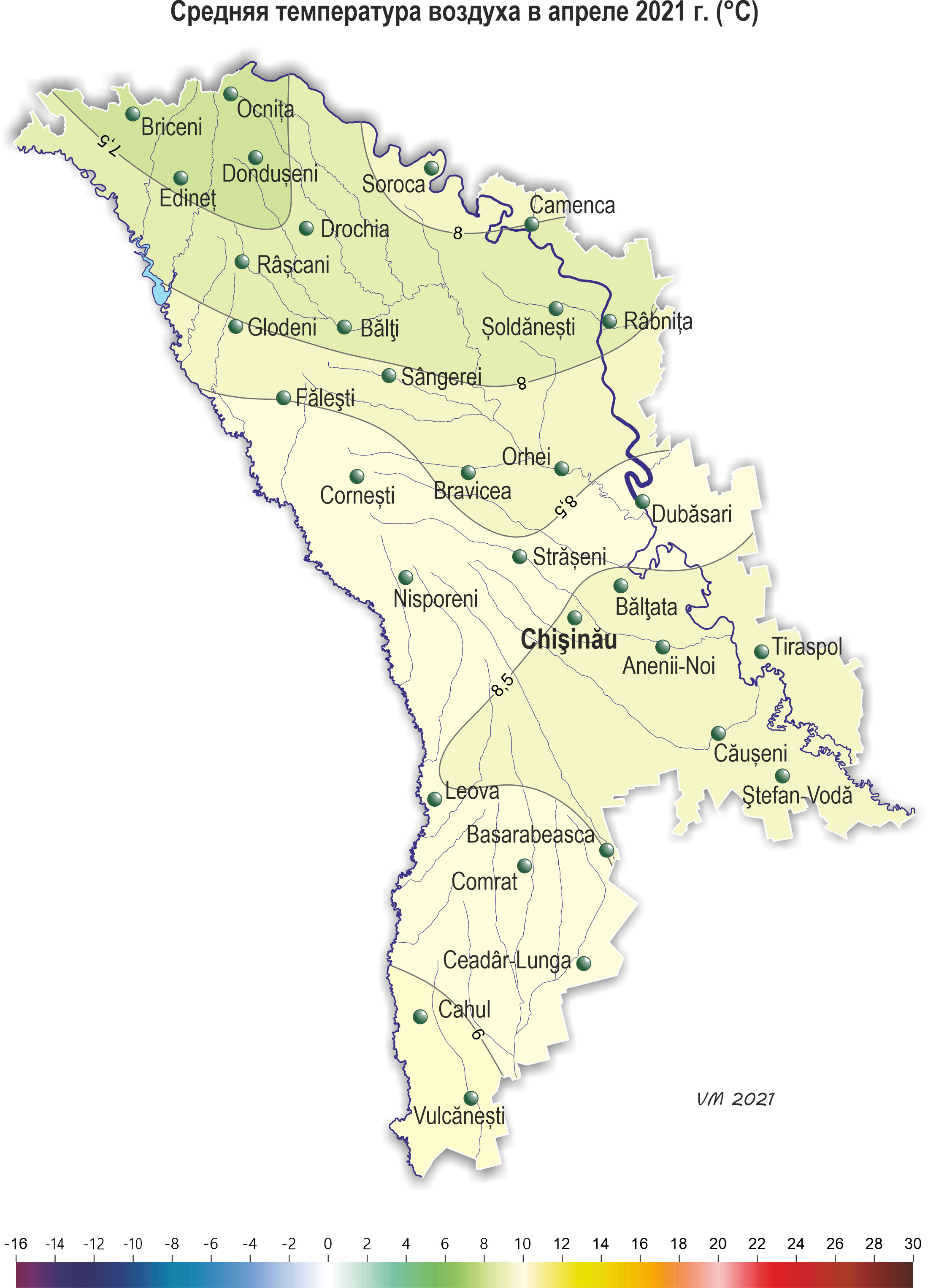 В течение апреля на территории республики наблюдалась холоднее обычного с осадками погода. Средняя за месяц температура воздуха была ниже нормы на 1-2ºС и составляла +7,5..+9,0ºС. Максимальная температура воздуха повышалась до +25ºС (метеорологическая станция Каменка). Заморозки в воздухе отмечались: – в период 11-12 и 17 апреля интенсивностью в основном -1..-2ºС, что в этот период возможно в среднем один раз в 5-10 лет, в отдельных районах (11 апреля) интенсивностью -3..-4°С, что наблюдается в среднем один раз в 20 лет. - 28 апреля в северных и центральных районах республики интенсивностью до -1..-4ºС, что в этот период возможно в среднем один раз в 20-30 лет. Заморозки на поверхности почвы интенсивностью -1..-5ºС и на высоте 2 см от поверхности почвы интенсивностью -1..-8ºС отмечались на большей части территории в период 11-13 и 17-18 апреля. Заморозки на поверхности почвы и на высоте 2 см от поверхности почвы интенсивностью -1..-6ºС отмечались также 28 апреля на большей части территории, что в этот период наблюдается в среднем один раз в 5-10 лет. Сумма осадков за месяц на 80% территории составляла 35-68 мм (75-170% нормы), на остальной территории - 23-30 мм (65-70% нормы). Количество осадков по регионам составило: - в северных районах республики в основном 35-68 мм (75-170% нормы), местами -25-30 мм (50-70% нормы); - в центральных районах -37-56 мм (100-135% нормы); - в южных районах - 33-55 мм (90-150% нормы), местами (Вулкэнешть) - 23 мм (65% нормы). Погодные условия большую часть апреля были в основном благоприятными для роста и развития озимых, плодовых культур и винограда, а также для подготовки почвы и сева сельскохозяйственных культур. Заморозки в воздухе в конце месяца интенсивностью до -4ºС, отмечавшиеся местами в северных и центральных районах республики, создавали угрозу повреждения у цветущих плодовых культур и грецкого ореха. У озимых культур в первой половине месяца повсеместно продолжалось кущение, во второй половине отмечались фазы: выход в трубку и появление нижнего стеблевого узла соломины. По состоянию на 28 апреля запасы продуктивной влаги под озимыми культурами в пахотном слое почвы составляли: в северных районах – 25-45 мм (100-175% нормы); в центральных – 30-45 мм (120-170% нормы); в южных – 20-40 мм (80-160% нормы). Запасы продуктивной влаги в метровом слое почвы составляли: в северных районах – 115-200 мм (105-155% нормы); в центральных районах – 135-185 мм (115-135% нормы); в южных районах – 100-160 мм (90-125% нормы). К концу апреля на посевах ярового ячменя отмечалось кущение, у гороха - третий настоящий лист. У сахарной свеклы и подсолнечника на ранних посевах появились всходы. По состоянию на 28 апреля запасы продуктивной влаги под подсолнечником в пахотном слое почвы составляли: в северных районах – 25-40 мм (90-140% нормы); в центральных – 30-35 мм (95-100% нормы); в южных – 25-35 мм (75-110% нормы). Запасы продуктивной влаги в метровом слое почвы составляли: в северных районах – 125-180 мм (105-125% нормы); в центральных районах – 130-154 мм (95-110% нормы); в южных районах – 145-150 мм (95-105% нормы). У плодовых культур в начале месяца отмечалось в основном распускание почек и развертывание первых листьев, у ранних сортов абрикоса и персика, сливы, черешни – цветение. К концу месяца у плодовых культур (абрикоса, персика, черешни, сливы, вишни) закончилось цветение и началось формирование плодов, у яблони и груши продолжалось обособление бутонов, местами в южных районах началось ц