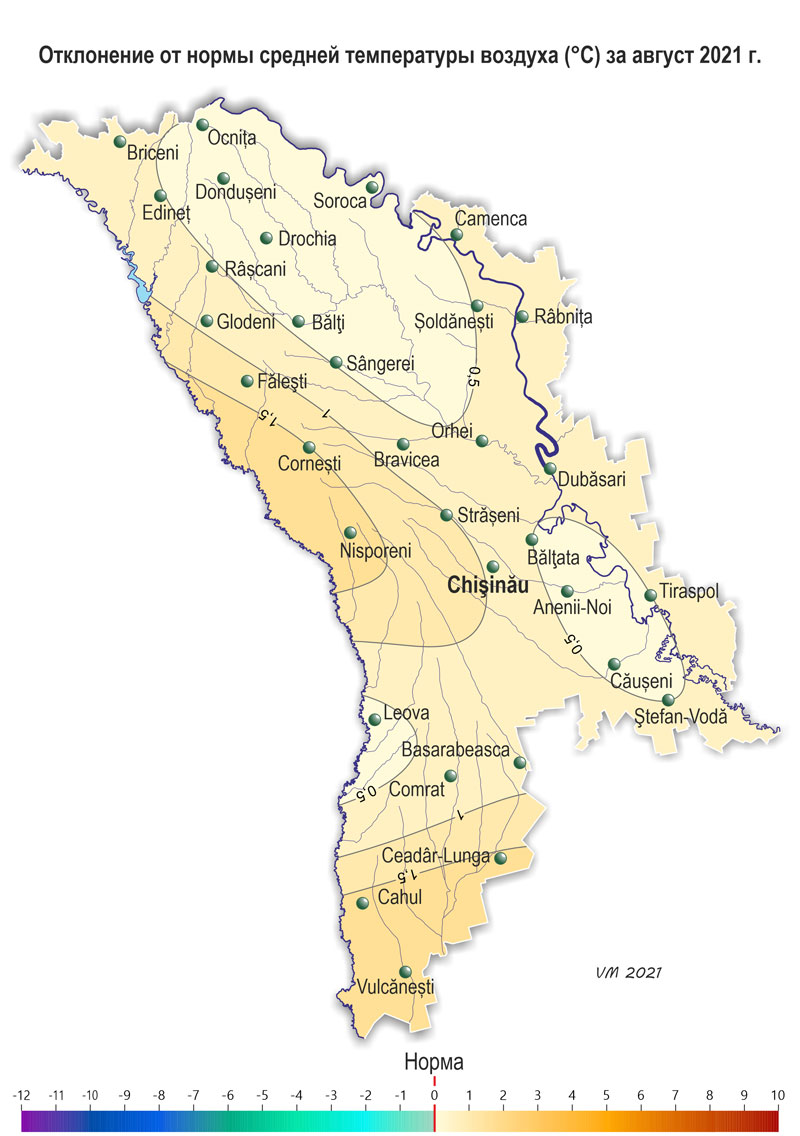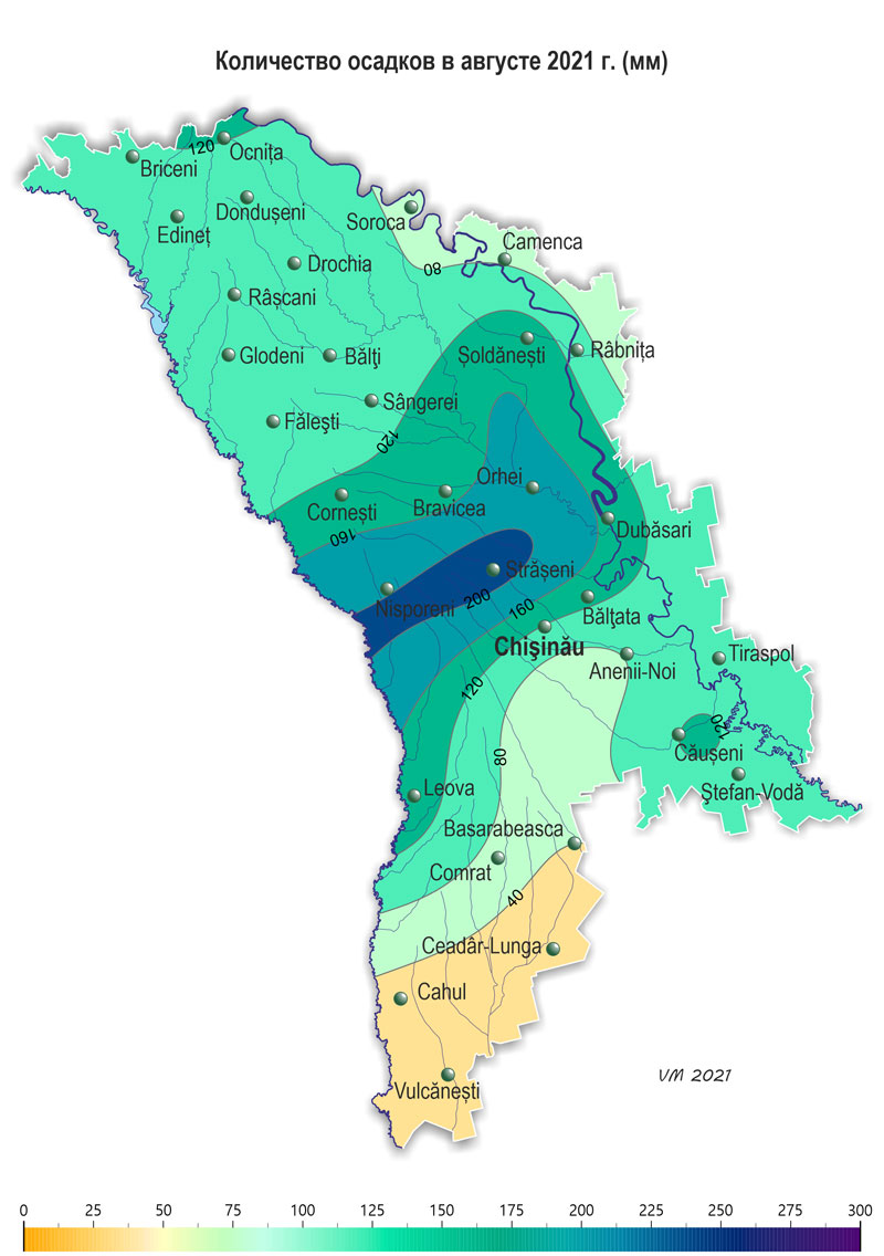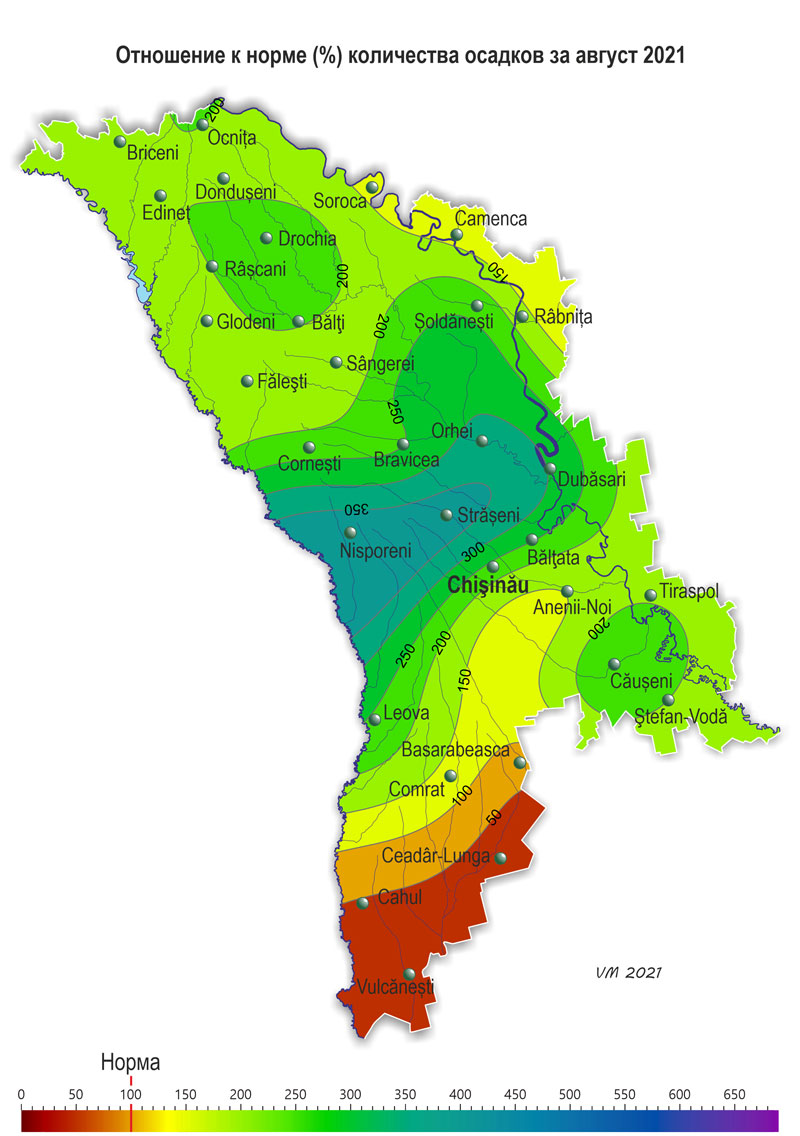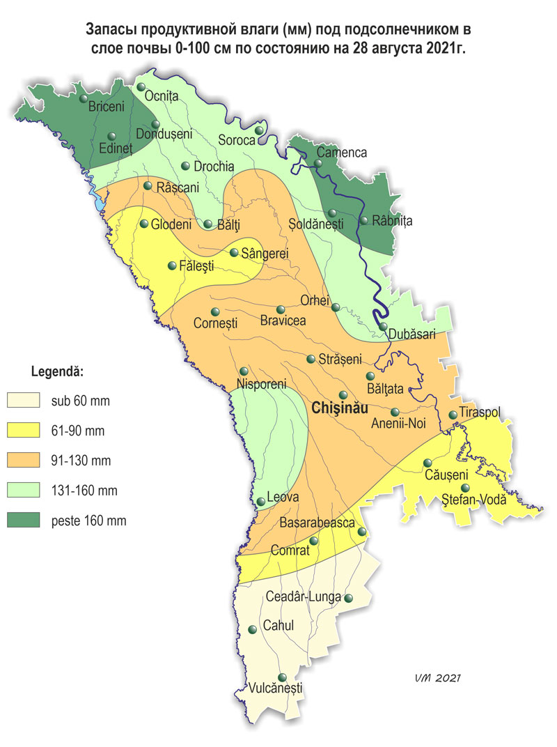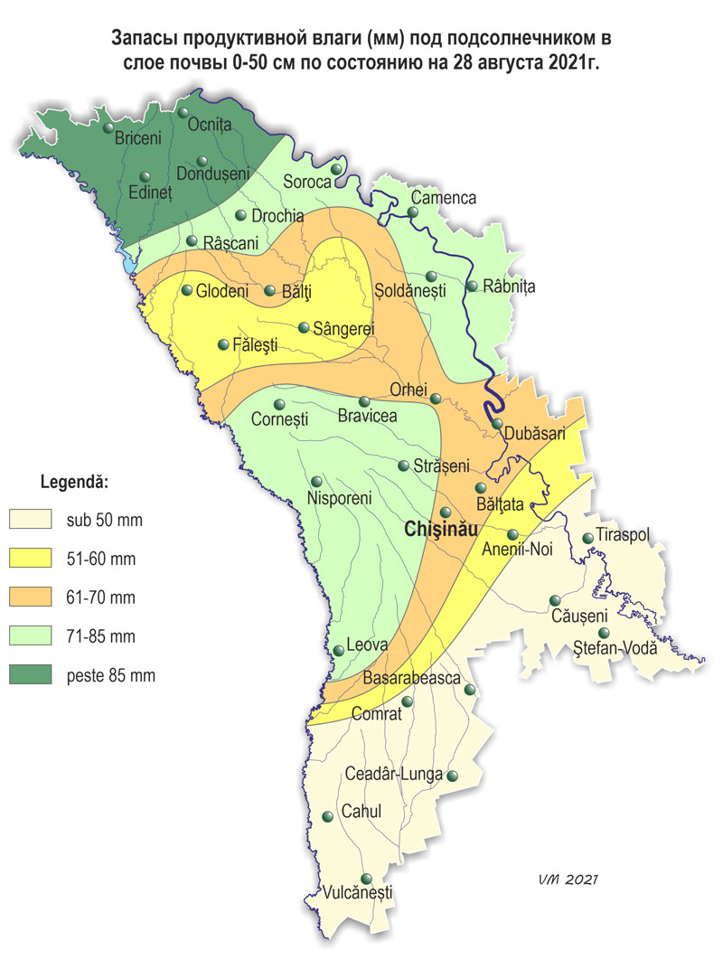 В течение августа наблюдалась неоднородная по температурному режиму с осадками погода. Средняя за месяц температура воздуха была выше нормы на 0,5-1,7ºС и составляла +19,3..+ 22,8ºС. Максимальная температура воздуха повышалась по территории до +37ºС (метеорологическая станция Чадыр-Лунга). Минимальная температура воздуха понижалась до +9ºС (метеорологическая станция Сорока). Число дней с максимальной температурой воздуха ≥30ºС составило по территории 2-12 дня (норма 3-10), число дней с температурой воздуха ≥35ºС местами в южных районах составило 1-2 дня (норма 1 день). Cумма осадков за месяц на 65% территории равнялась 105-210 мм (200-370% нормы), местами (25% территории) их количество составляло 40-95 мм (80-190% нормы). В крайних южных районах сумма осадков, отмечавшихся в августе, не превышала 10-25 мм (20-45% нормы). Количество осадков по регионам составляло: - в северных районах – в основном 70-140 мм (135-240% нормы); - в центральных районах – 80-210 мм (150-370% нормы); - в южных районах – в основном 40-140 мм (80-240% нормы), местами – 10-25 мм (20-45% нормы). 6 августа на территории республики наблюдались стихийные метеорологические явления в виде сильных ливней: на МС Кишинэу за 11 часов выпало 54 мм осадков, на МС Штефан-Водэ – 75 мм за 3 часа. Погодные условия в течение месяца были в основном благоприятными для накопления сахаров и созревания плодовых культур и винограда, а также для подготовки почвы под посев озимых культур на большей части территории страны. У кукурузы в течение августа отмечалась молочная и восковая спелость, к концу месяца на юге страны - полная спелость. По состоянию на 28 августа запасы продуктивной влаги в метровом слое почвы под кукурузой составляли: в северных районах – 75-160 мм (100-200% нормы); в центральных районах – 70-150 мм (90-210% нормы); в южных районах – в основном 50-125 мм (85-155% нормы), местами они не превышали 30-35 мм (40-50% нормы). У подсолнечника в течение месяца продолжалось созревание, к концу августа местами отмечалась уборочная спелость. По состоянию на 28 августа запасы продуктивной влаги в метровом слое почвы под подсолнечником составляли: в северных районах – в основном 105-160 мм (130-160% нормы), местами – 65-75 мм (60-70% нормы); в центральных районах – 100-110 мм (100-115% нормы); в южных районах – в основном 65-130 мм (70-120% нормы), местами – 10-30 мм (20-40% нормы). У сахарной свеклы в течение месяца отмечалось пожелтение листьев нижнего яруса и продолжался рост корнеплода. Условия для роста корня сахарной свеклы в районах ее возделывания были преимущественно хорошими. В течение августа у плодовых культур продолжался рост плодов, у сливы, персика и ранних сортов яблок – созревание и сбор урожая. У винограда продолжался рост ягод, у столовых сортов - созревание и сбор урожая. По состоянию на 28 августа запасы продуктивной влаги под многолетними насаждениями в метровом слое почвы составляли: в северных районах – 95-140 мм (90-135% нормы); в центральных районах – 85-120 мм (90-140% нормы); в южных районах – в основном 95-125 мм (100-135% нормы), местами 45-50 мм (55-60% нормы).