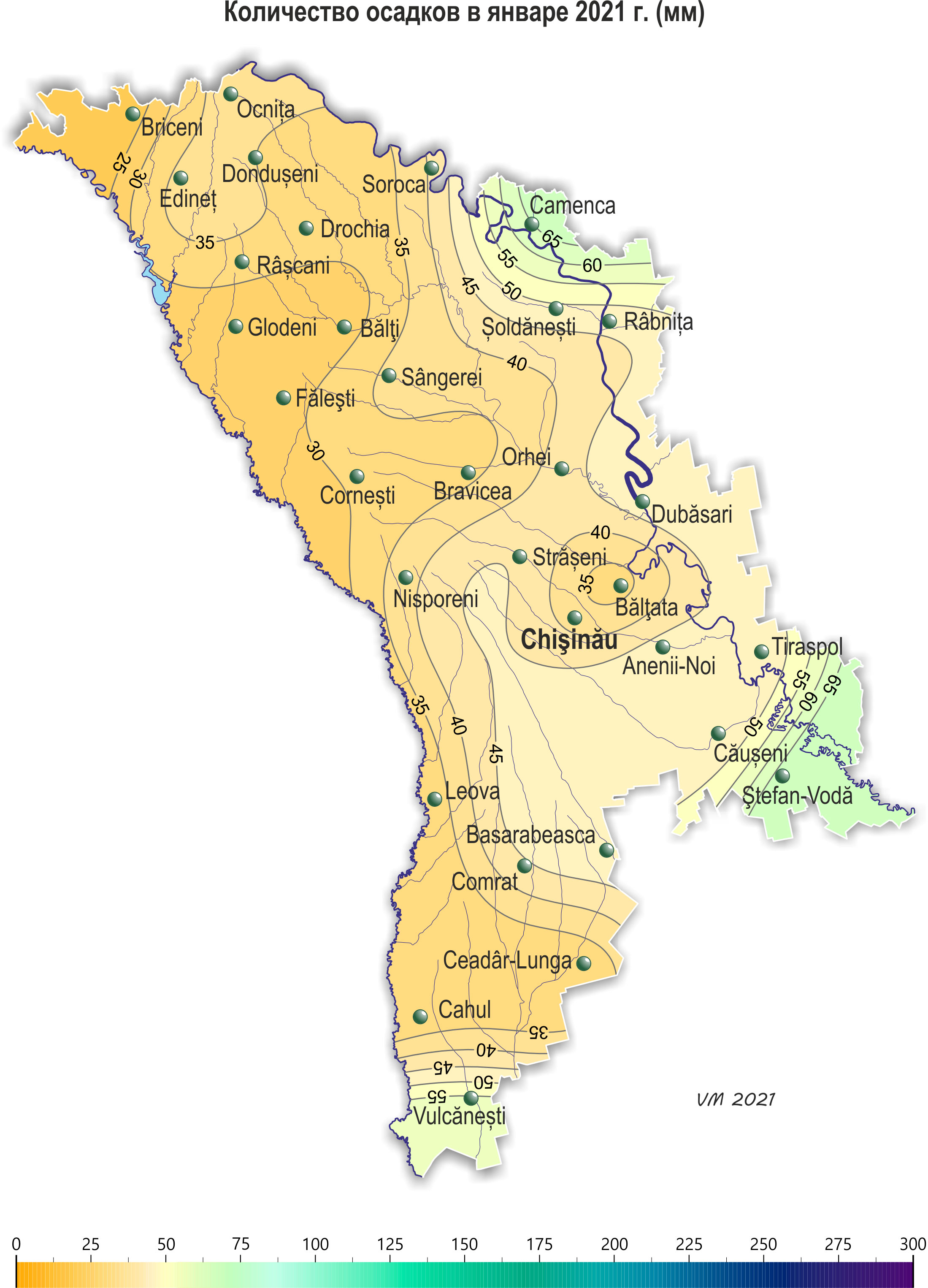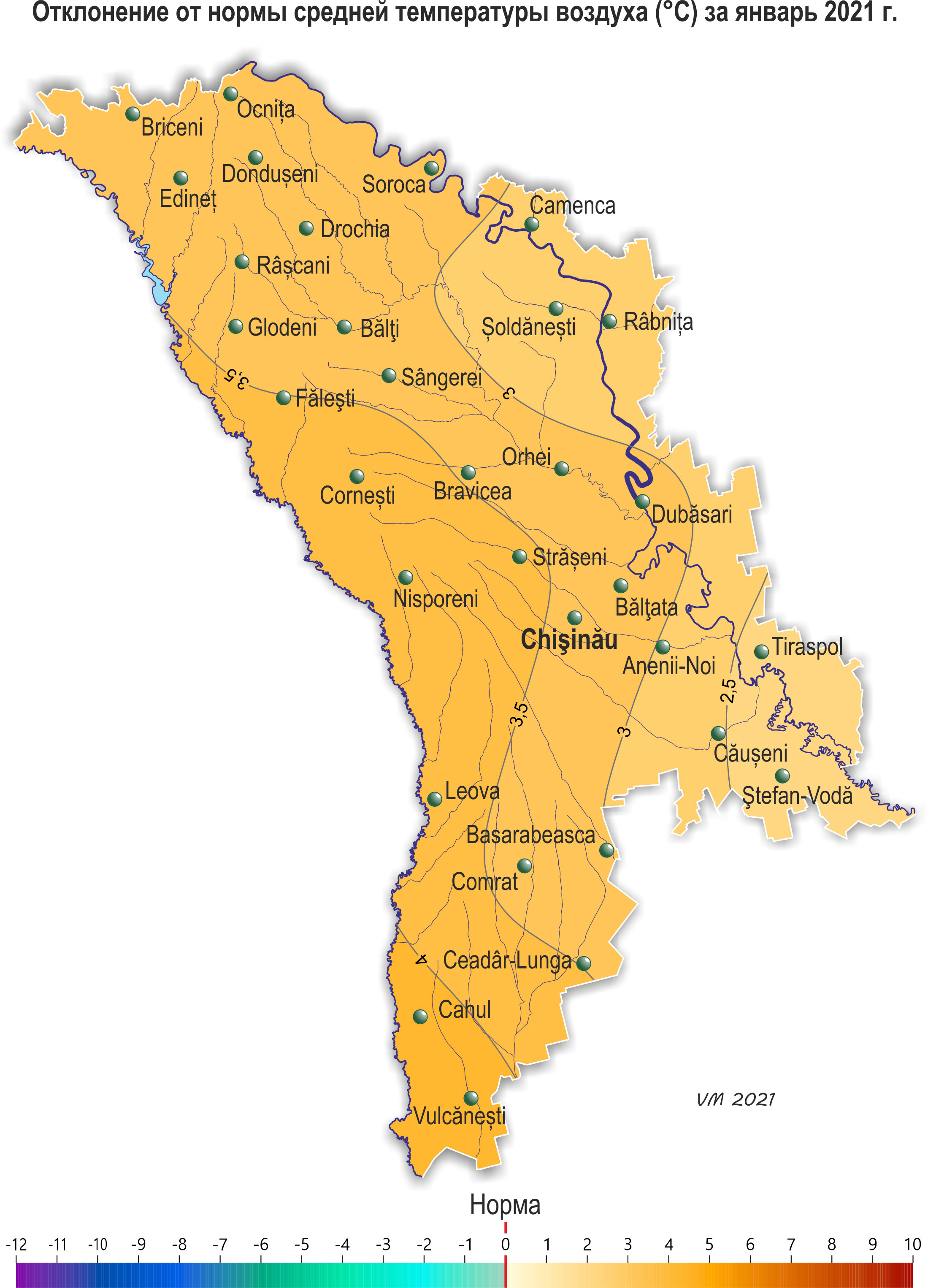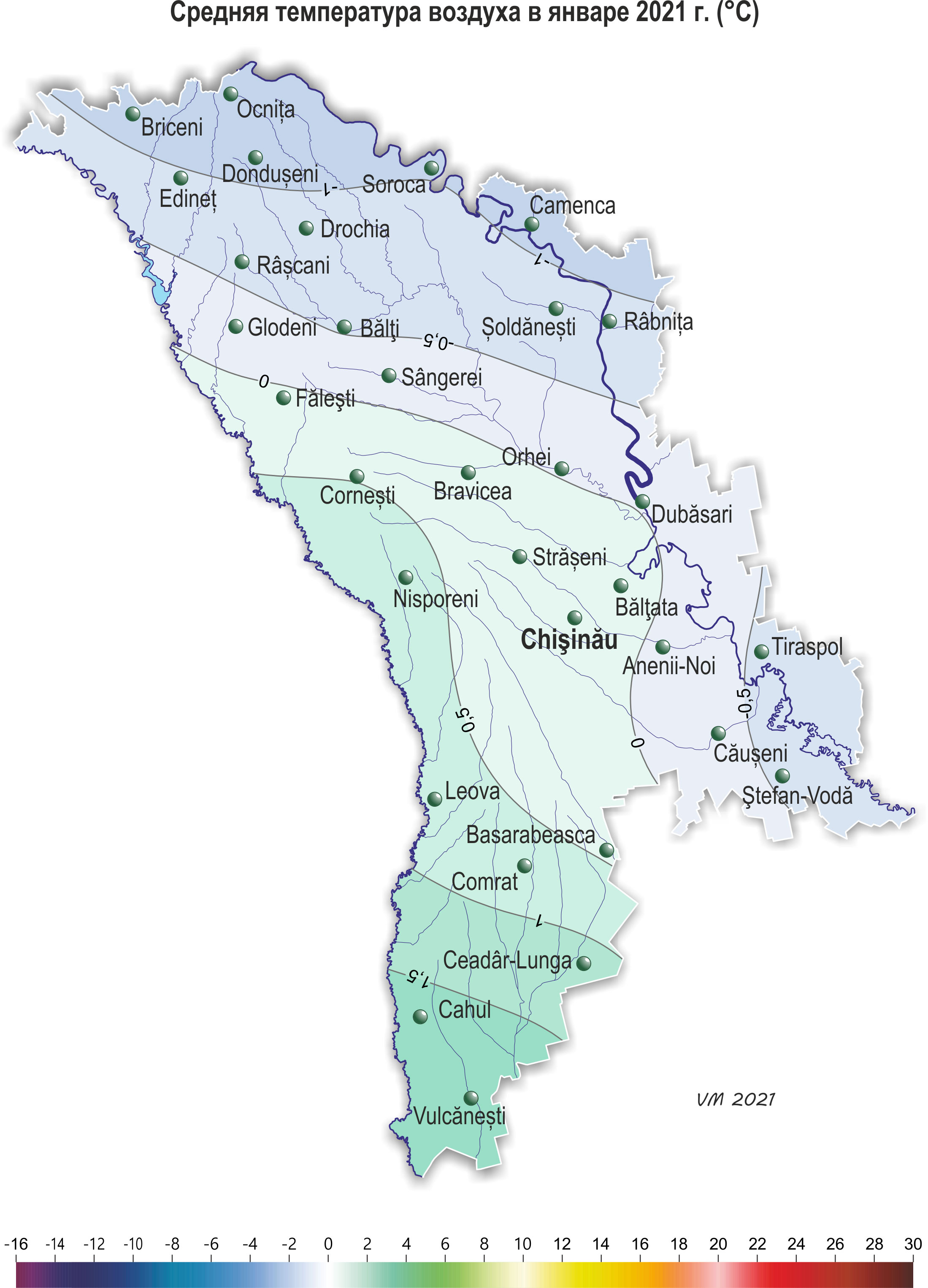 В течение января на территории республики наблюдалась неоднородная по температурному режиму, с осадками погода. Аномально теплая погода наблюдалась в первой декаде января, средняя температура воздуха за декаду составляла +1,9..+5,6ºС, что на 5,9-7,5ºС выше нормы и отмечается в среднем один раз в 10-20 лет. Средняя за месяц температура воздуха была выше нормы на 2-4ºС и составляла -1,2..+1,7ºС. Такой температурный режим в это время отмечается в среднем один раз в 3-7 лет. Максимальная температура воздуха повышалась до +14ºС (метеорологическая станция Корнешть). Минимальная температура воздуха понижалась до -21ºС (метеорологическая станция Бэлць). Осадки в течение января выпадали в виде снега, мокрого снега и дождя. Сумма их за месяц составила 22-69 мм (70-230% нормы). Количество осадков по регионам: - в северных районах республики составило 22-40 мм (70-140% нормы), местами в северо-восточных районах - 45-65 мм (165-230% нормы); - в центральных районах составило 30-48 мм (85-150% нормы); - в южных районах составило 31-69 мм (110-215% нормы). Сложные погодные условия наблюдались 27-28 января. Почти повсеместно отмечалось выпадение осадков в виде снега и мокрого снега. Высота снежного покрова на метеоплощадках составляла в основном 5-17 см, а наибольшая высота отмечалась на метеостанции Штефан-Водэ – 23 см. Усиление скорости ветра до 15-17 м/с в южной половине республики способствовало образованию заносов на дорогах, что затрудняло движения транспорта. В начале января на территории республики почва была в основном талая. В остальные дни месяца глубина промерзания почвы колебалась по территории в основном от 1 до 10 см, в середине месяца почва промерзала до 15-25 см. У озимых культур из-за повышенного температурного режима в отдельные дни первой декады января отмечалась слабая вегетация озимых культур в дневные часы. Во второй и третьей декадах января озимые культуры находились в состоянии вегетационного покоя. Снежный покров на полях с озимыми культурами отмечался в начале второй декады января на большей части территории республики. Высота его к концу декады составляла в основном 1-6 см, местами снежный покров отсутствовал. В начале третьей декады снежный покров повсеместно сошел и установился снова в конце месяца. Снежный покров в конце января отмечался преимущественно в центральных и южных районах республики, высота его на полях с озимыми культурами колебалась от 3 до 20 см. Минимальная температура почвы на глубине залегания узла кущения у озимых культур (3см) в течение месяца понижалась до -3..-7ºС, что выше критических значений (-15ºС). Многолетние насаждения в течение месяца находились в состоянии вегетационного покоя. Условия для перезимовки озимых культур и многолетних насаждений были в основном удовлетворительными.